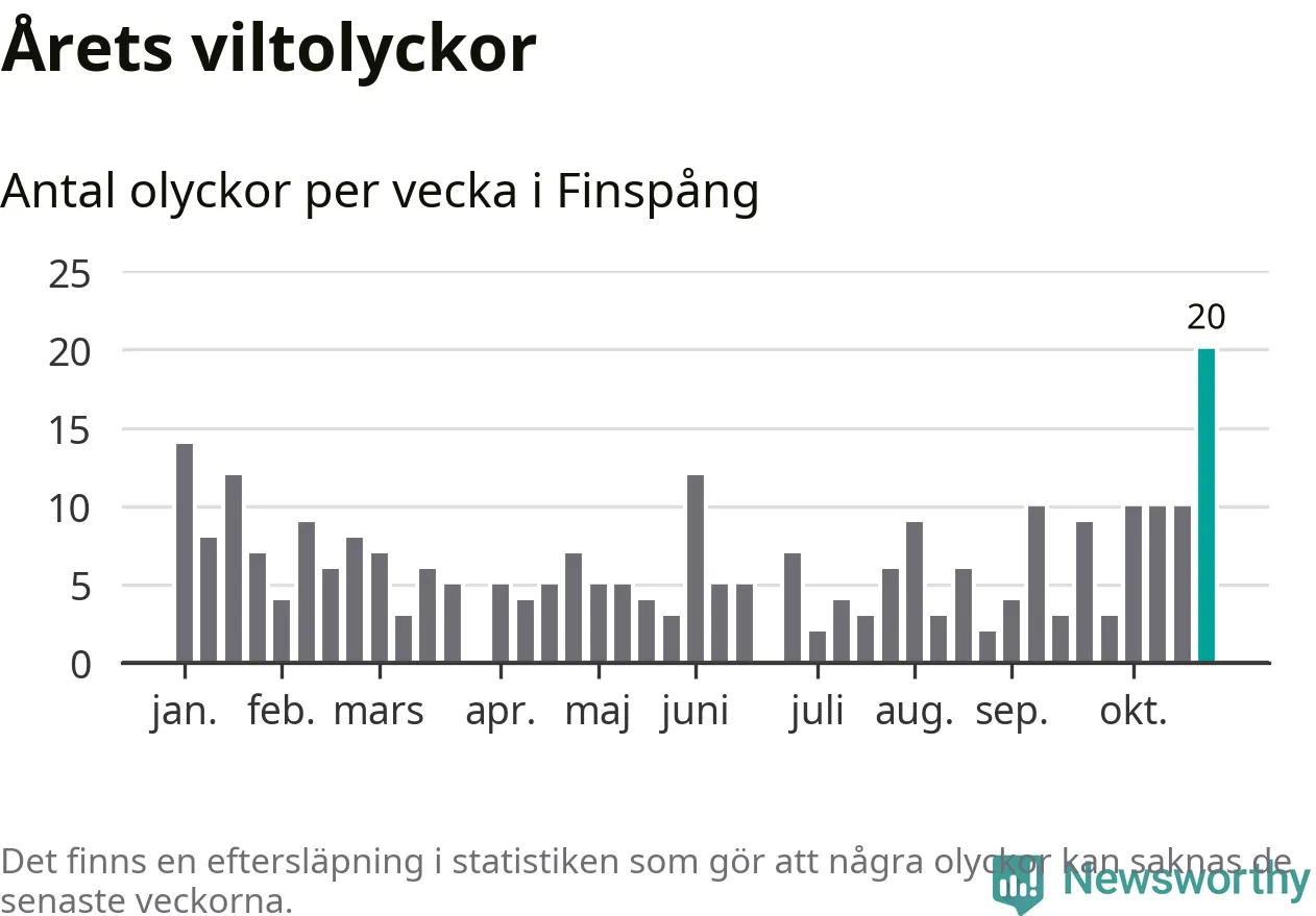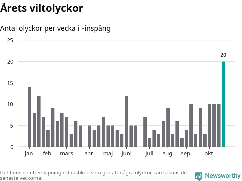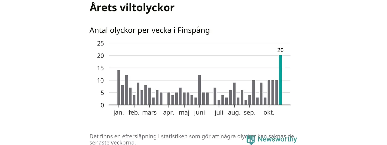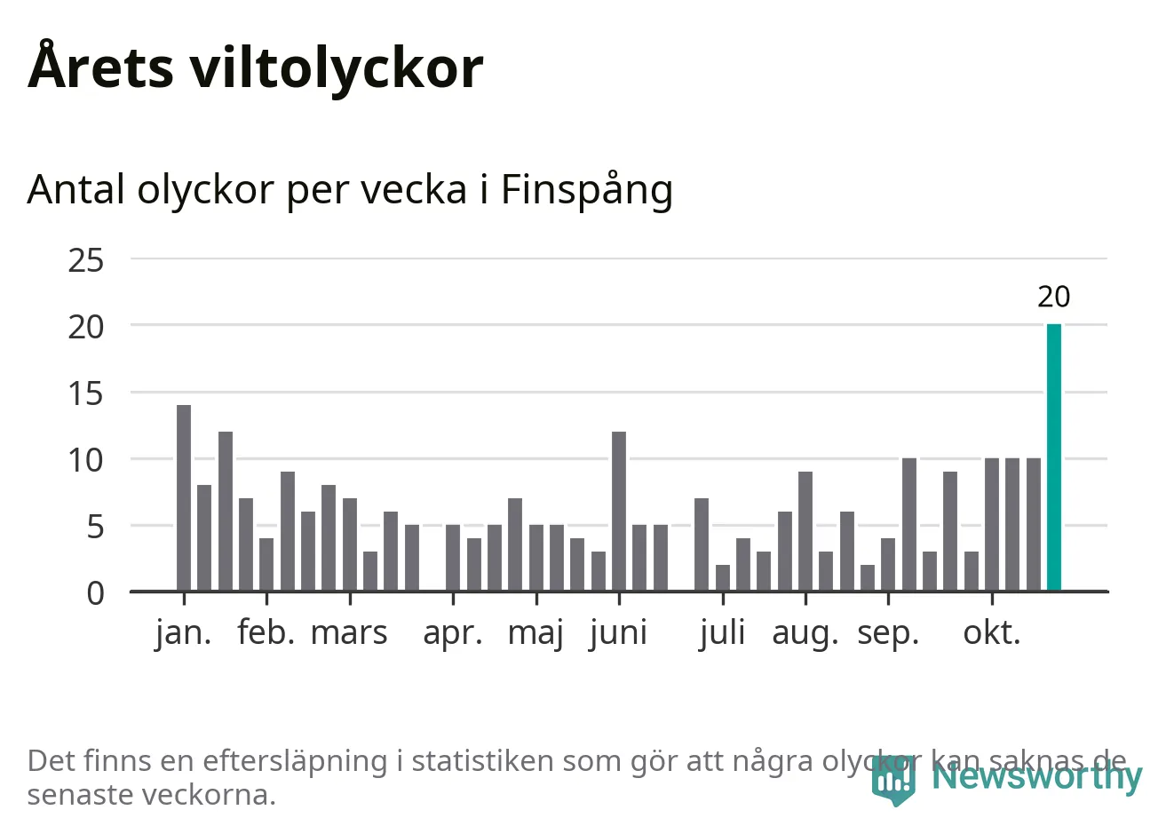 Under vecka 44 rapporterades 20 viltolyckor in i Finspångs kommun. Det är det största antalet på en enskild vecka hittills i år.