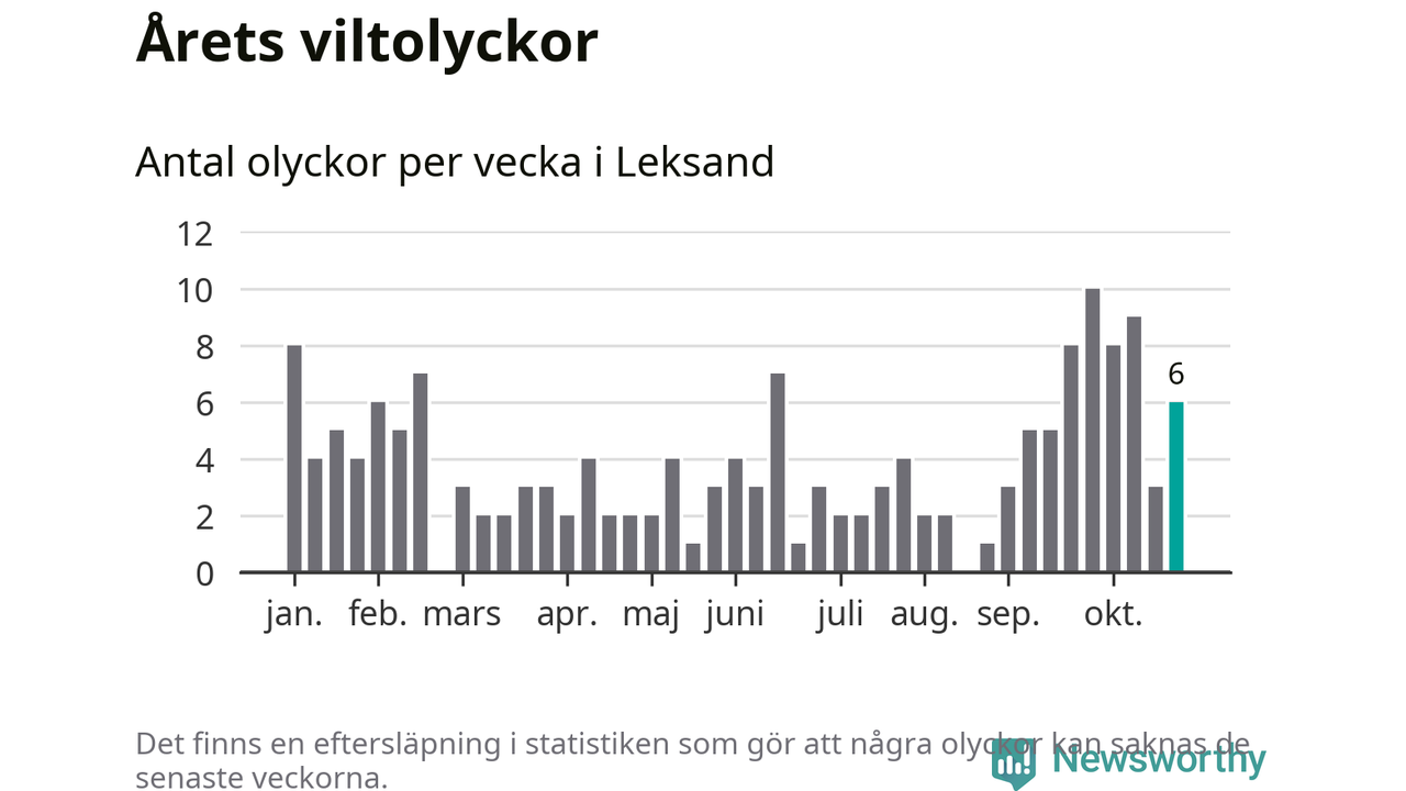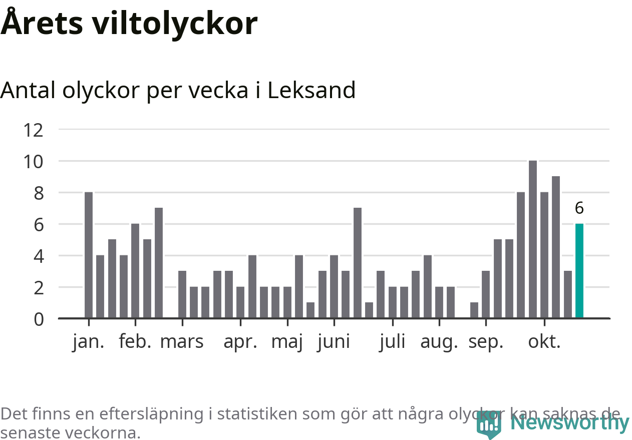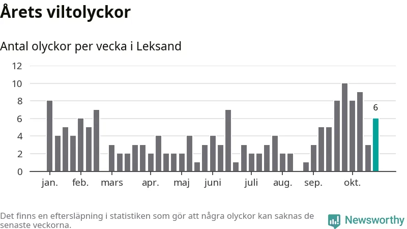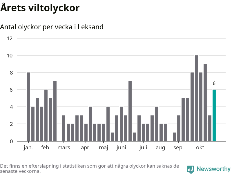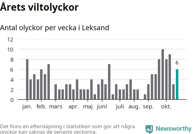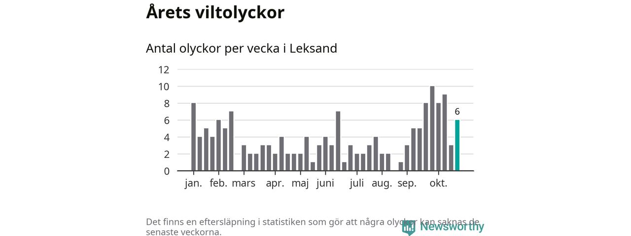 Hittills har sex viltolyckor rapporterats in i Leksands kommun från vecka 44. Se listan här.