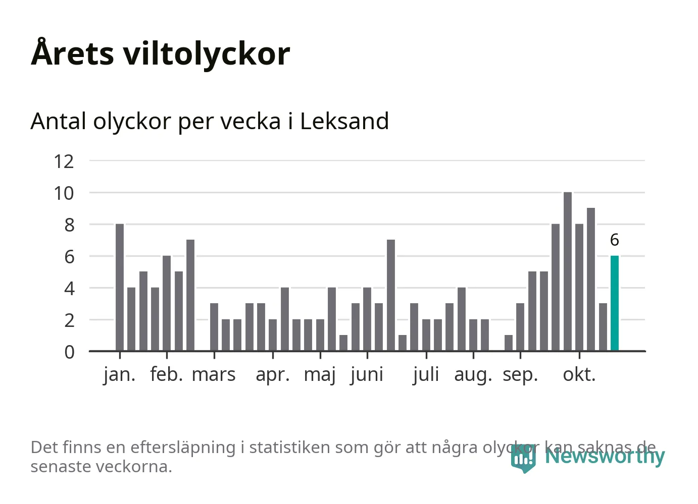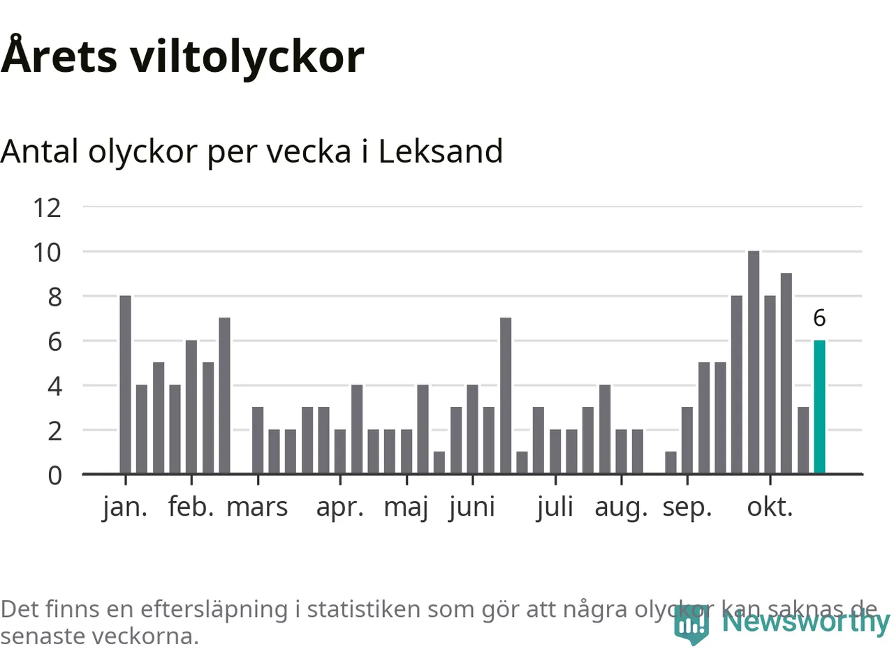 Totalt det här året har det inträffat 165 viltolyckor i kommunen. Det är mindre än genomsnittet för motsvarande period (omkring 195) de senaste tio åren.