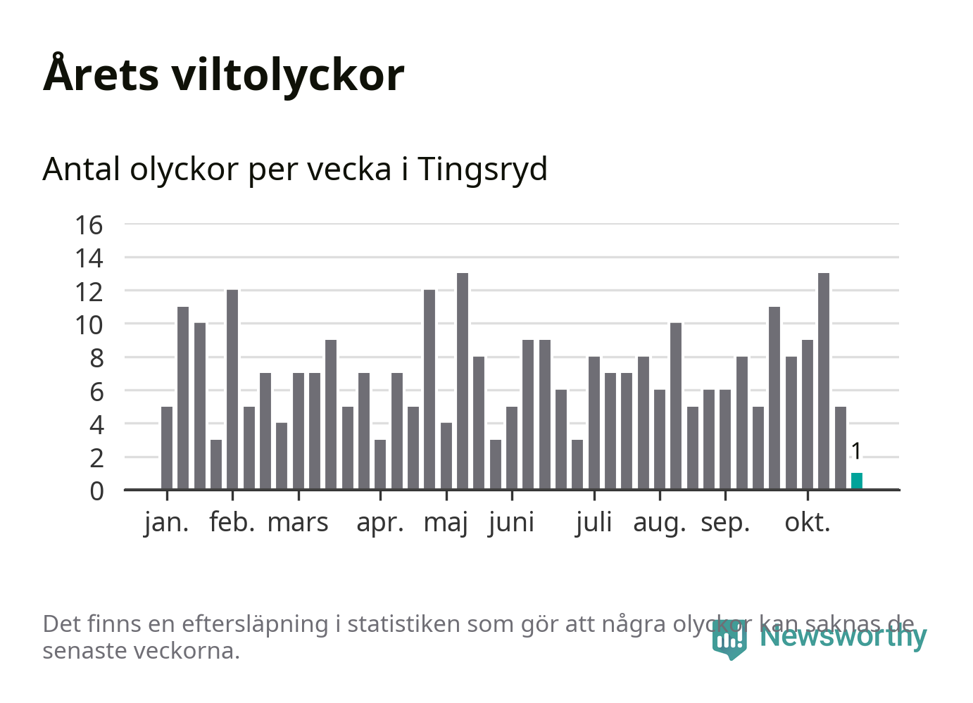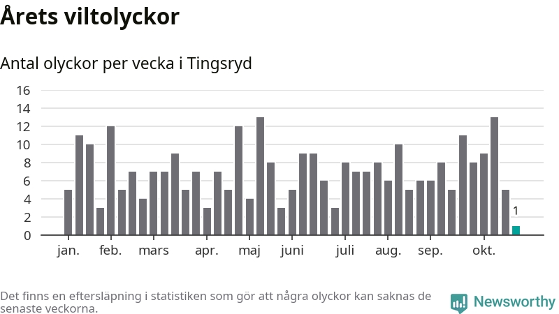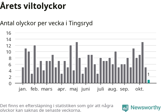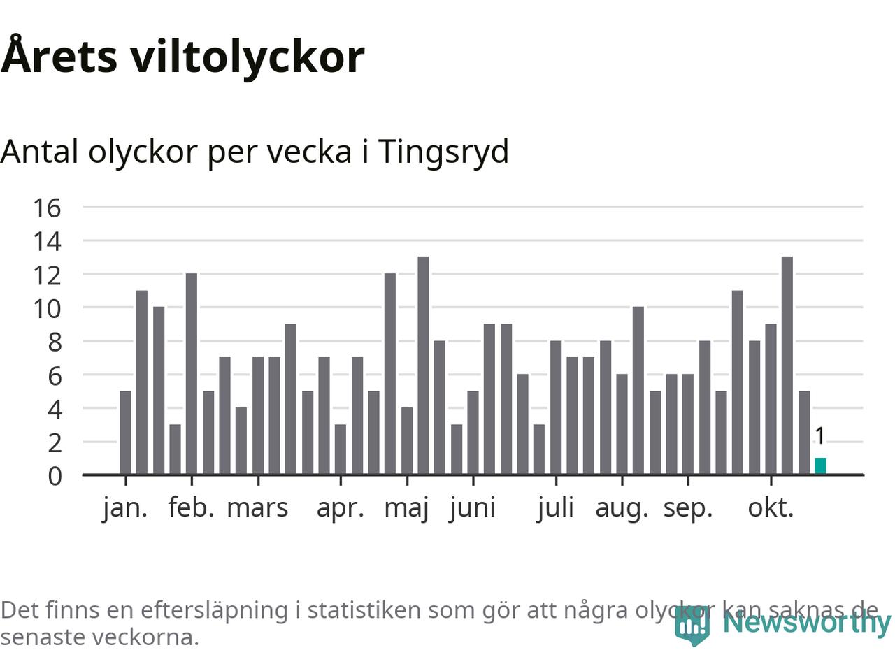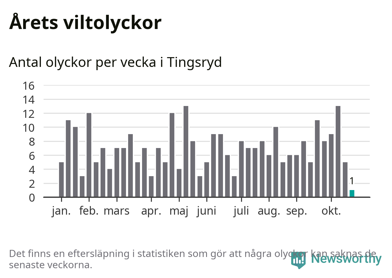 Från förra veckan (vecka 44) har hittills en viltolycka rapporterats in i Tingsryds kommun.