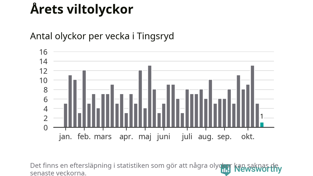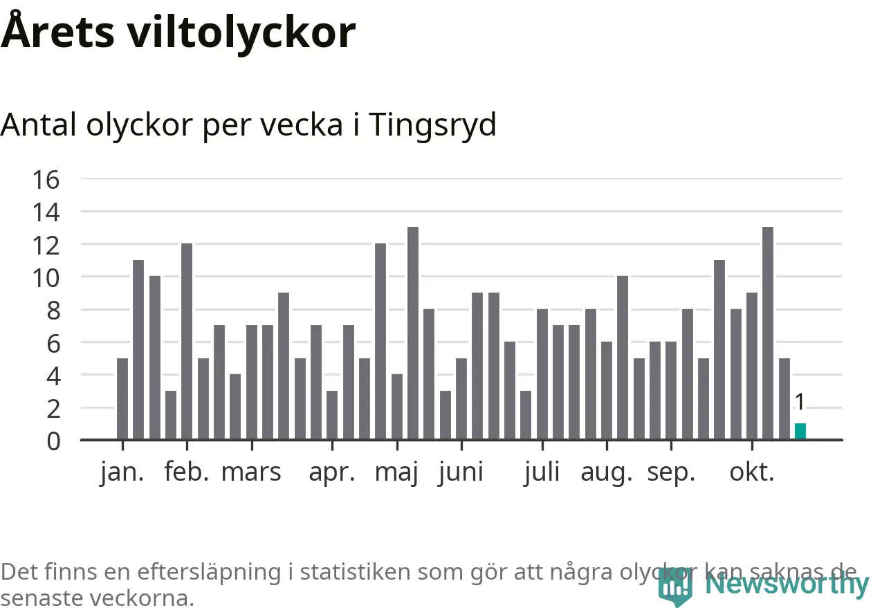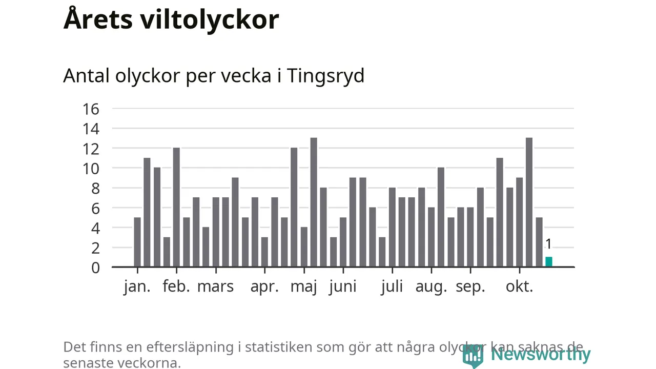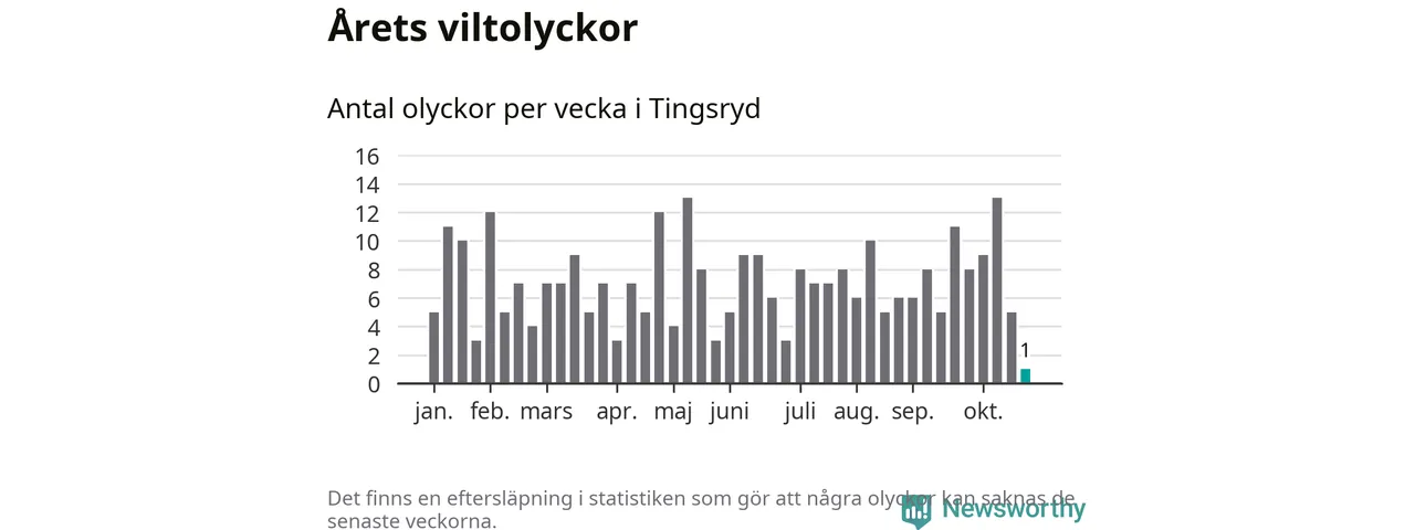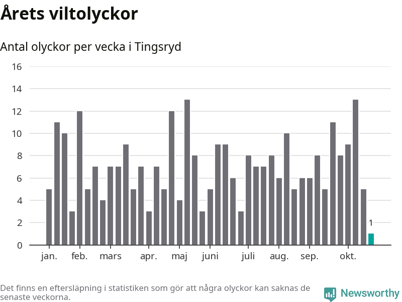Från förra veckan (vecka 44) har hittills en viltolycka rapporterats in i Tingsryds kommun.