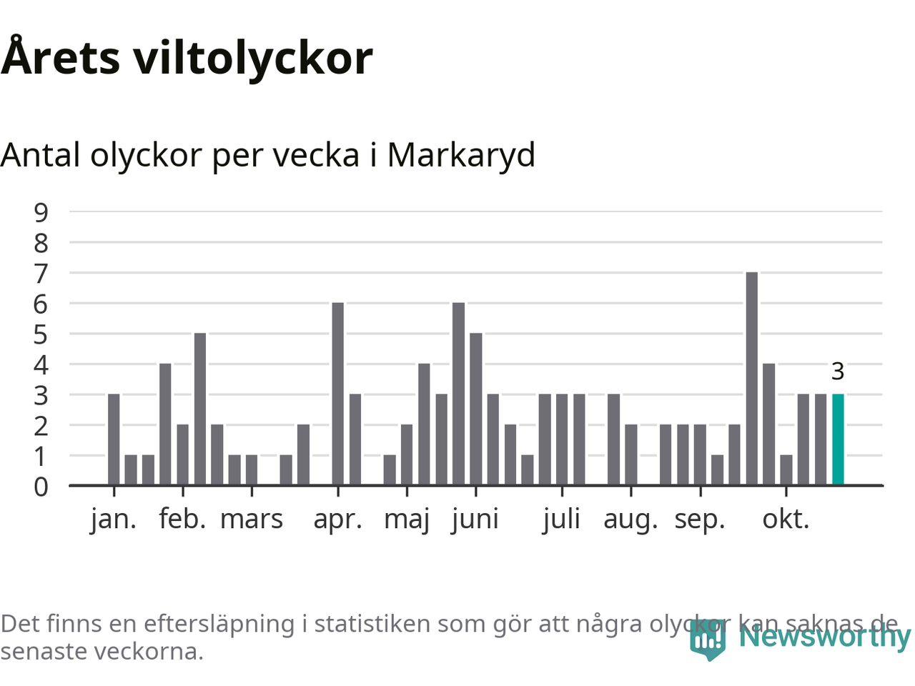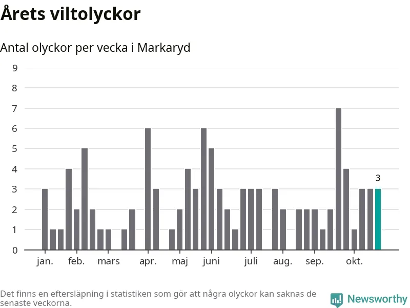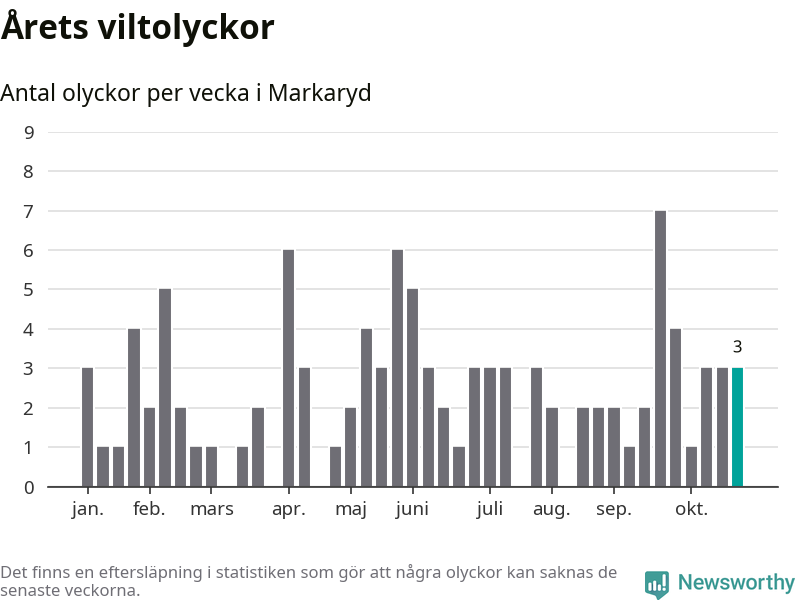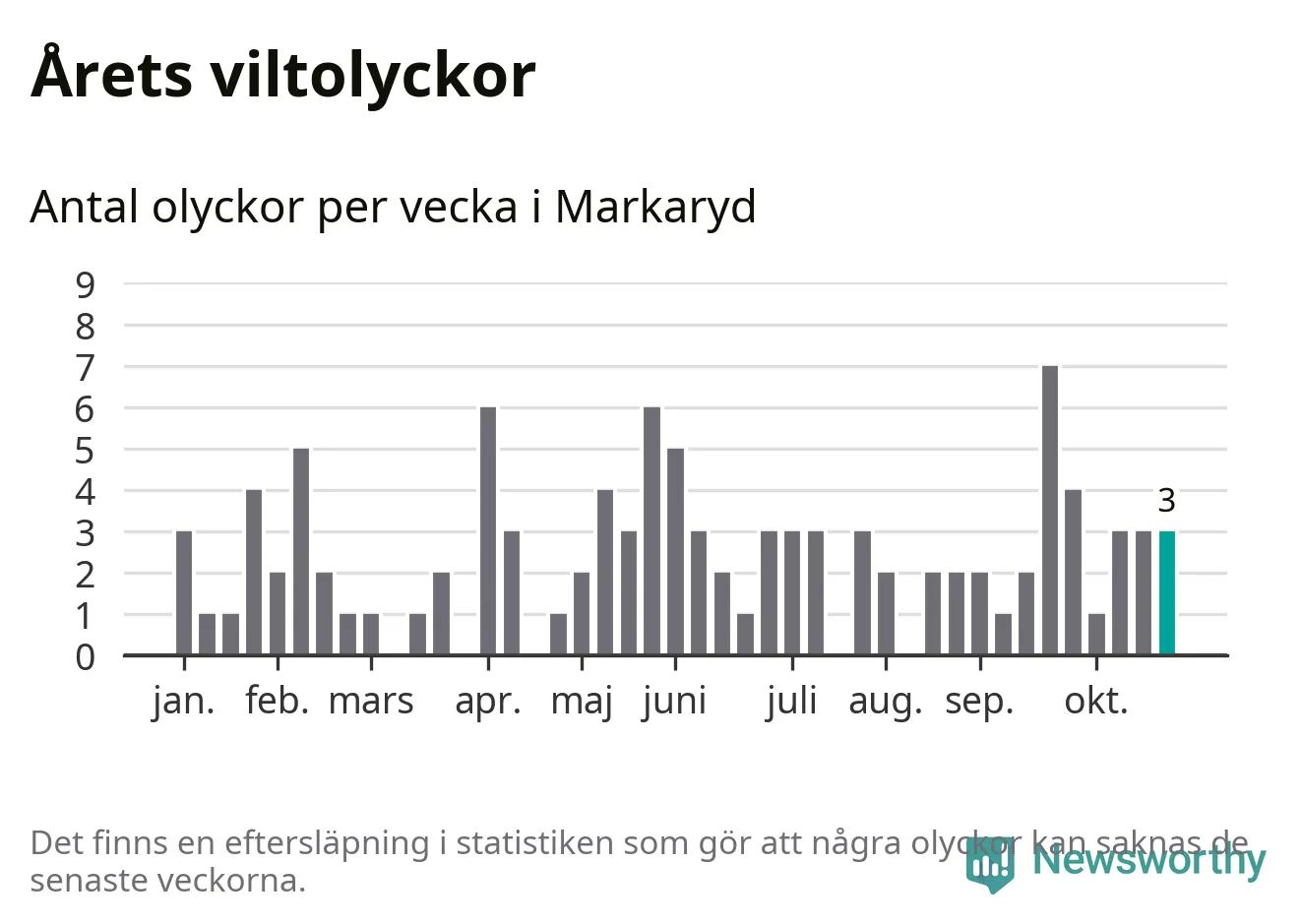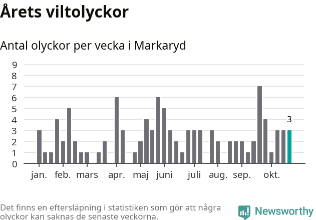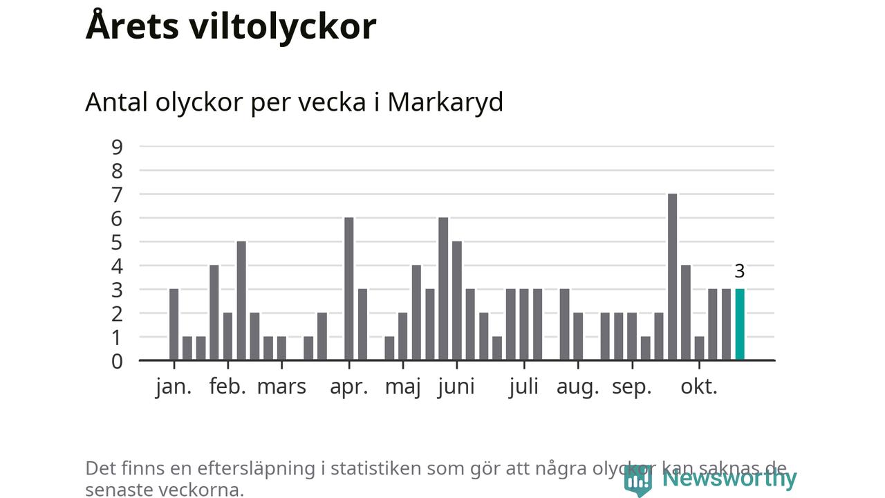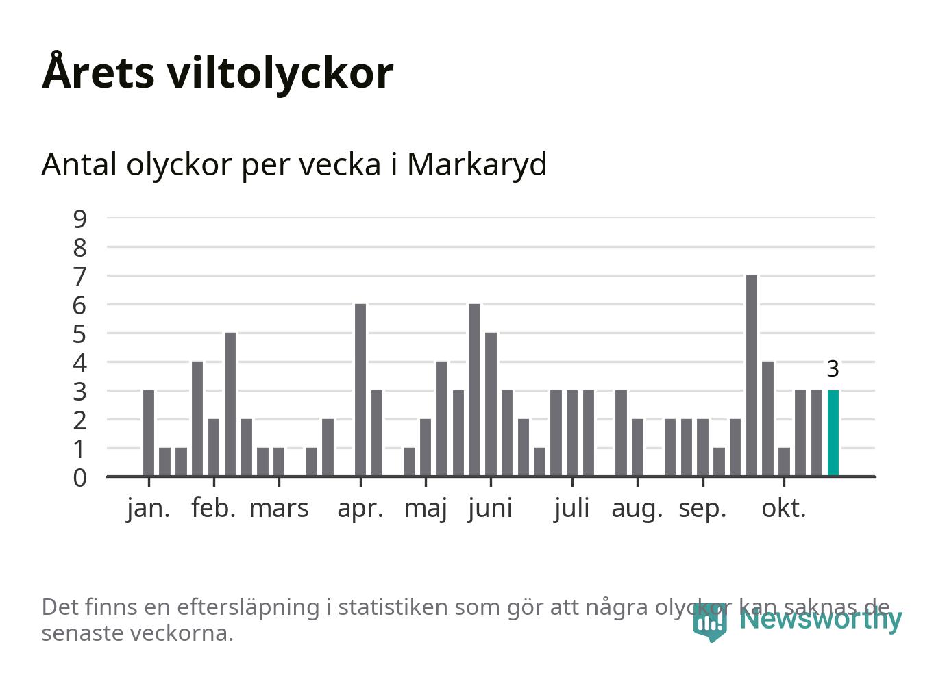 Hittills har tre viltolyckor rapporterats in i Markaryds kommun från vecka 44. Se listan här.