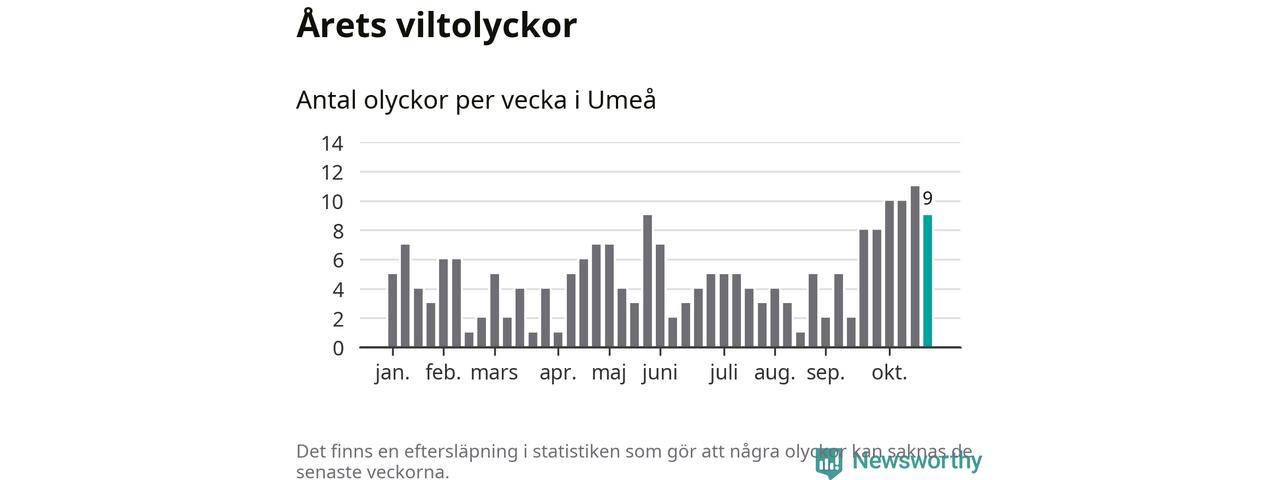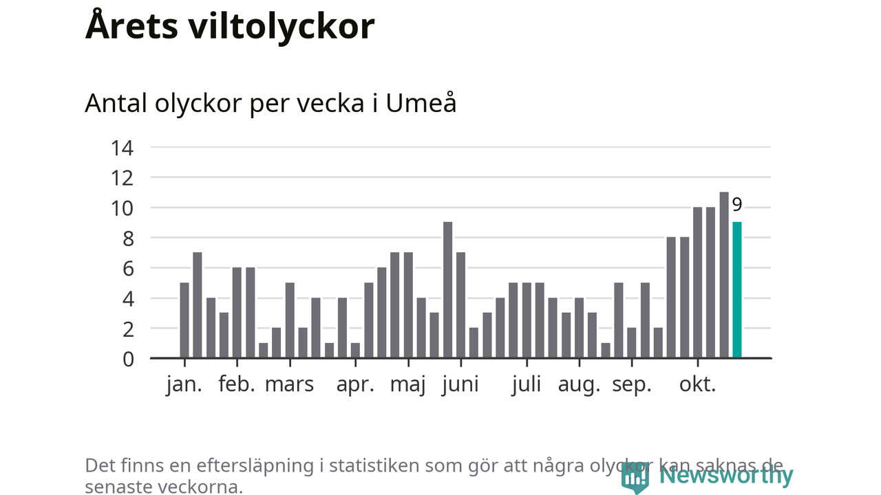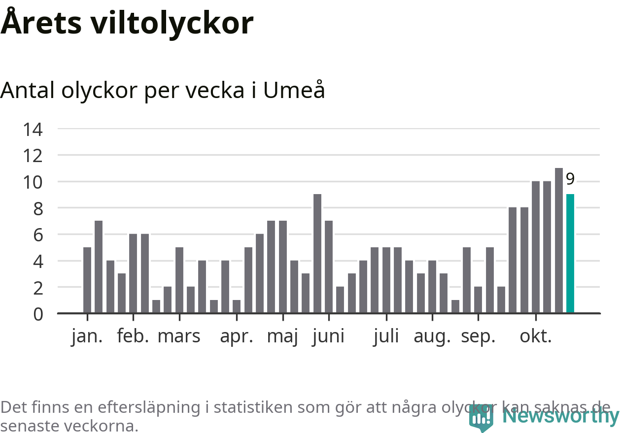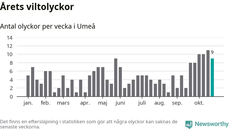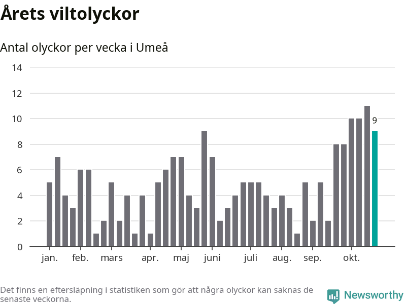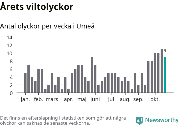 sett till de senaste tio årens statistik. I statistiken ingår inte olyckor med ren, som här räknas som tamdjur.