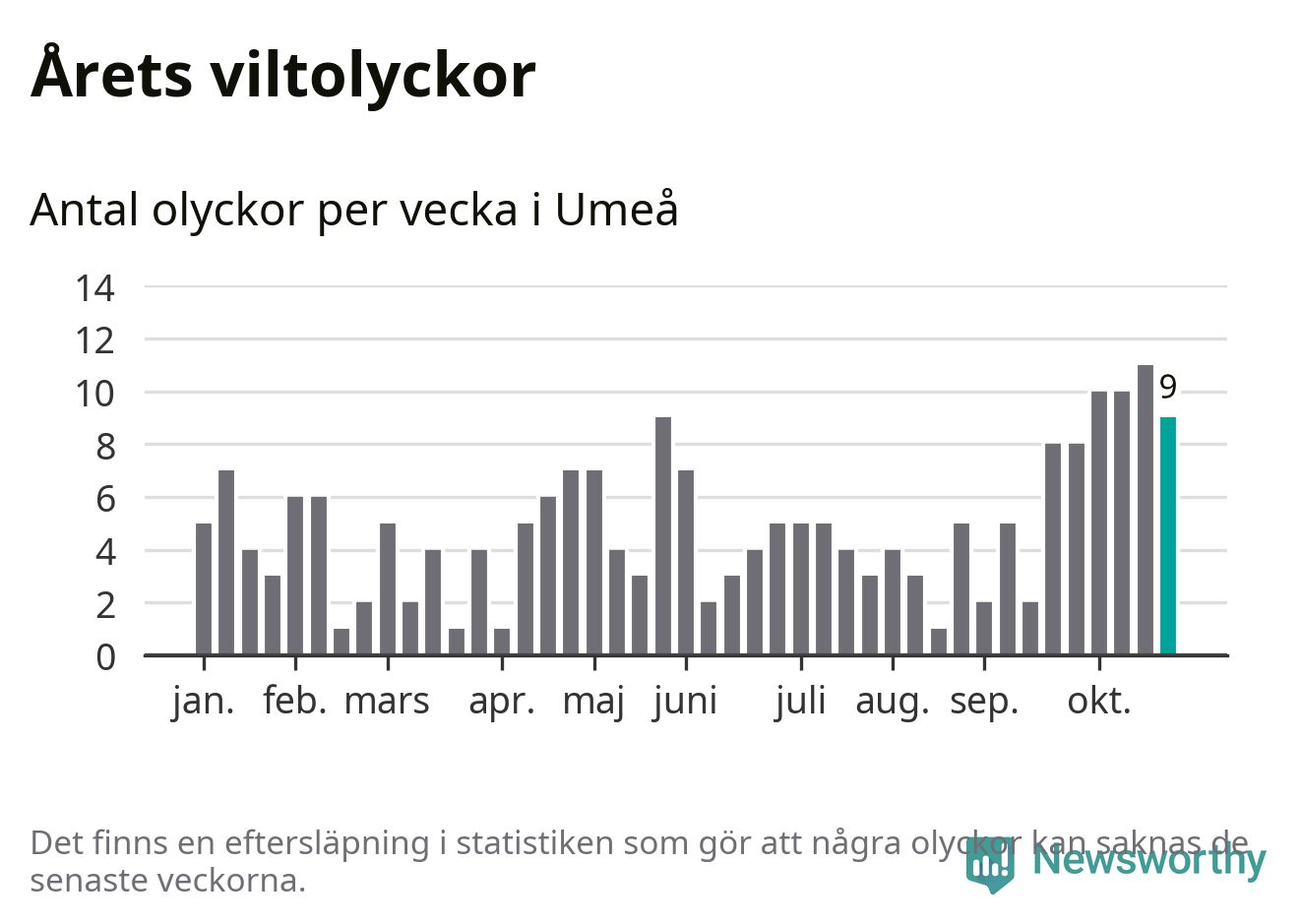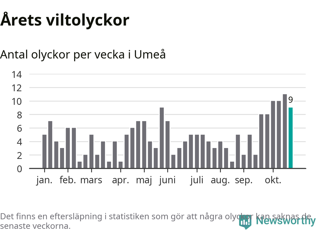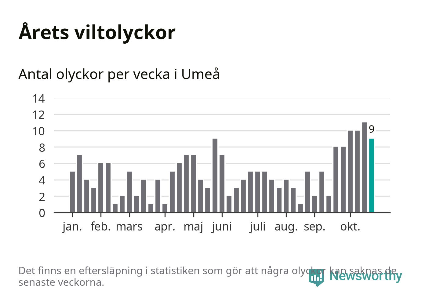 sett till de senaste tio årens statistik. I statistiken ingår inte olyckor med ren, som här räknas som tamdjur.