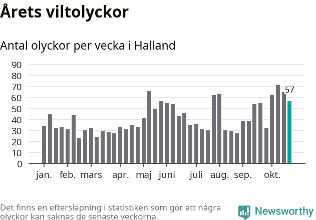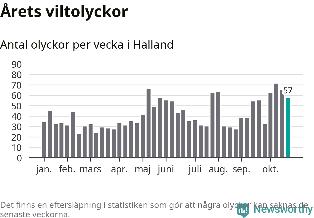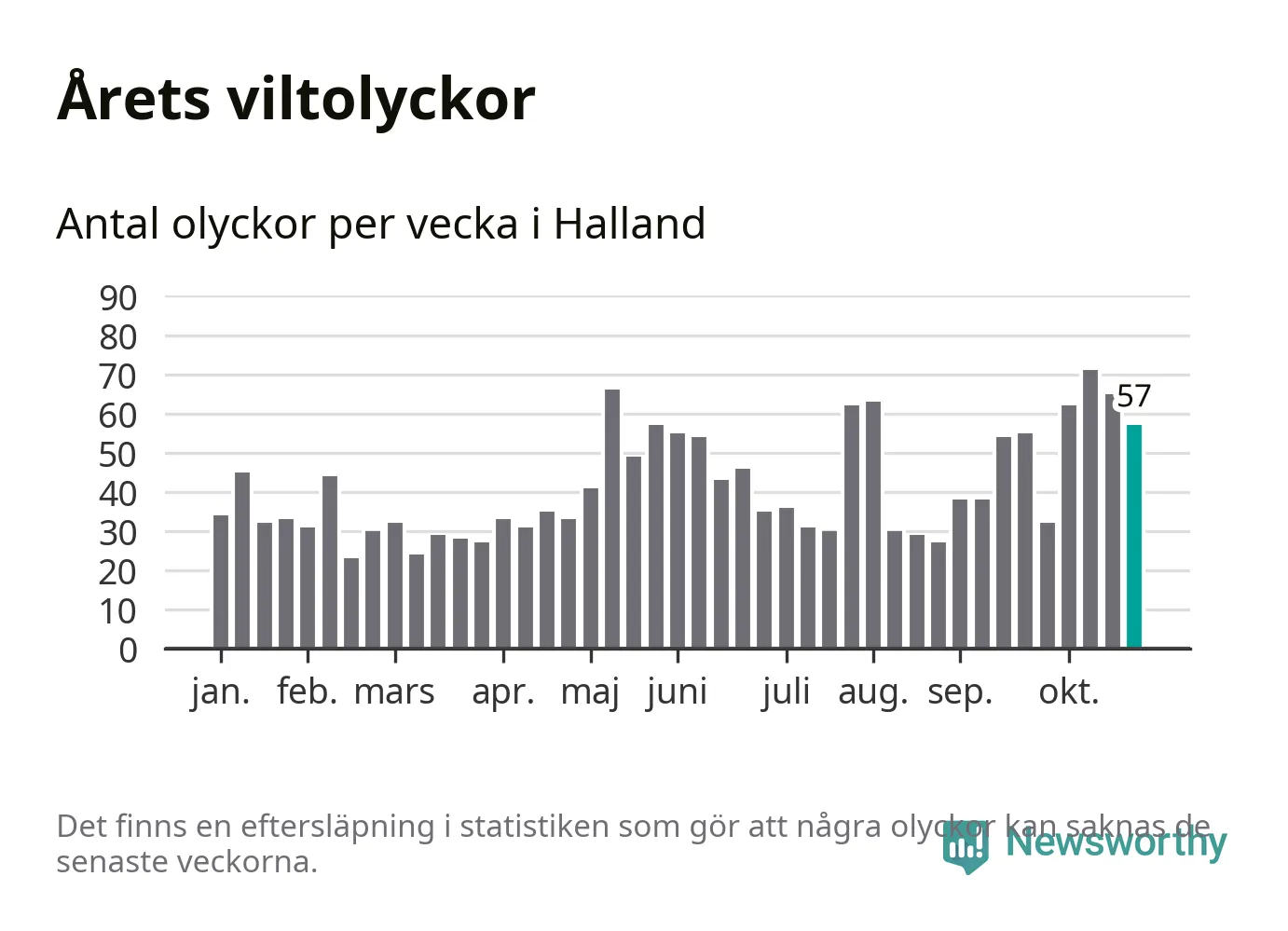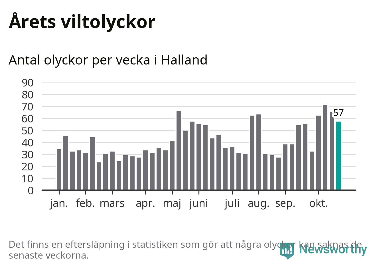Hittills har 57 viltolyckor rapporterats in i Hallands län från vecka 44. Se listan här.