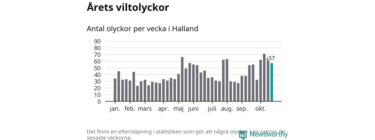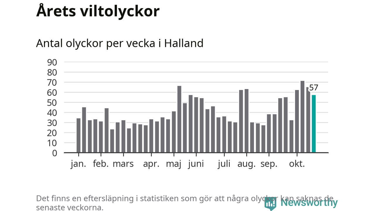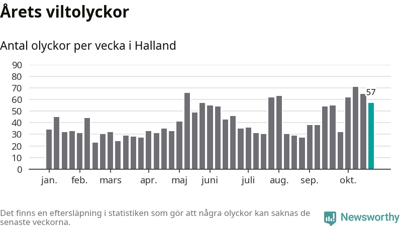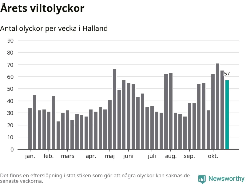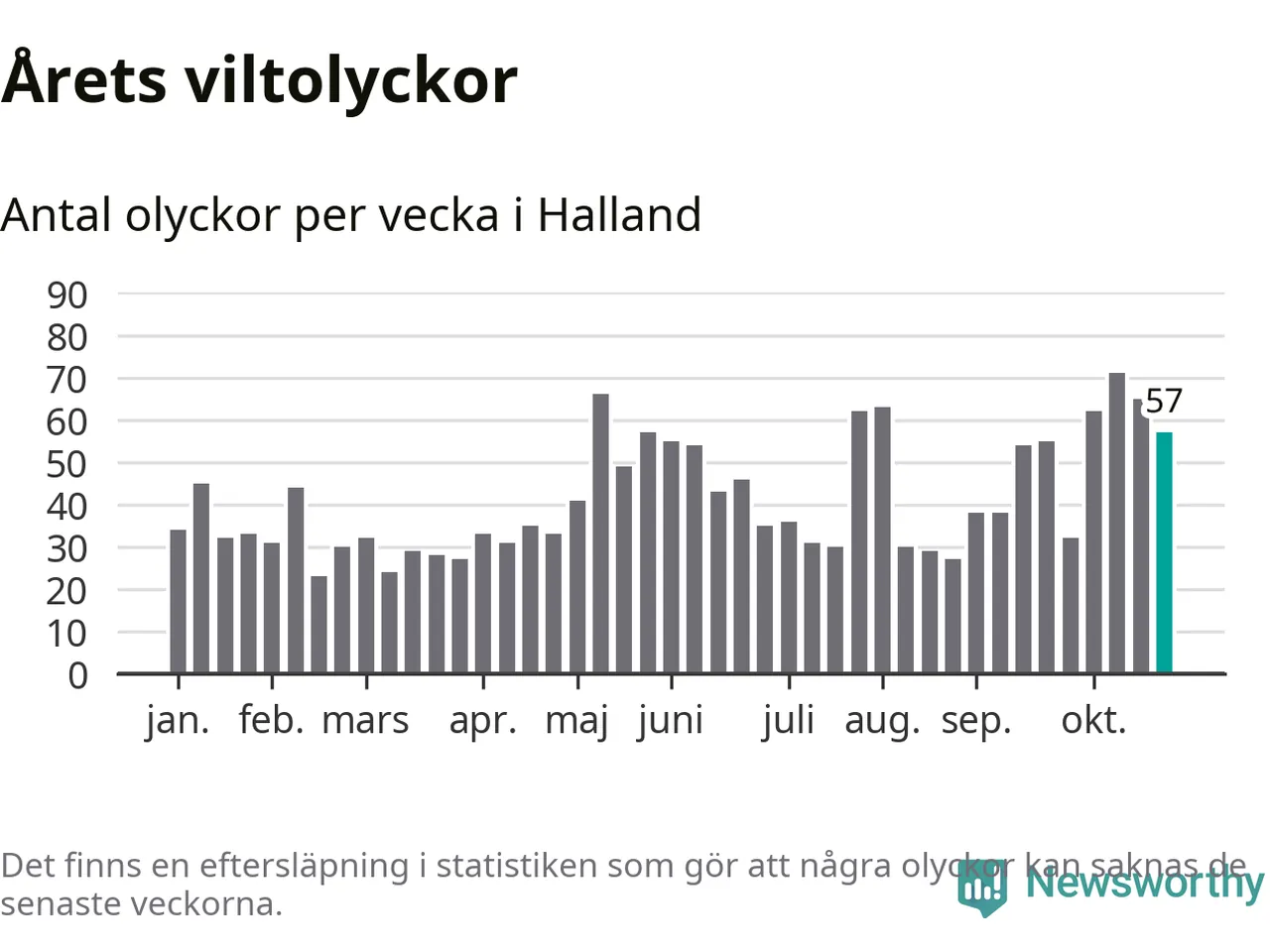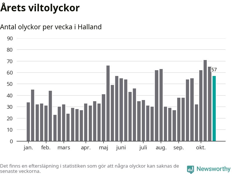 Hittills har 57 viltolyckor rapporterats in i Hallands län från vecka 44. Se listan här.