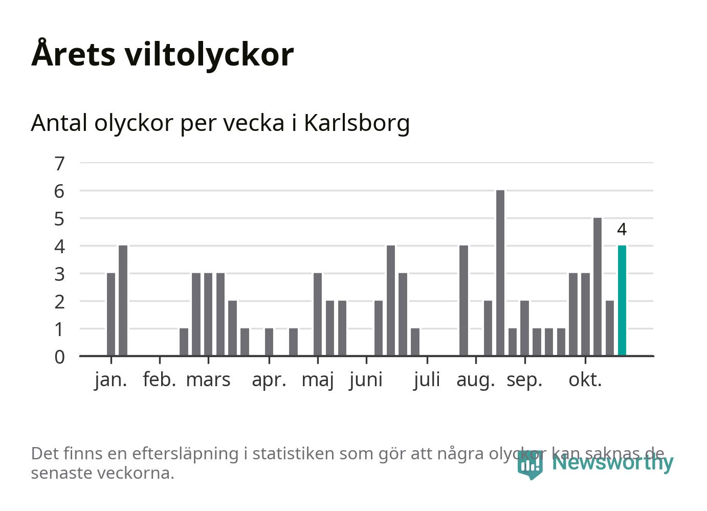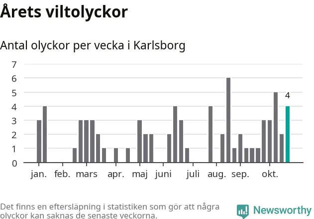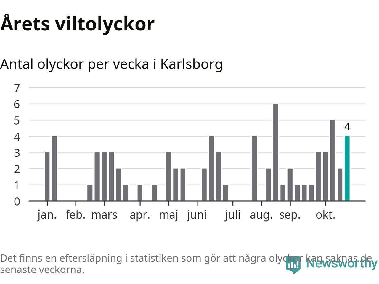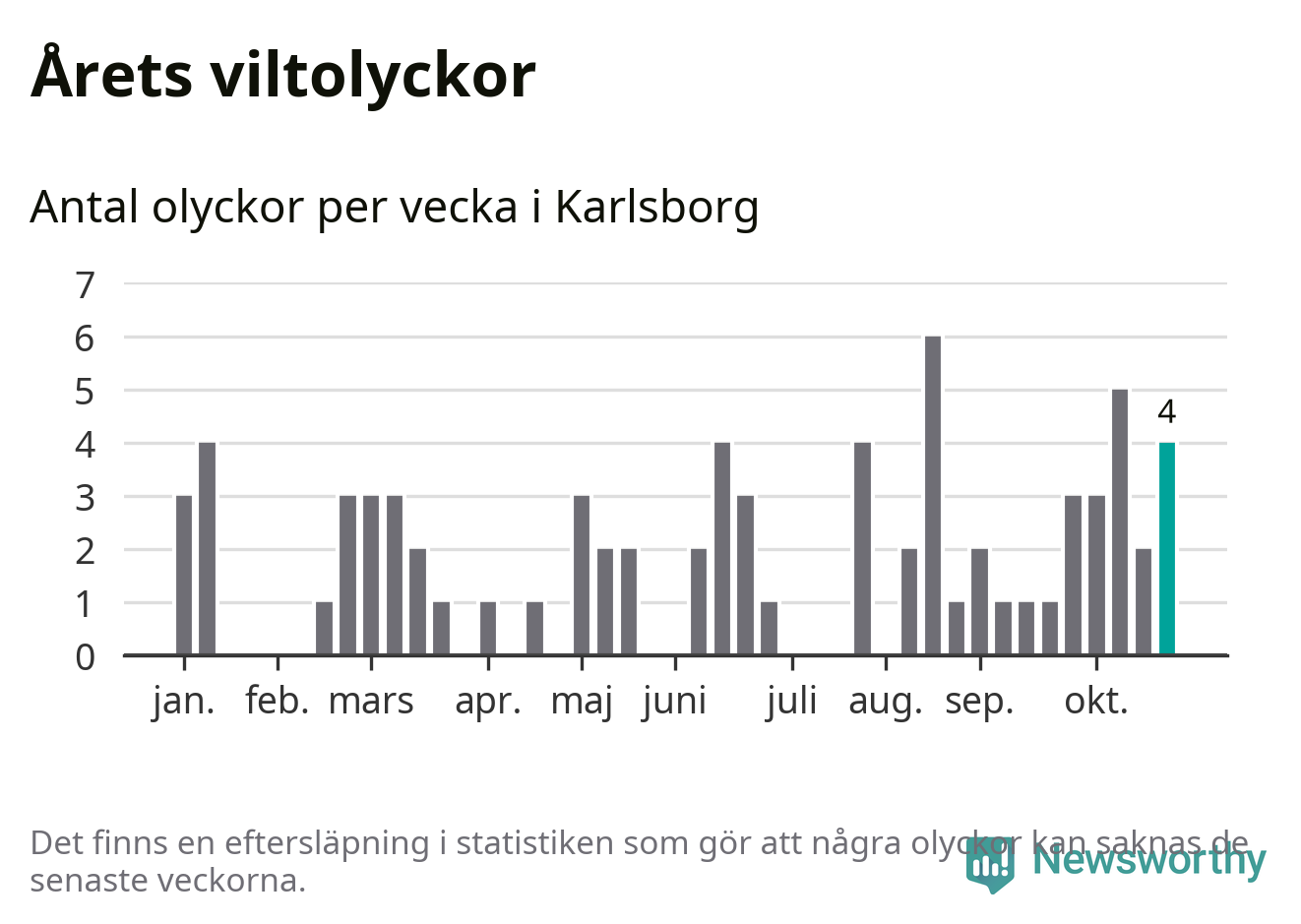 Hittills har fyra viltolyckor rapporterats in i Karlsborgs kommun från vecka 44. Se listan här.
