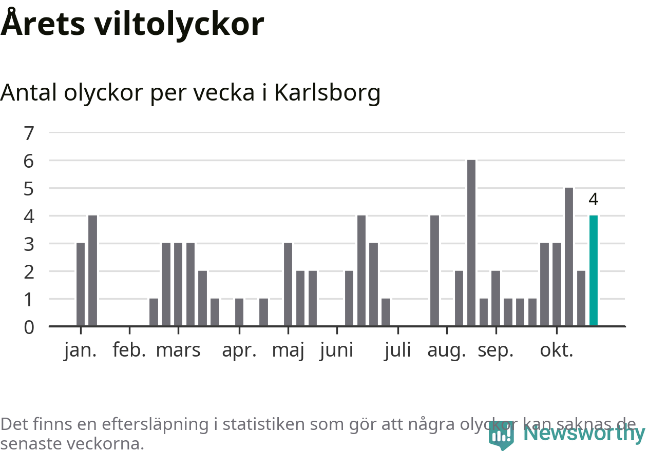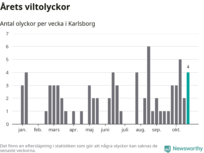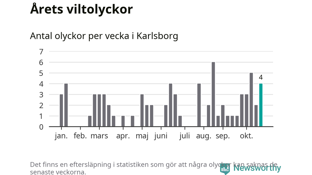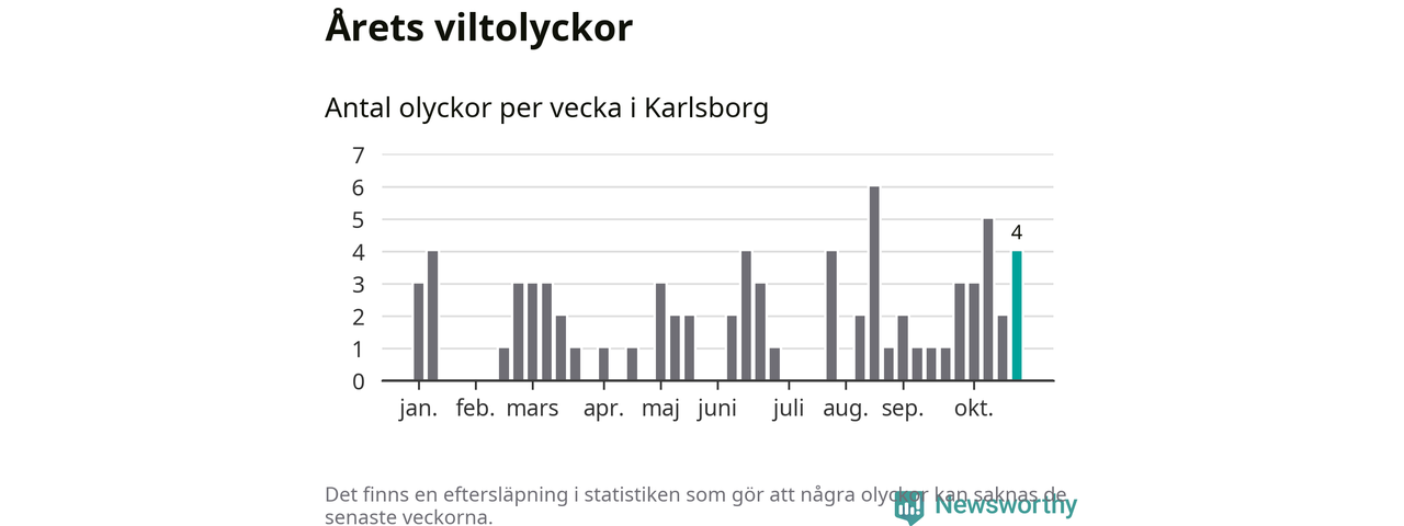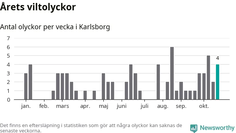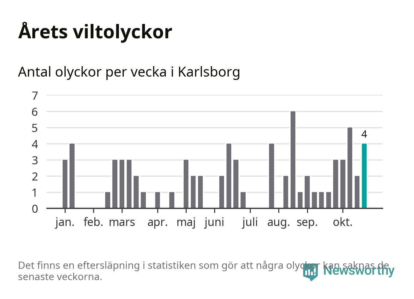 Hittills har fyra viltolyckor rapporterats in i Karlsborgs kommun från vecka 44. Se listan här.
