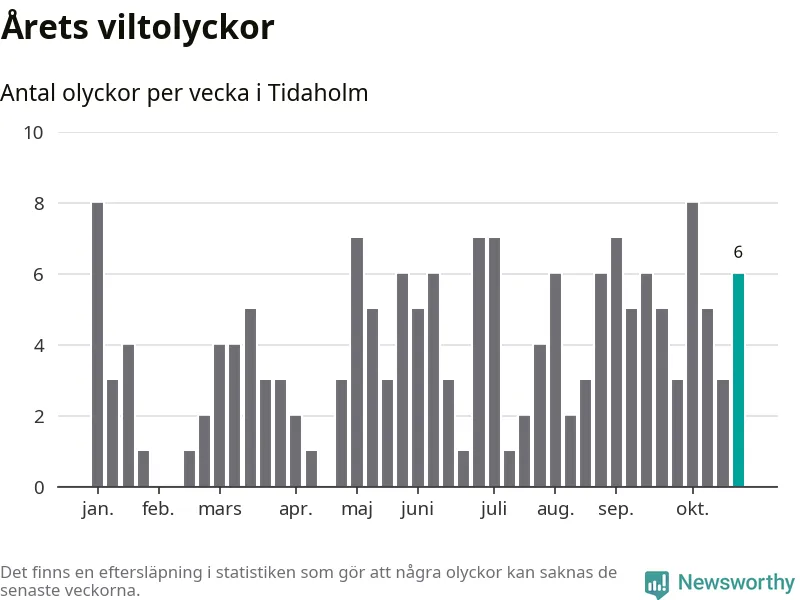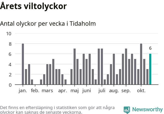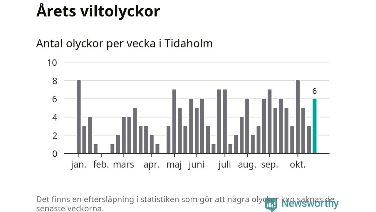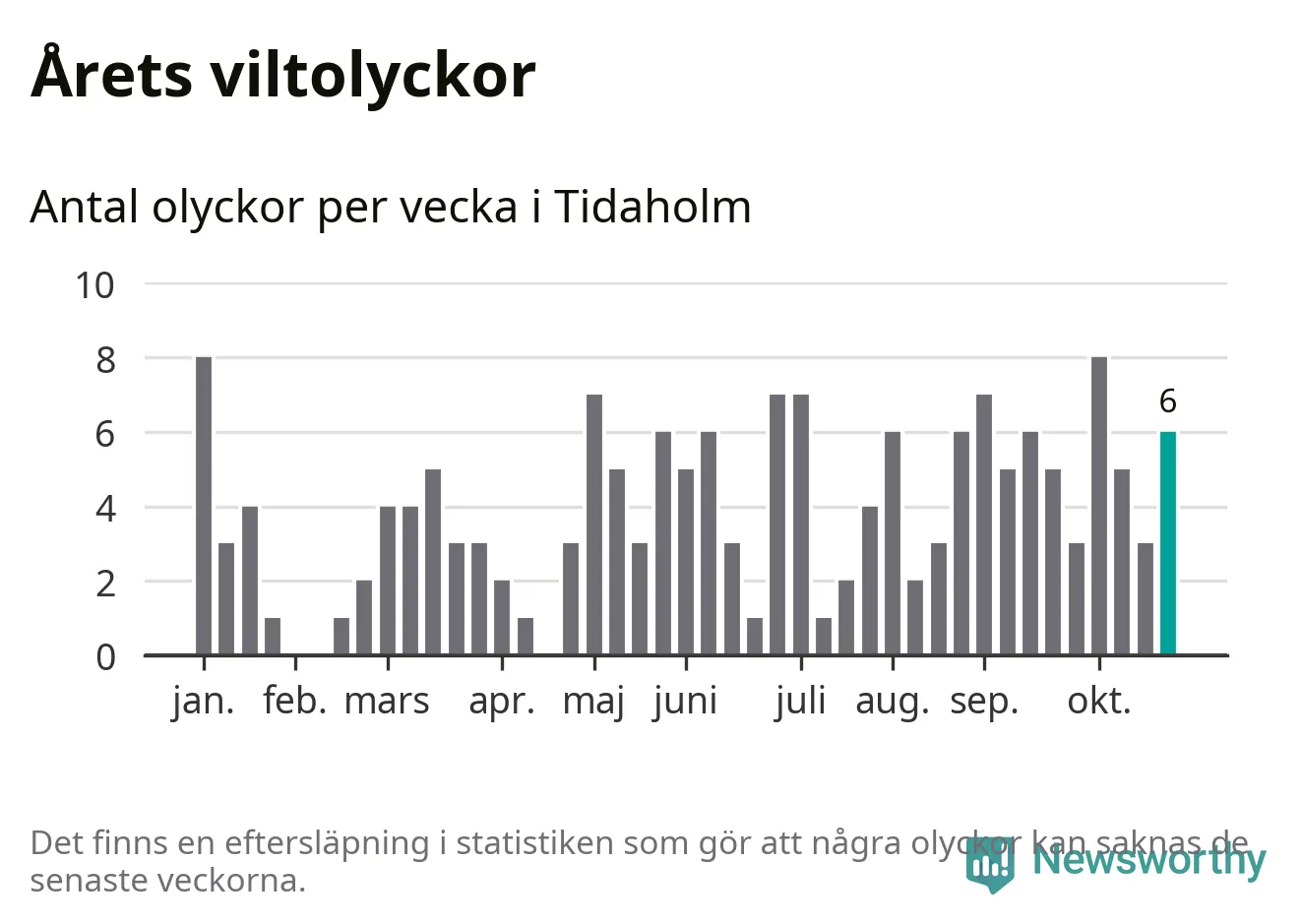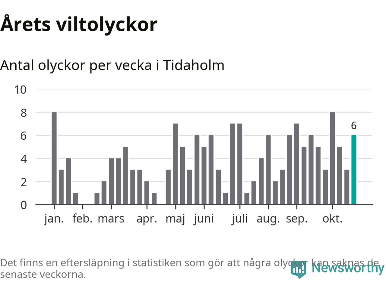 Hittills har sex viltolyckor rapporterats in i Tidaholms kommun från vecka 44. Se listan här.