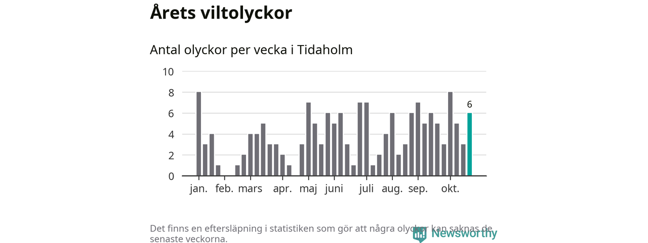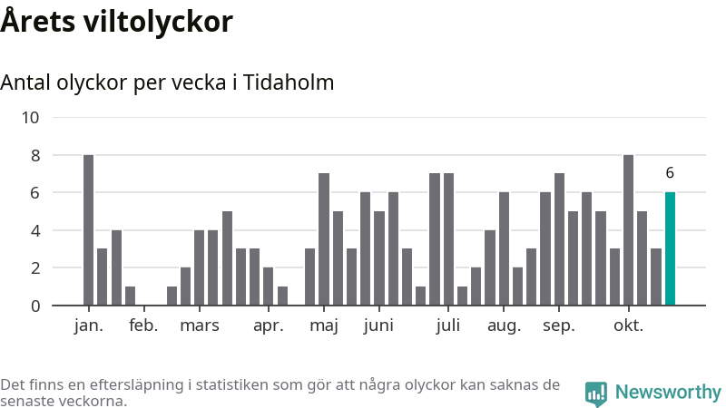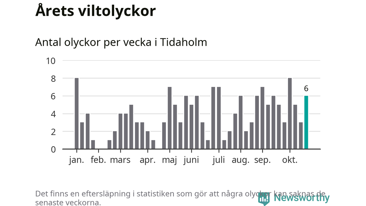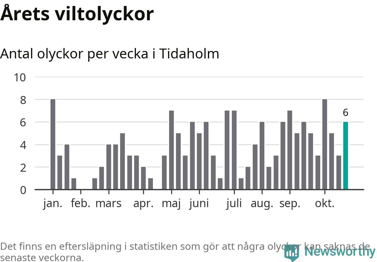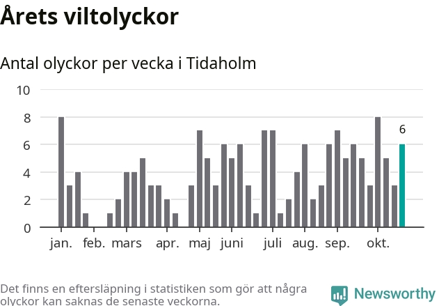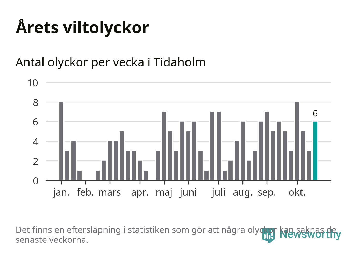 Hittills har sex viltolyckor rapporterats in i Tidaholms kommun från vecka 44. Se listan här.