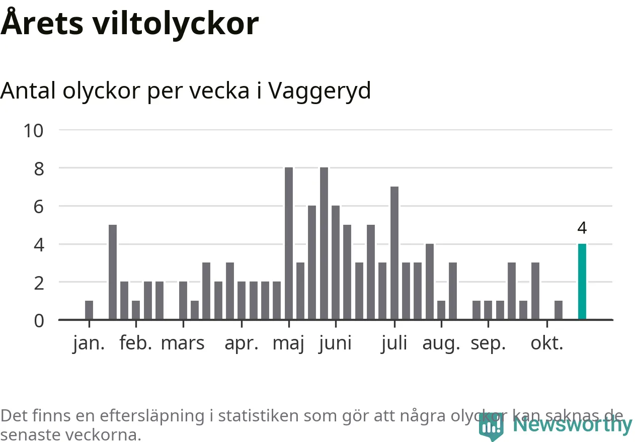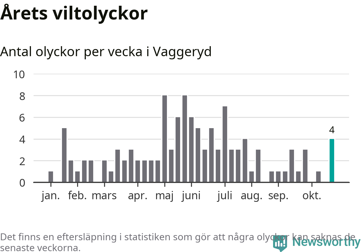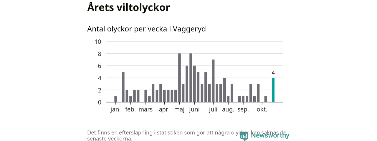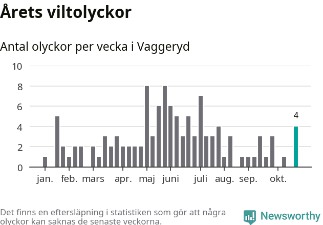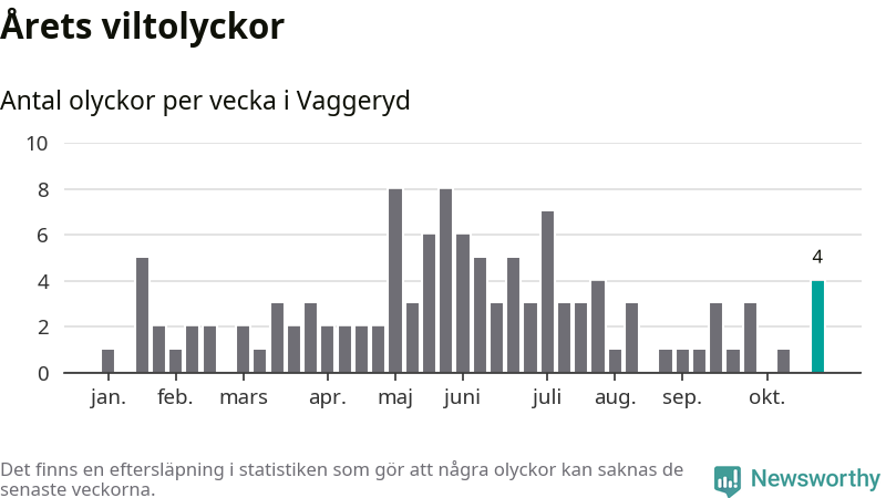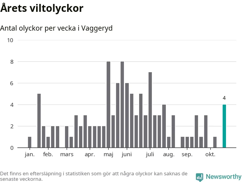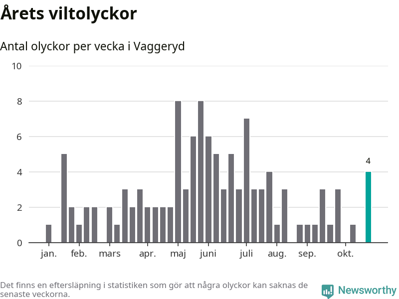 Hittills har fyra viltolyckor rapporterats in i Vaggeryds kommun från vecka 44. Se listan här.