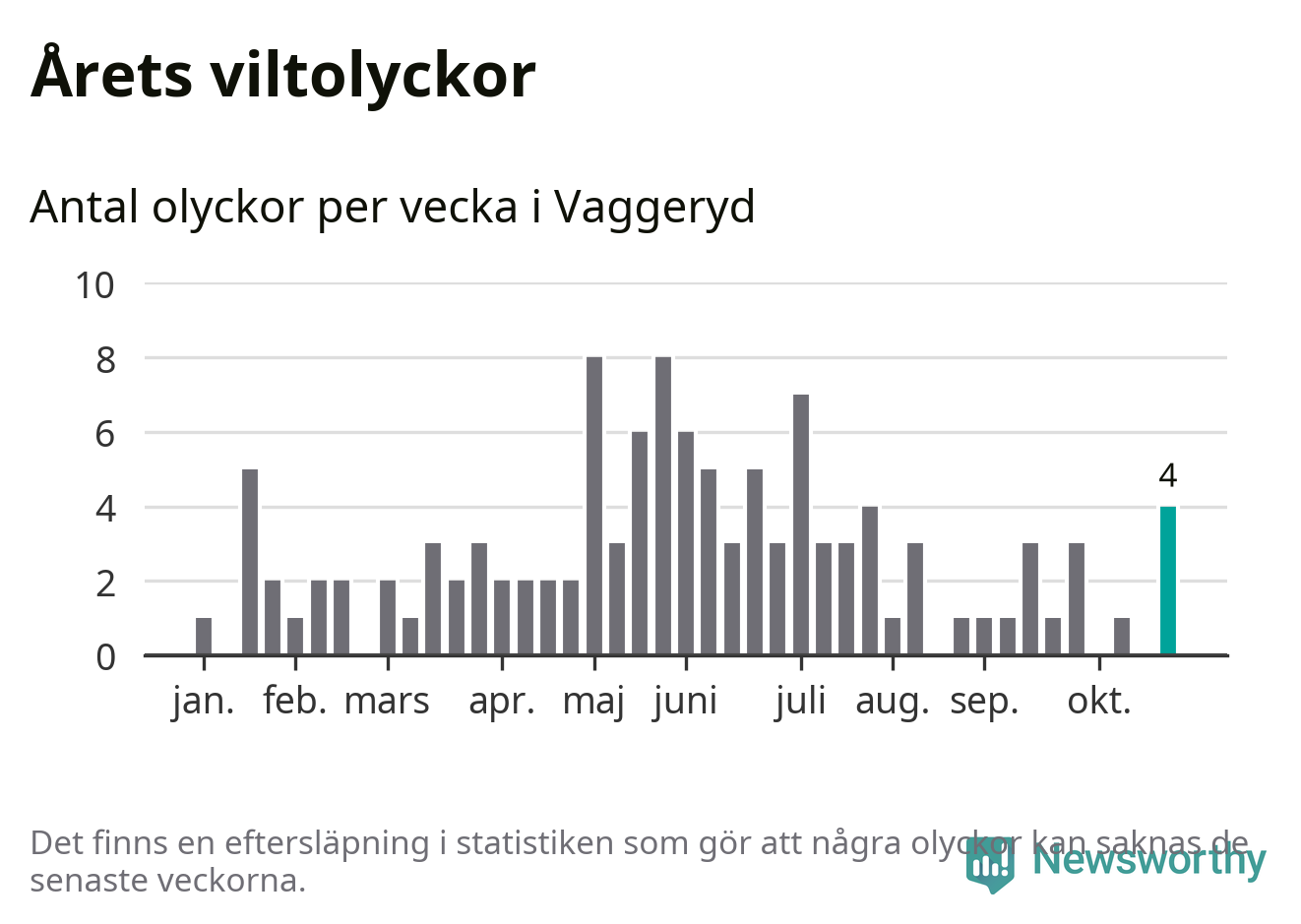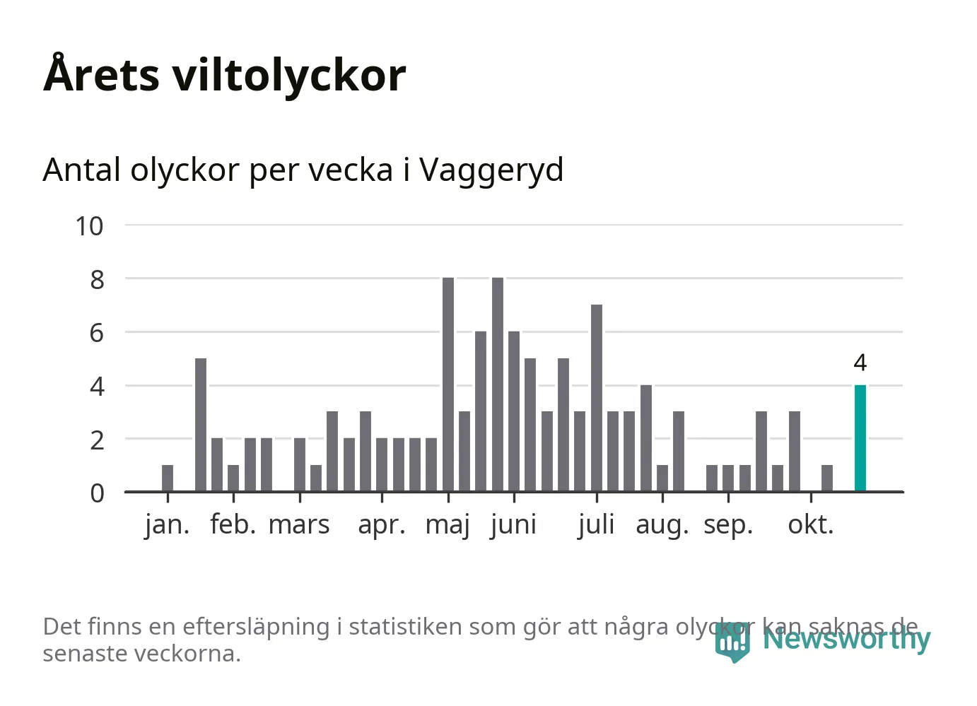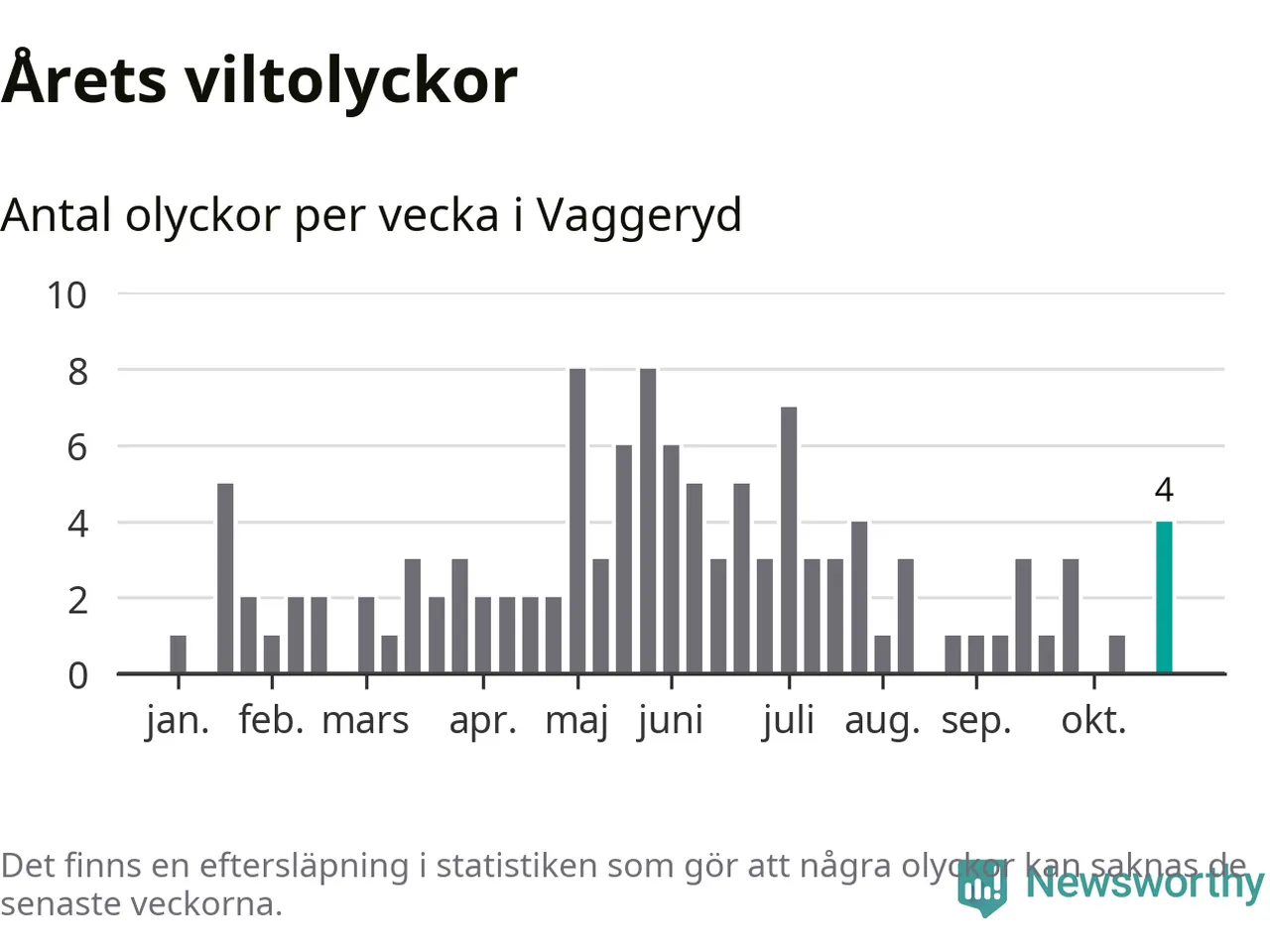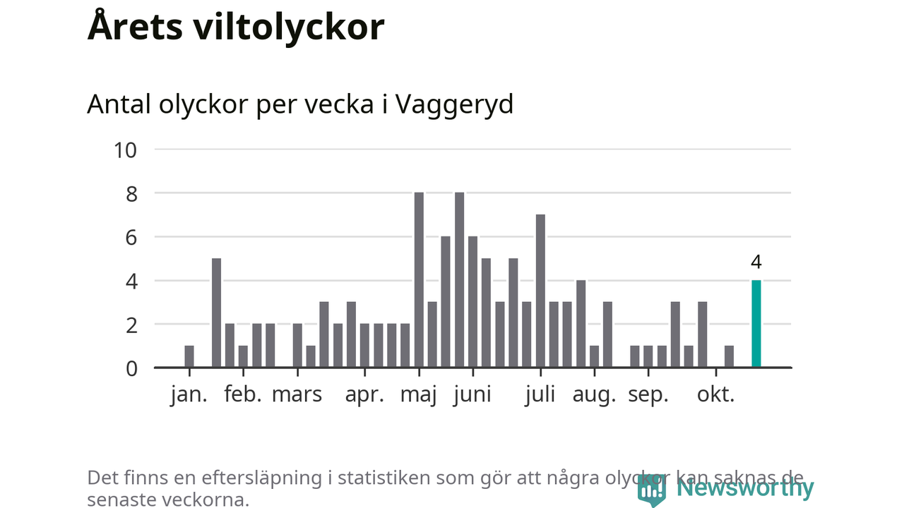 Hittills har fyra viltolyckor rapporterats in i Vaggeryds kommun från vecka 44. Se listan här.