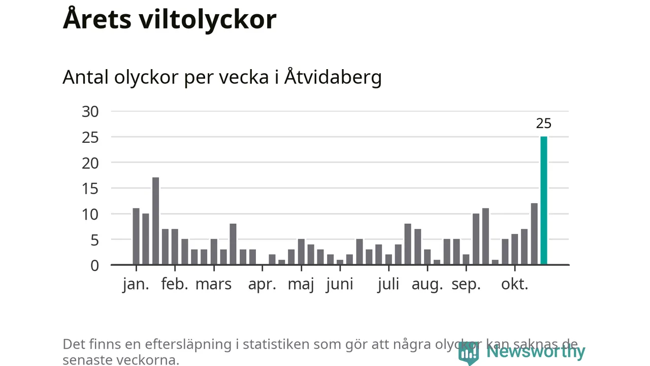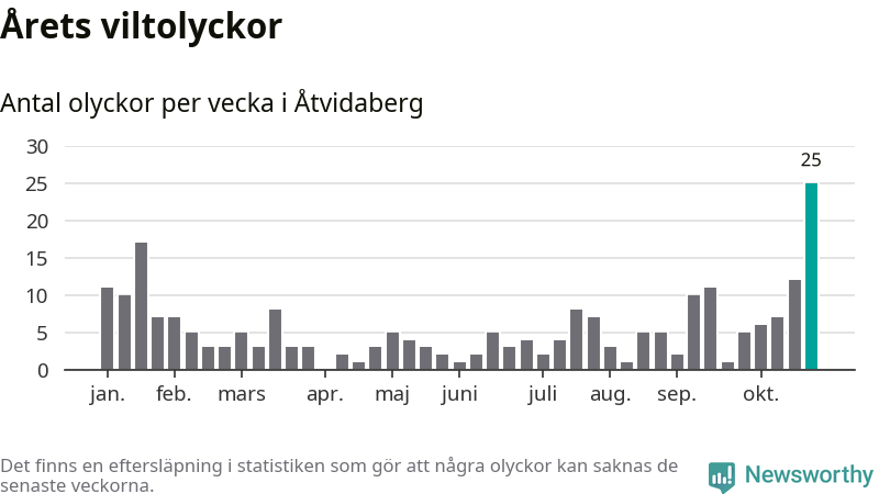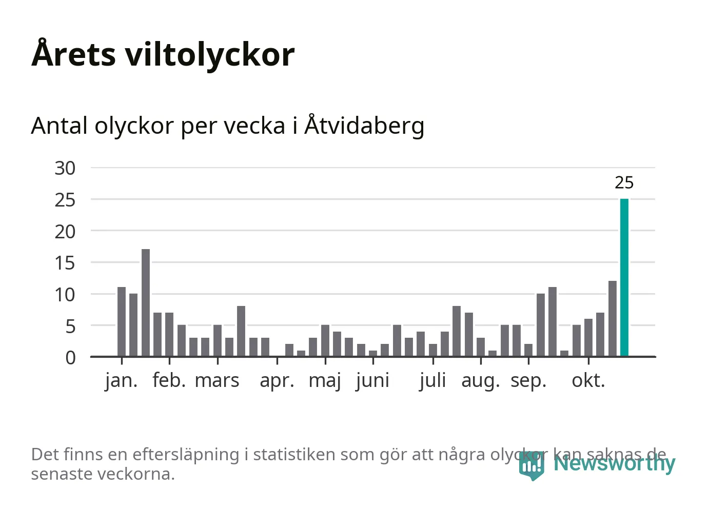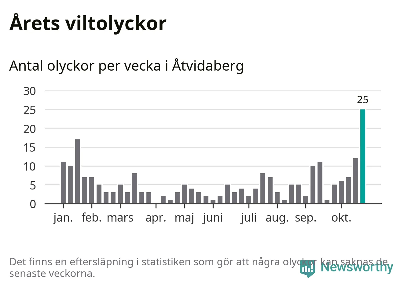 Under vecka 44 rapporterades 25 viltolyckor in i Åtvidabergs kommun. Det är det största antalet på en enskild vecka hittills i år.