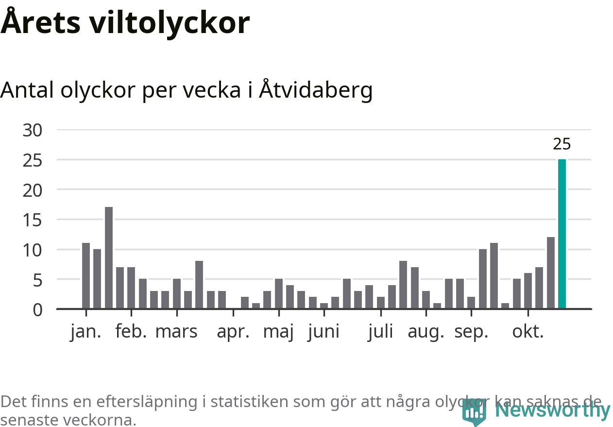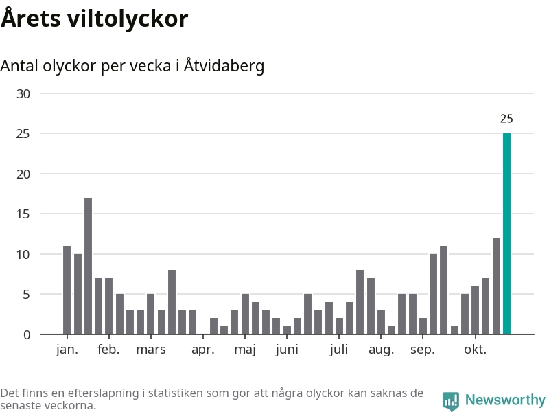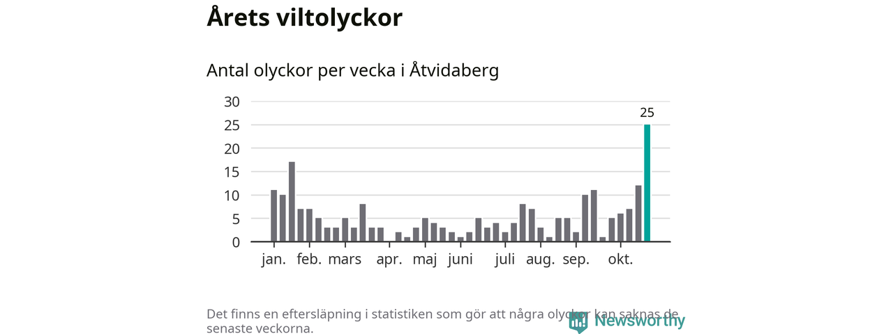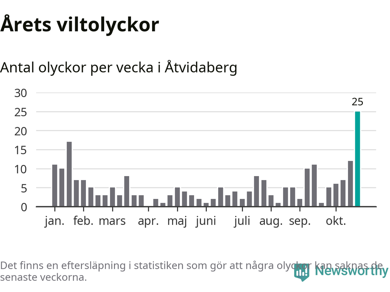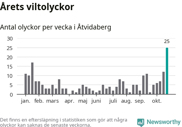 Under vecka 44 rapporterades 25 viltolyckor in i Åtvidabergs kommun. Det är det största antalet på en enskild vecka hittills i år.
