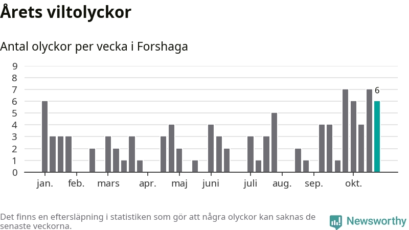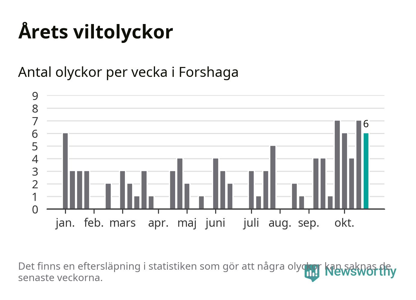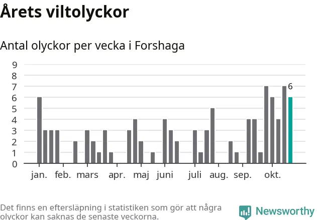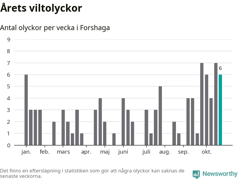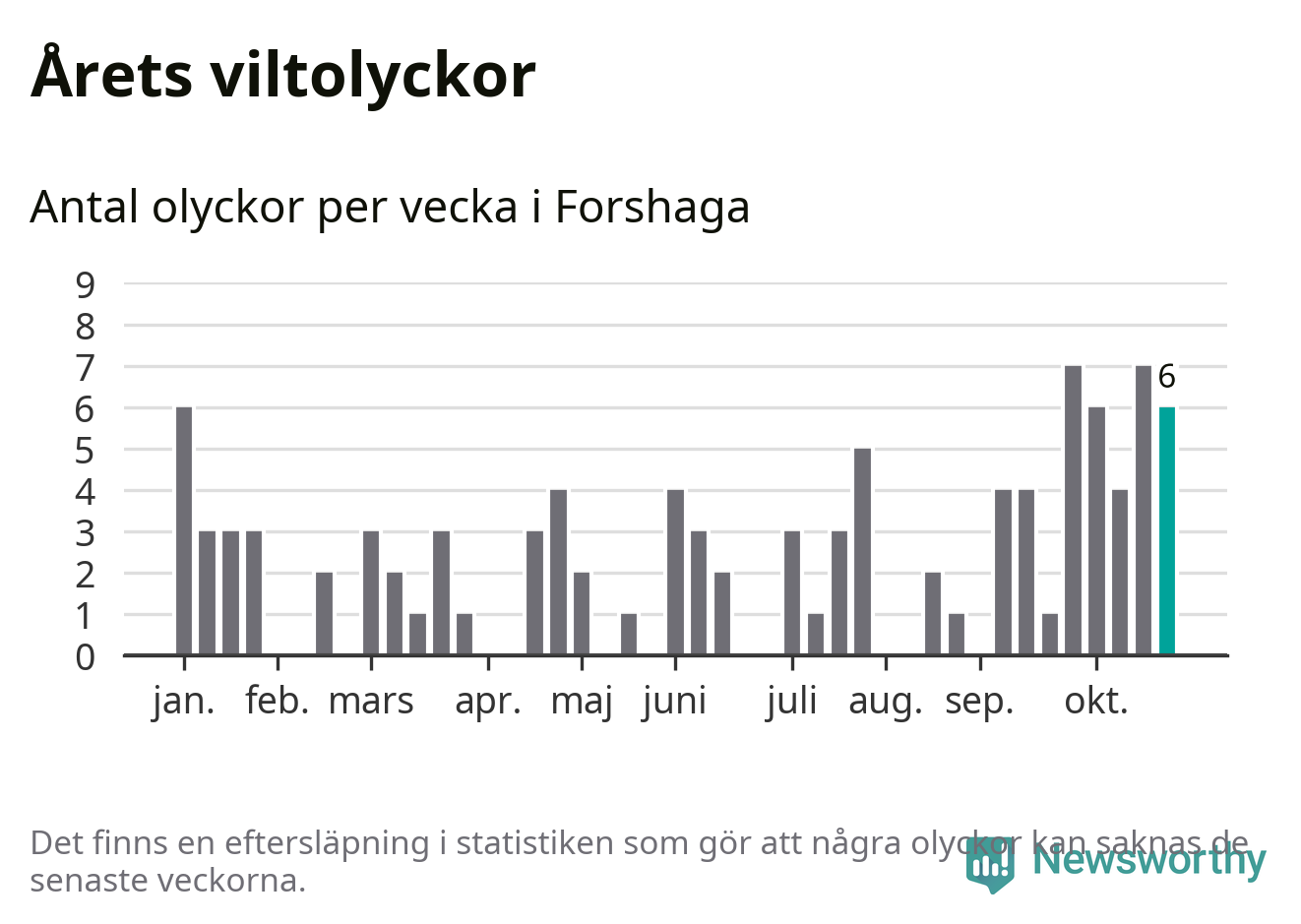 Hittills har sex viltolyckor rapporterats in i Forshaga kommun från vecka 44. Se listan här.