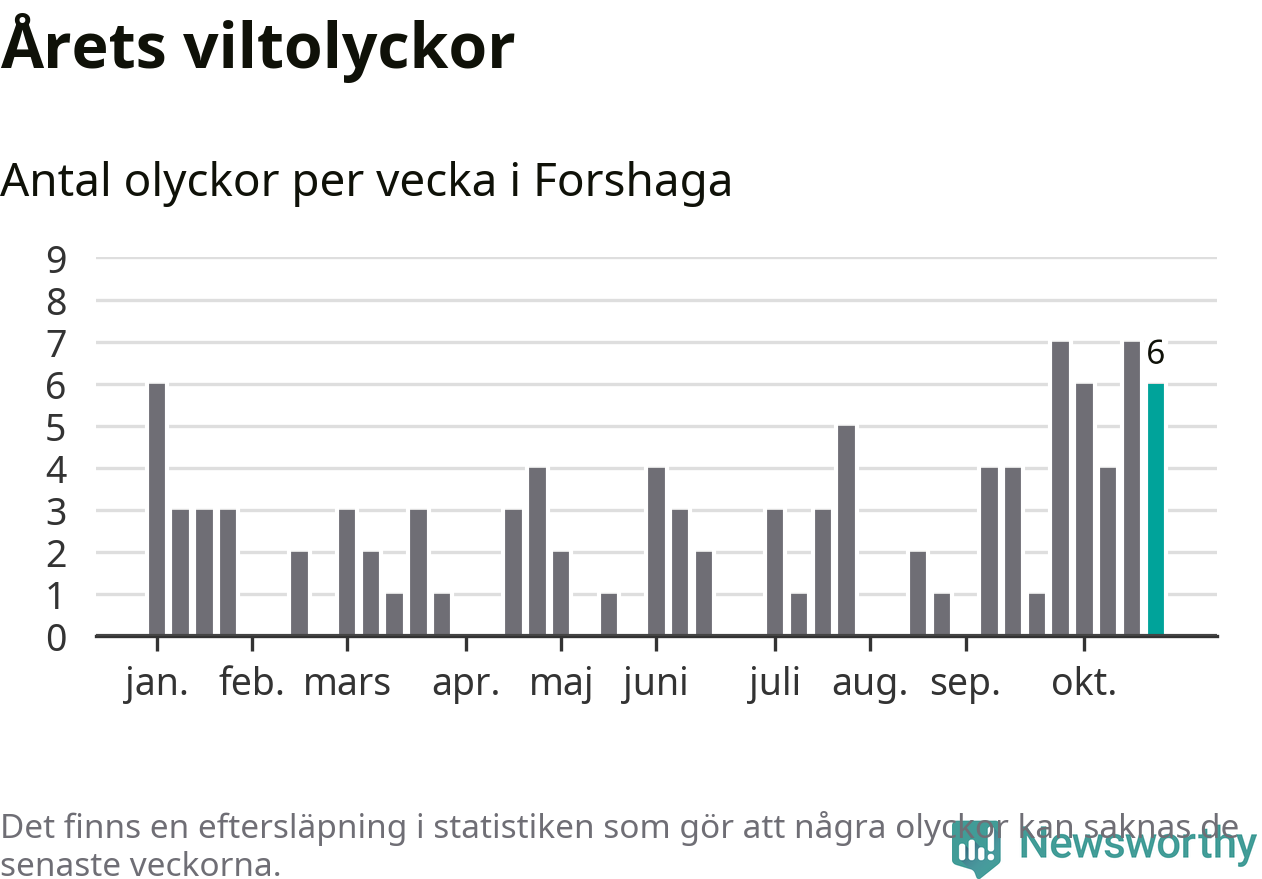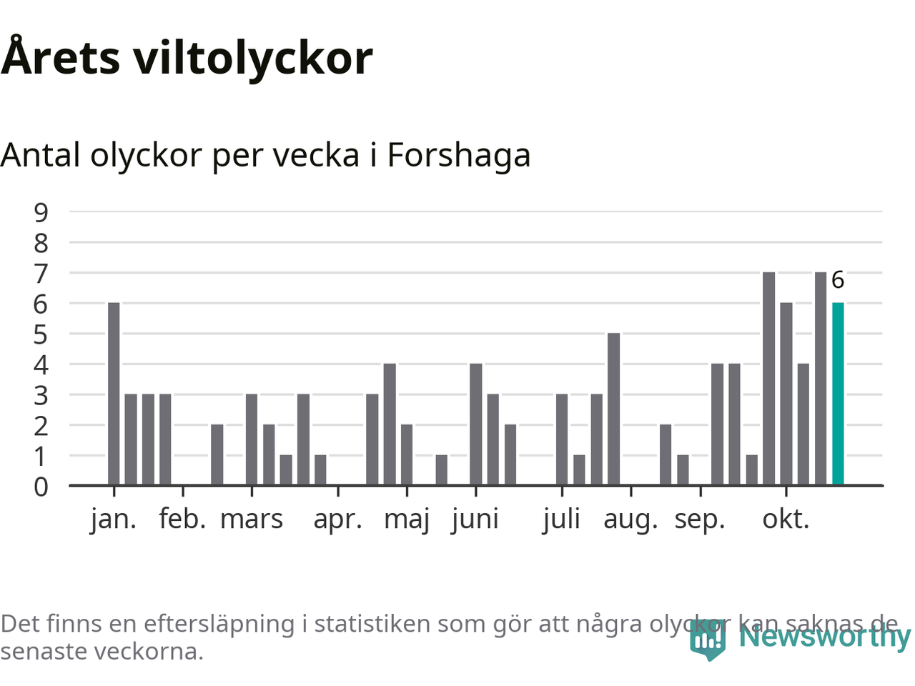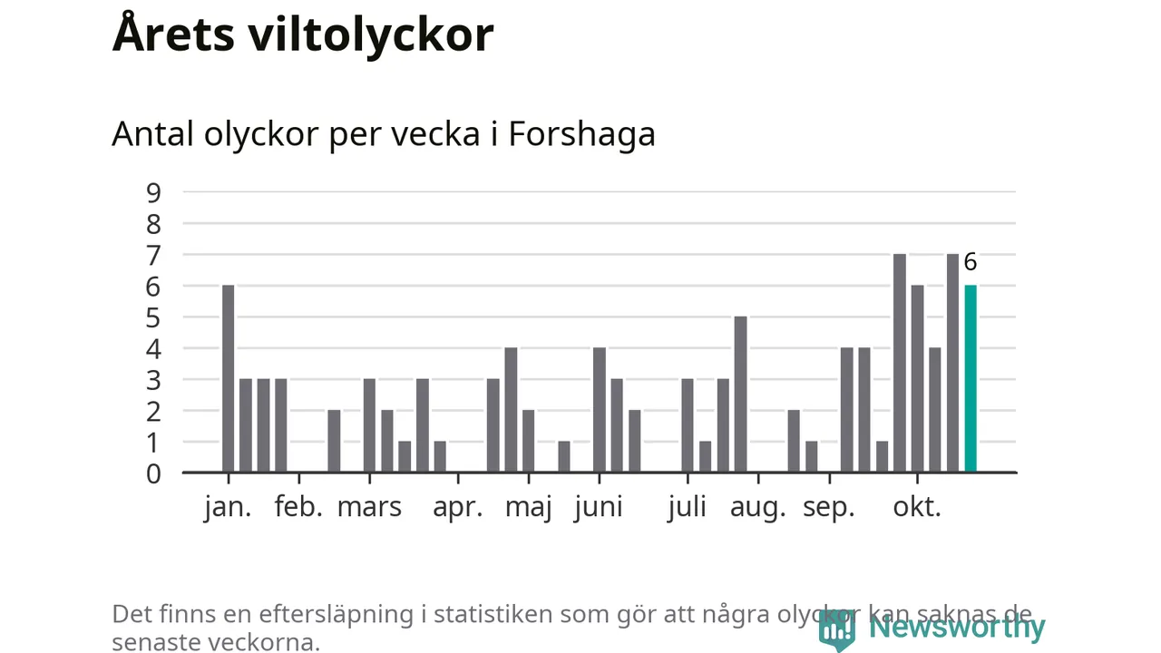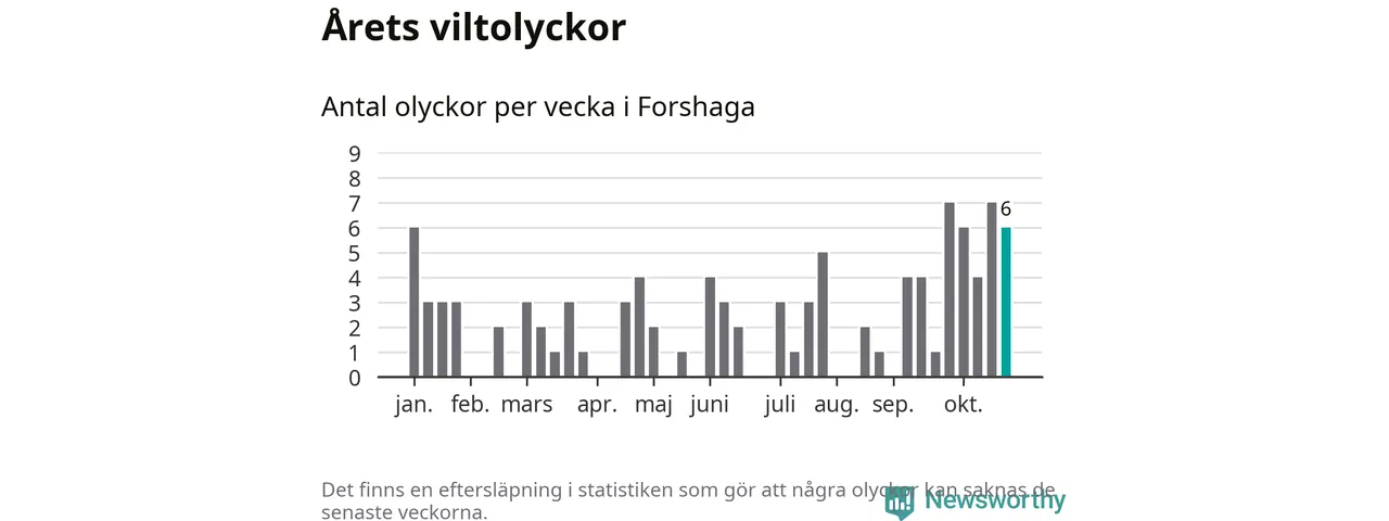 Hittills har sex viltolyckor rapporterats in i Forshaga kommun från vecka 44. Se listan här.