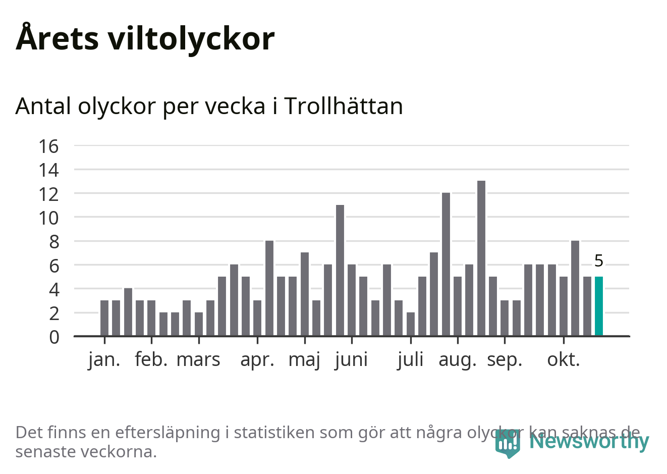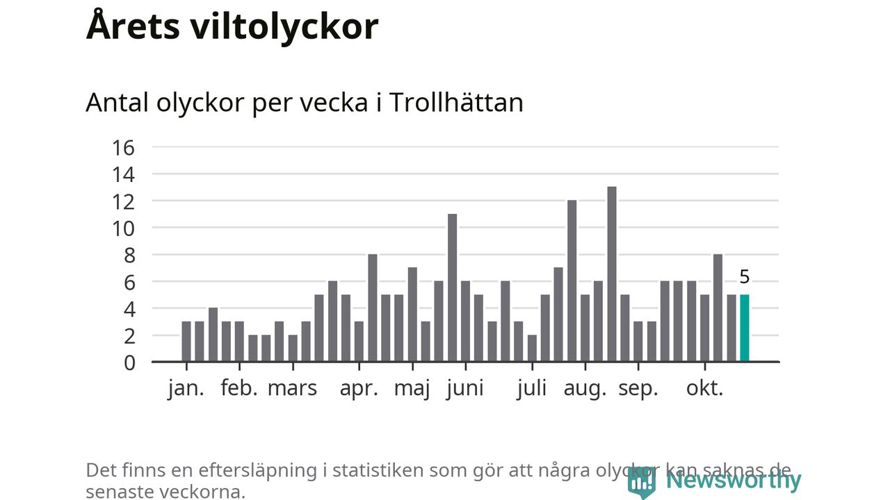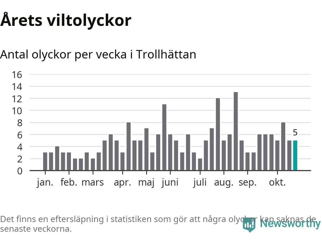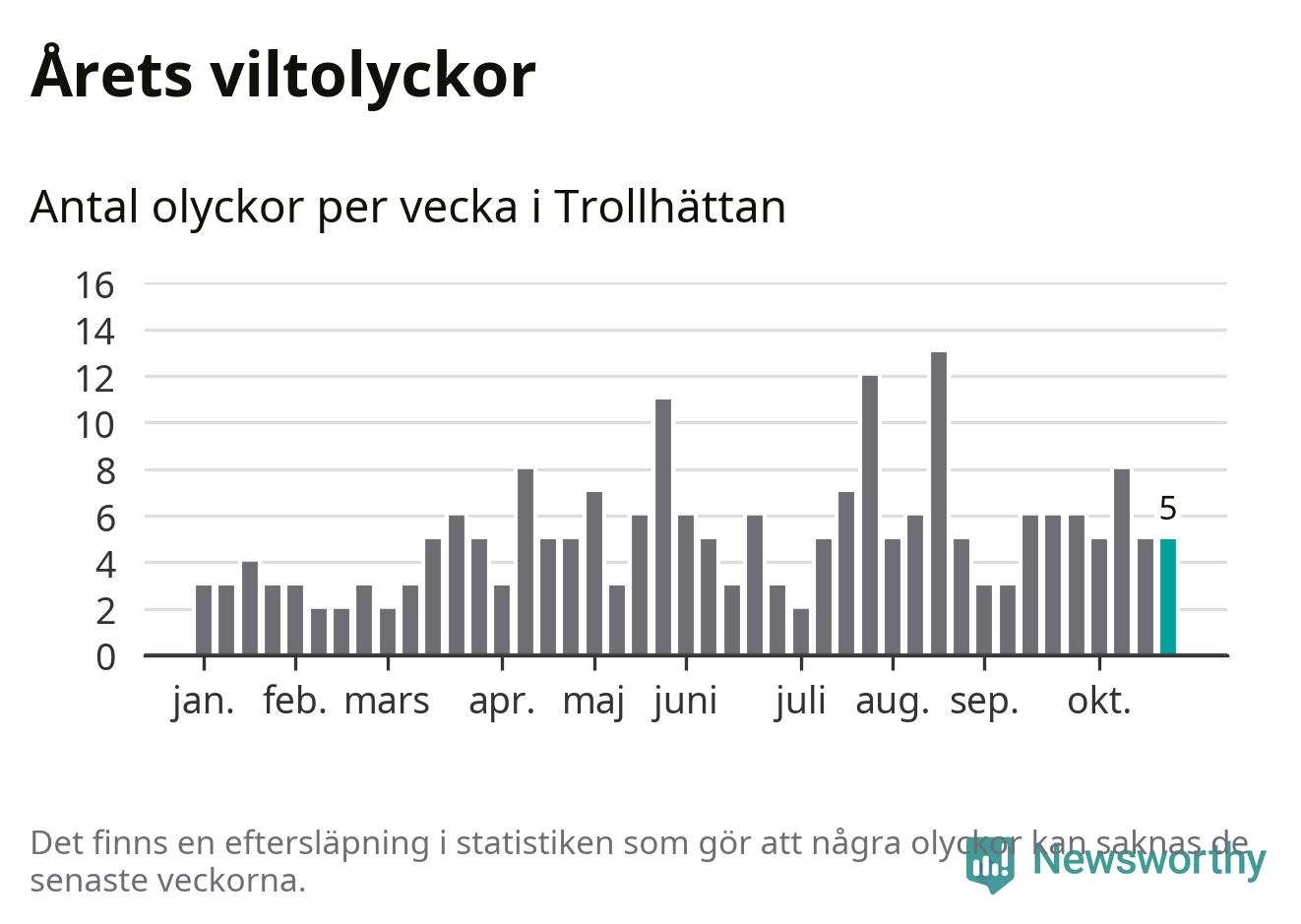 Hittills har fem viltolyckor rapporterats in i Trollhättans kommun från vecka 44. Se listan här.