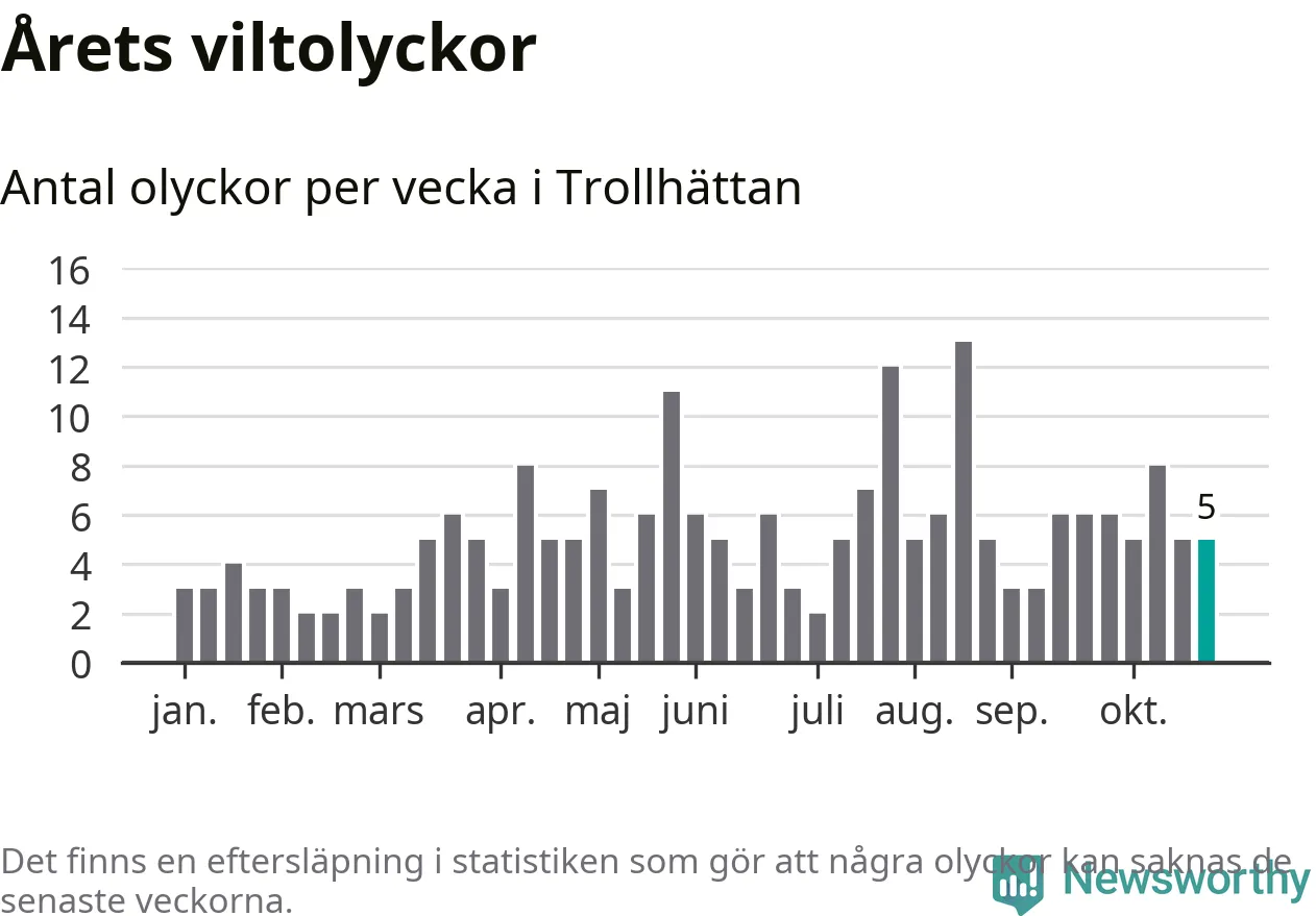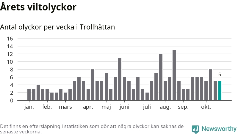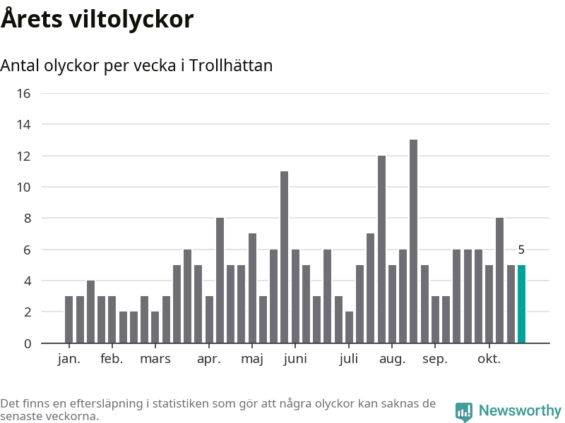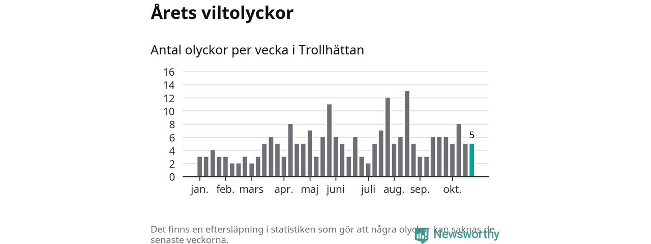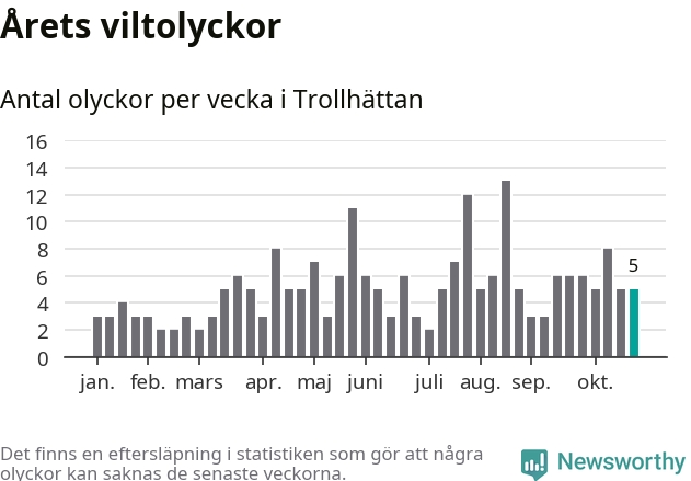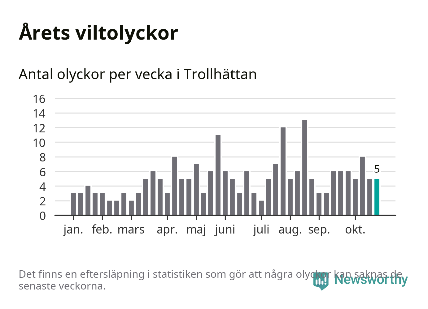 Hittills har fem viltolyckor rapporterats in i Trollhättans kommun från vecka 44. Se listan här.