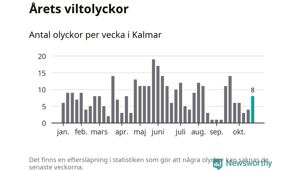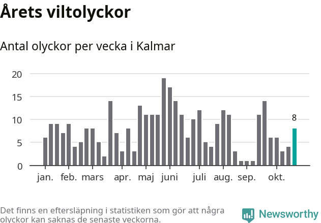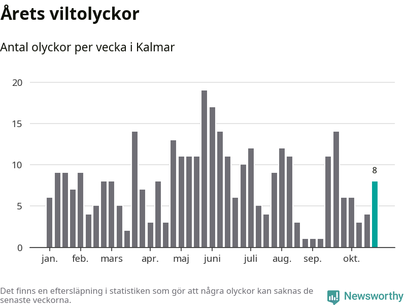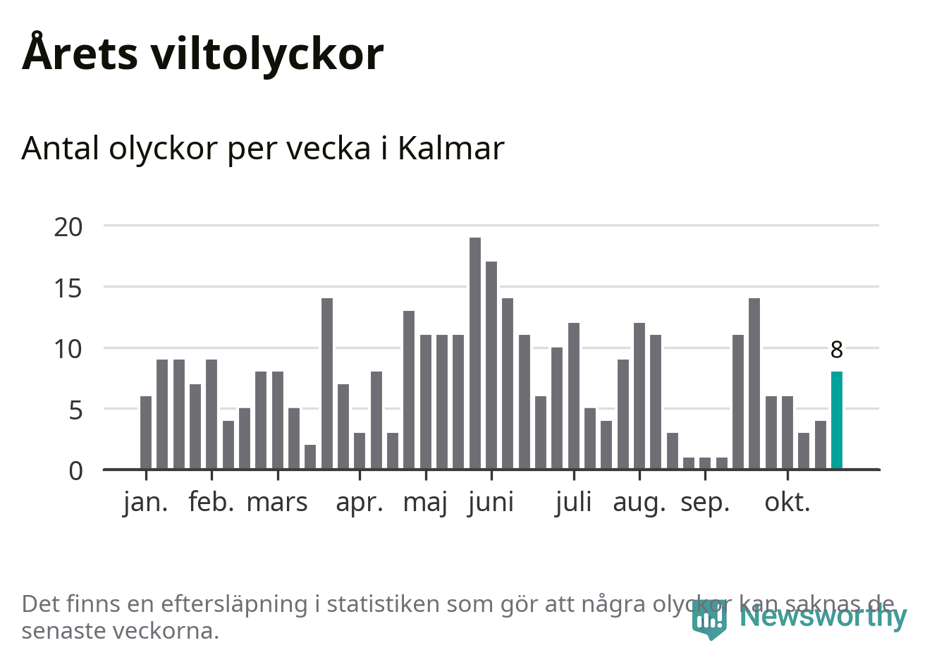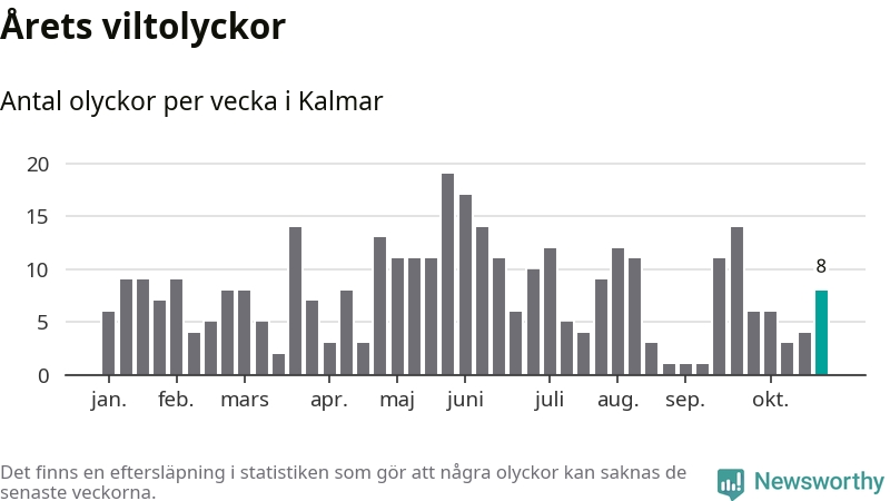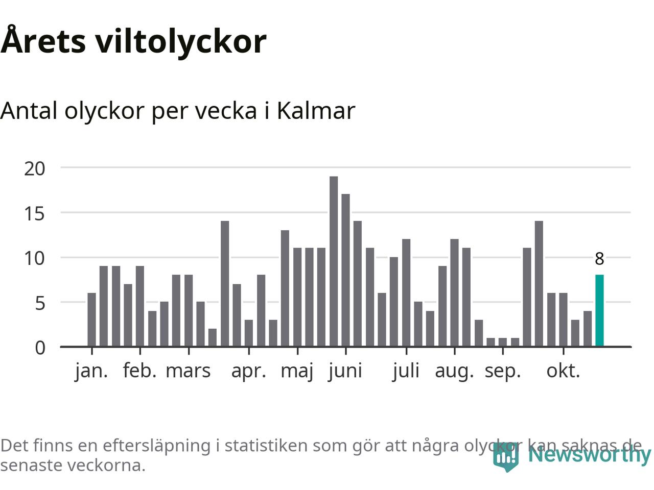 Hittills har åtta viltolyckor rapporterats in i Kalmar kommun från vecka 44. Se listan här.
