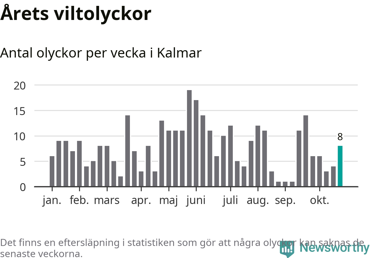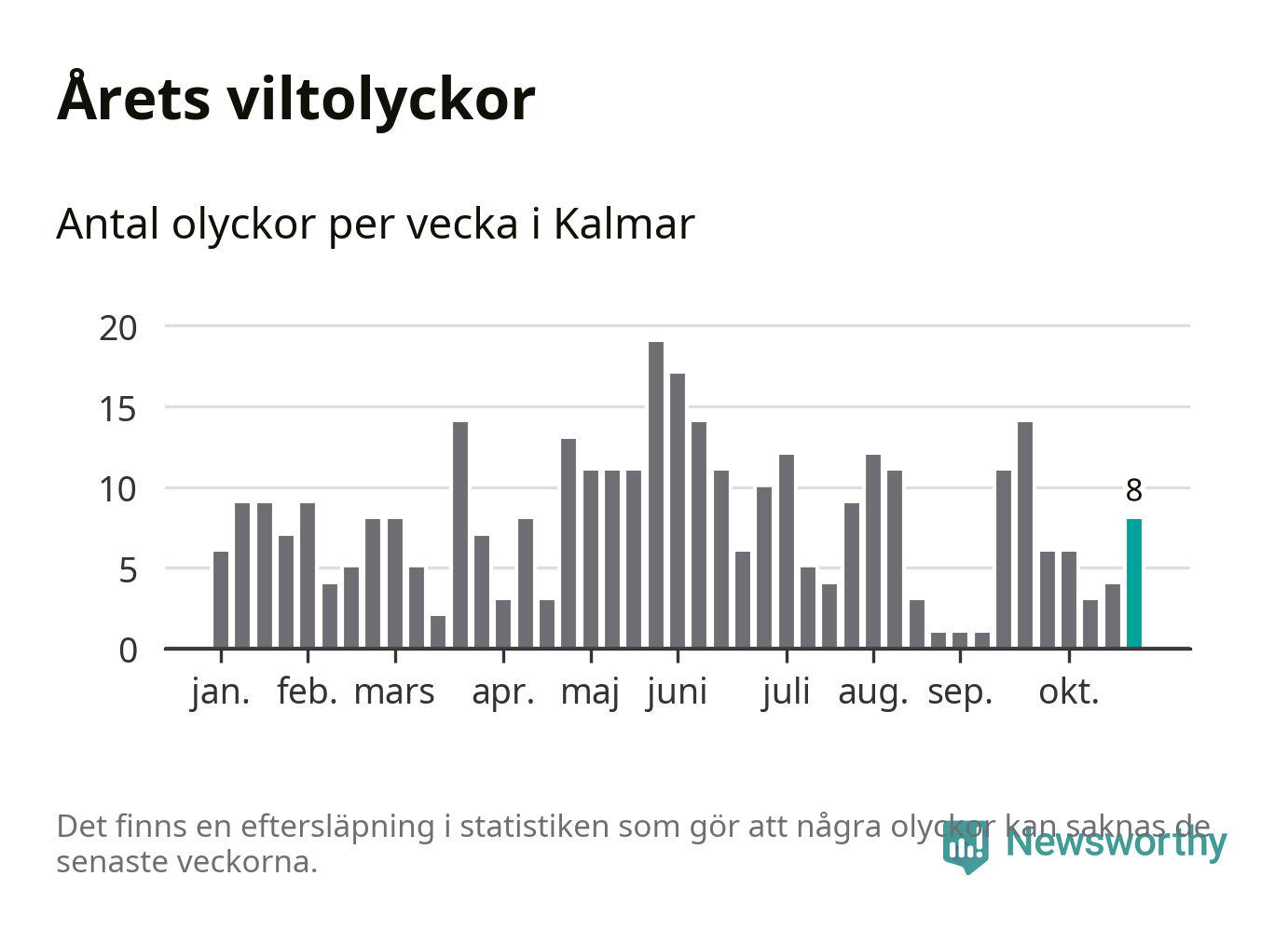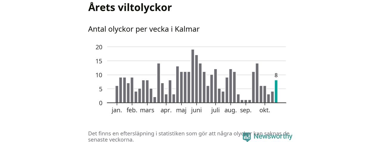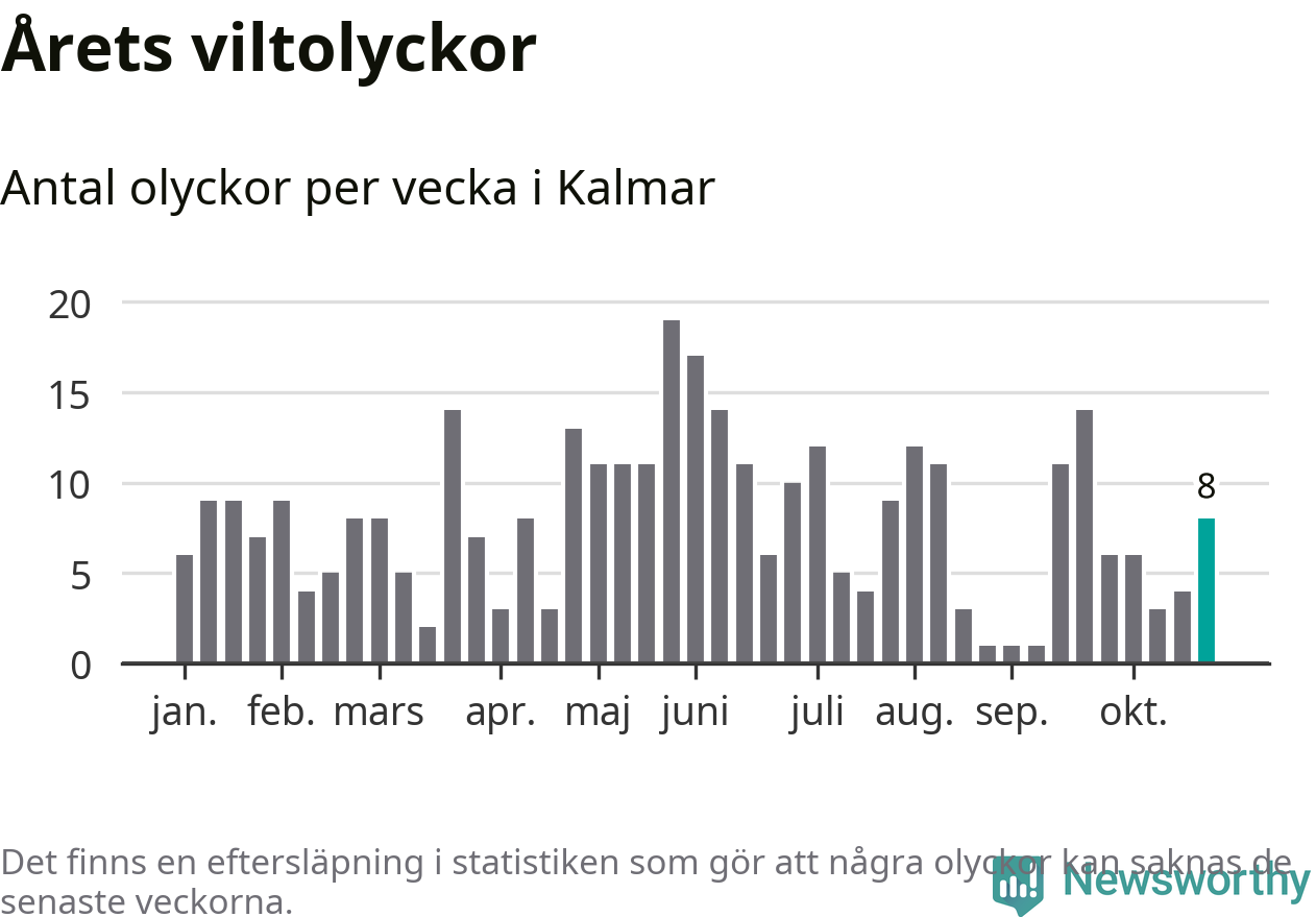 Hittills har åtta viltolyckor rapporterats in i Kalmar kommun från vecka 44. Se listan här.