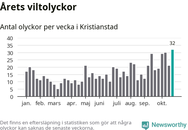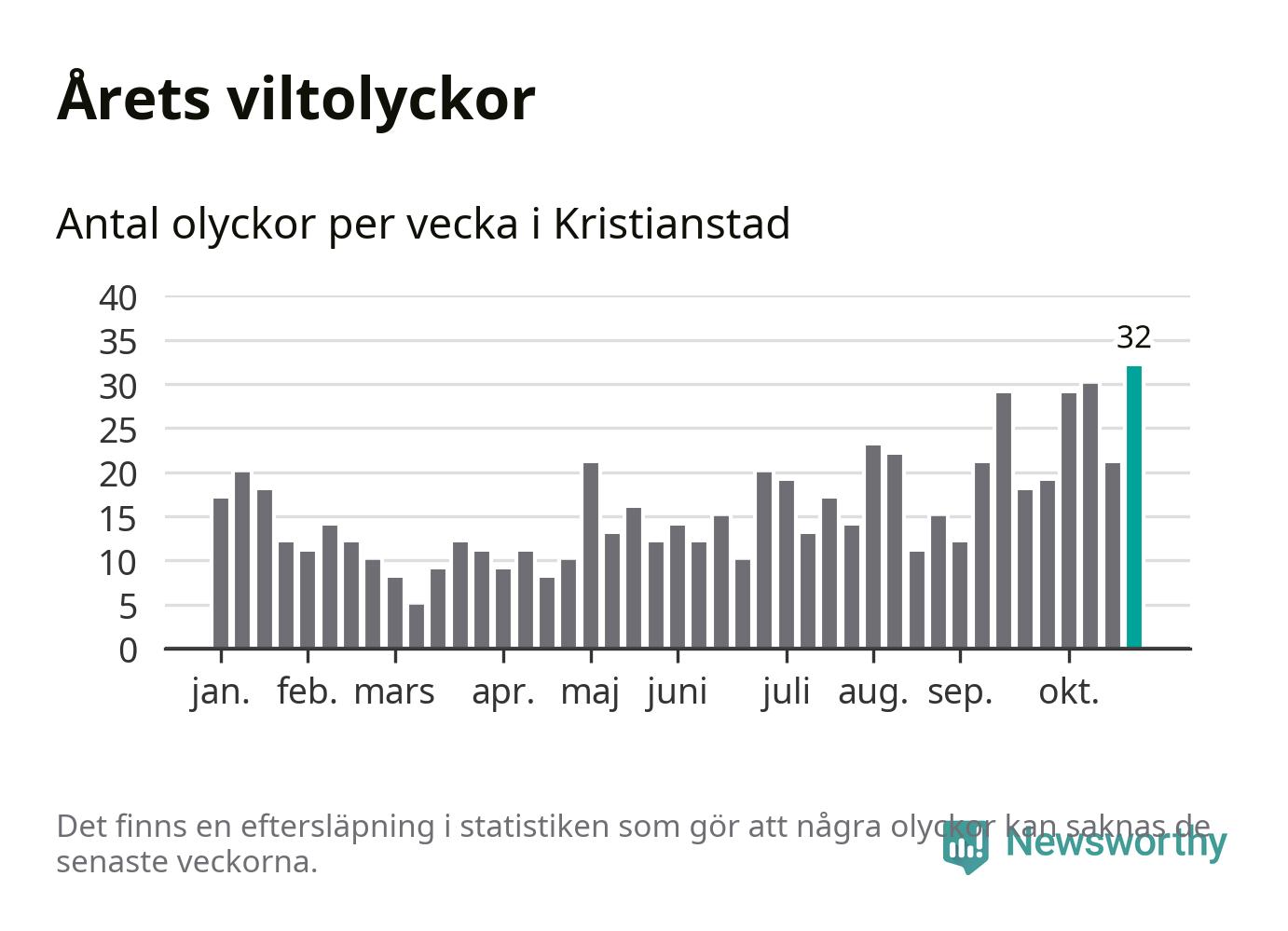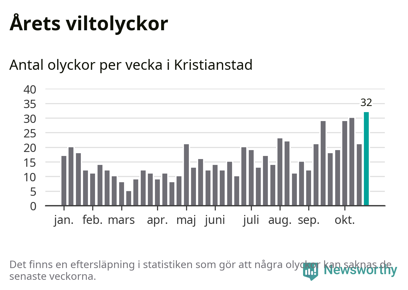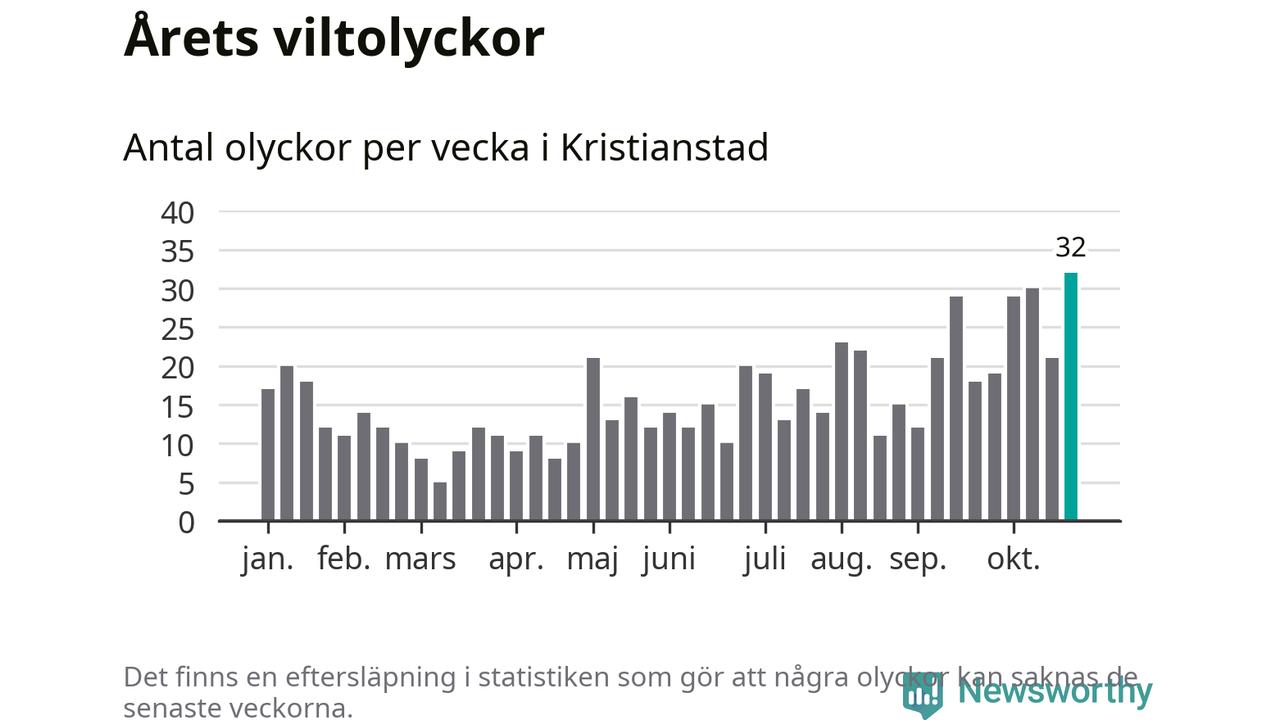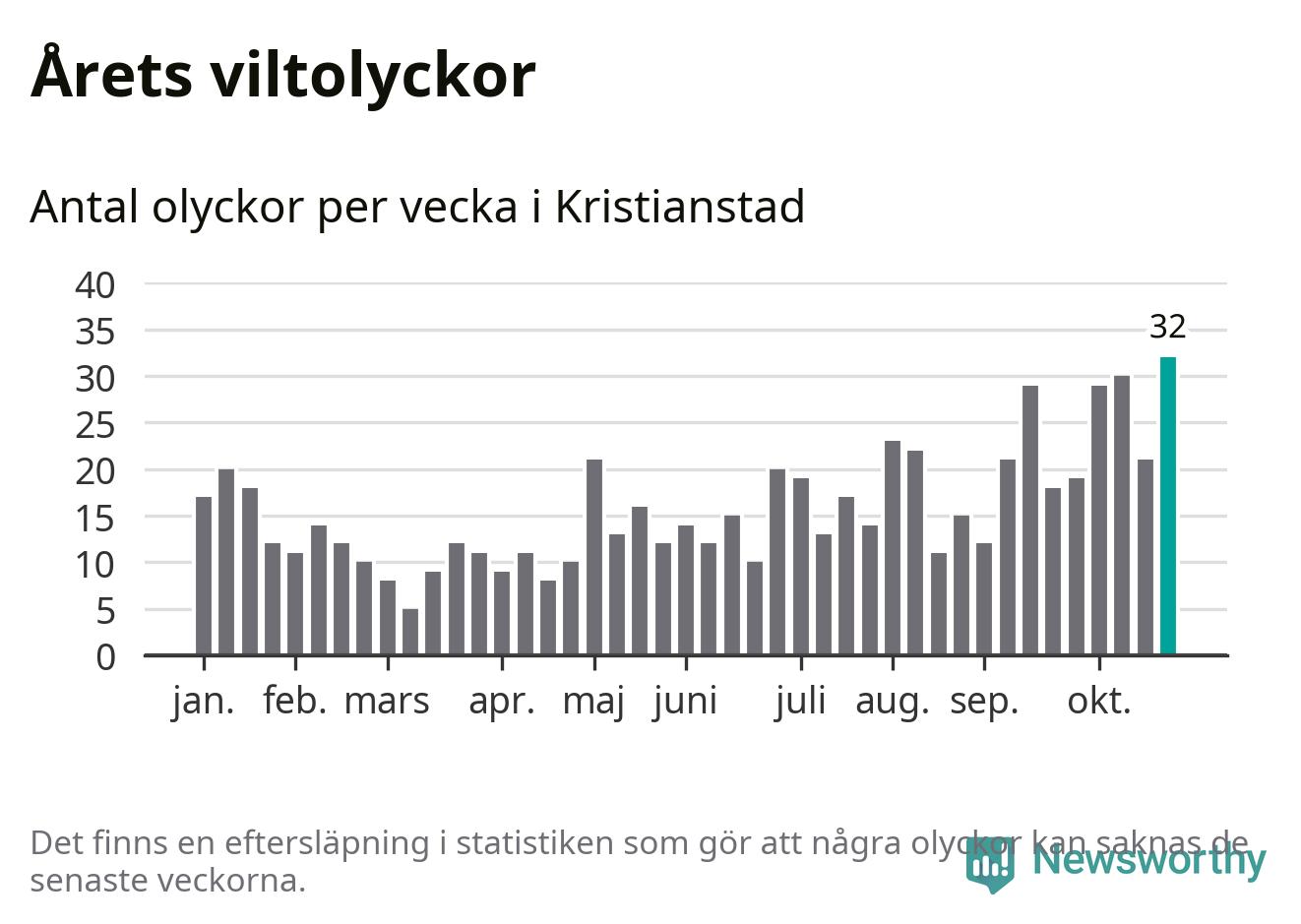 Under vecka 44 rapporterades 32 viltolyckor in i Kristianstads kommun. Det är det största antalet på en enskild vecka hittills i år.