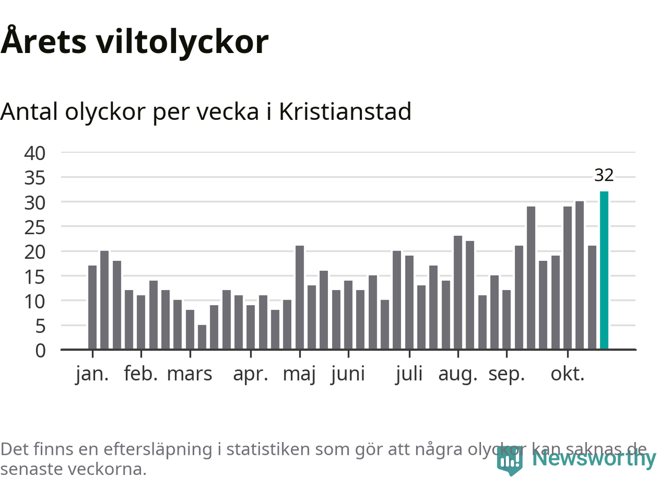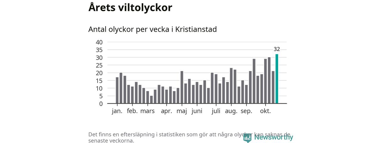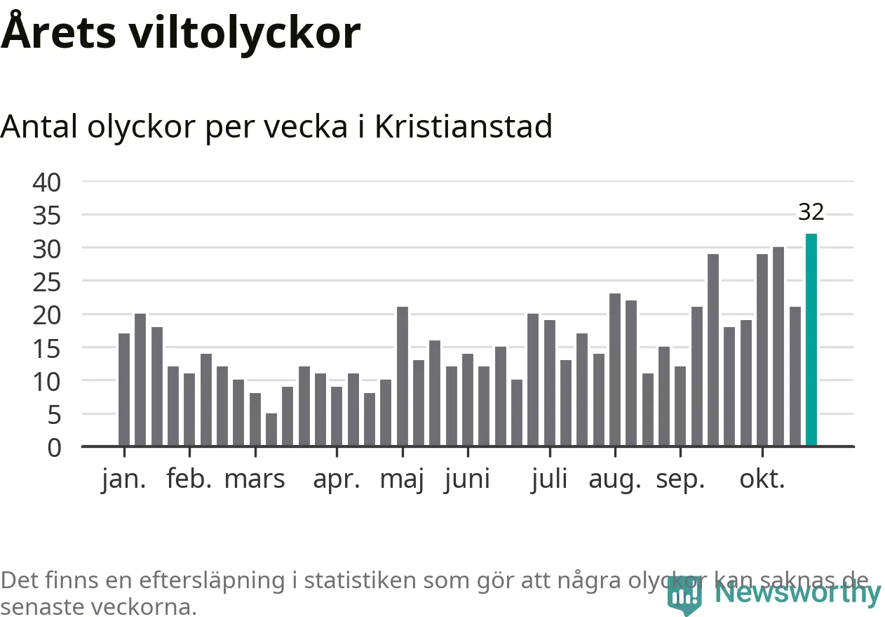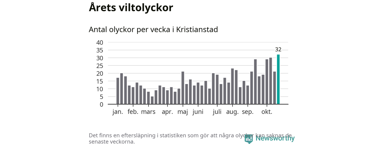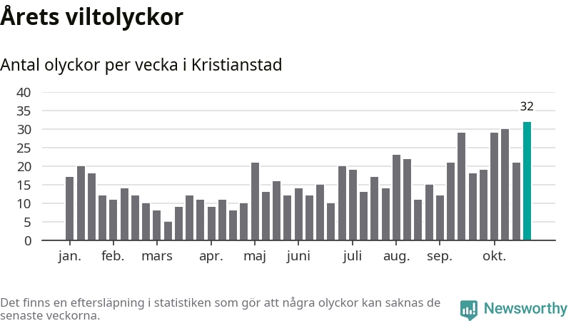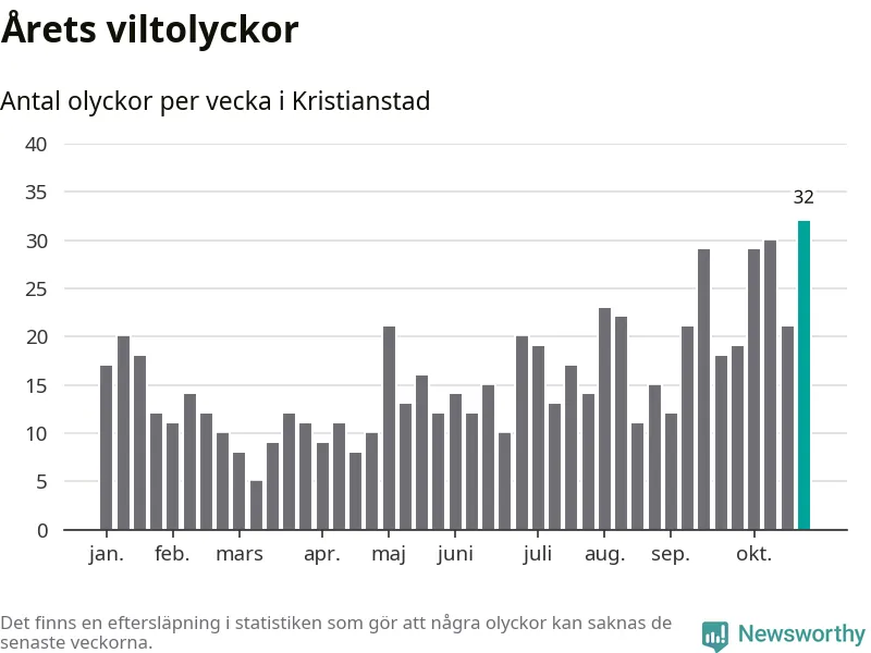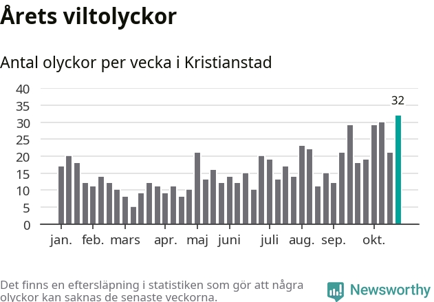 Under vecka 44 rapporterades 32 viltolyckor in i Kristianstads kommun. Det är det största antalet på en enskild vecka hittills i år.