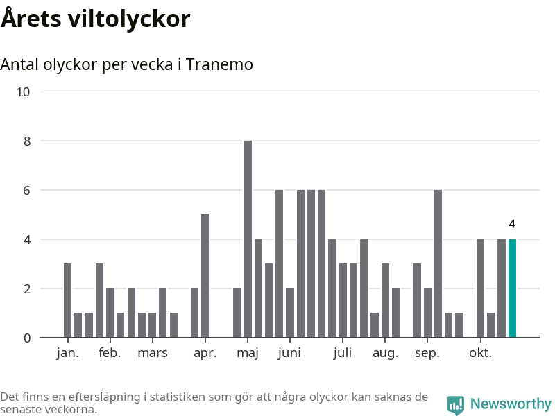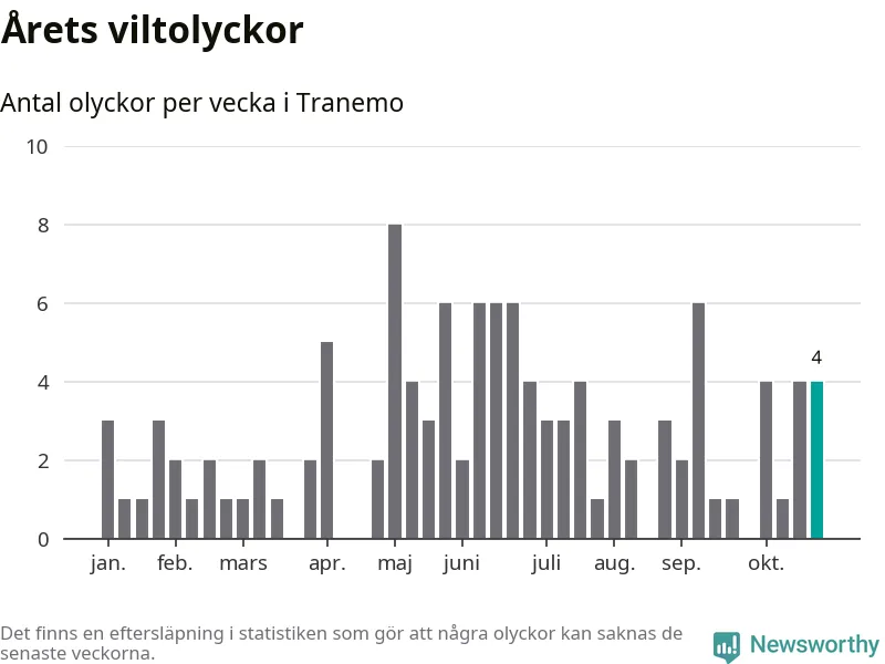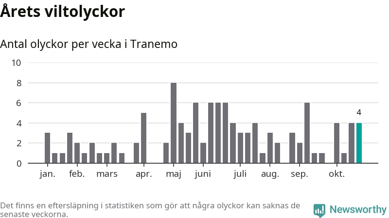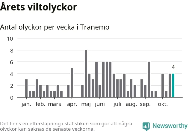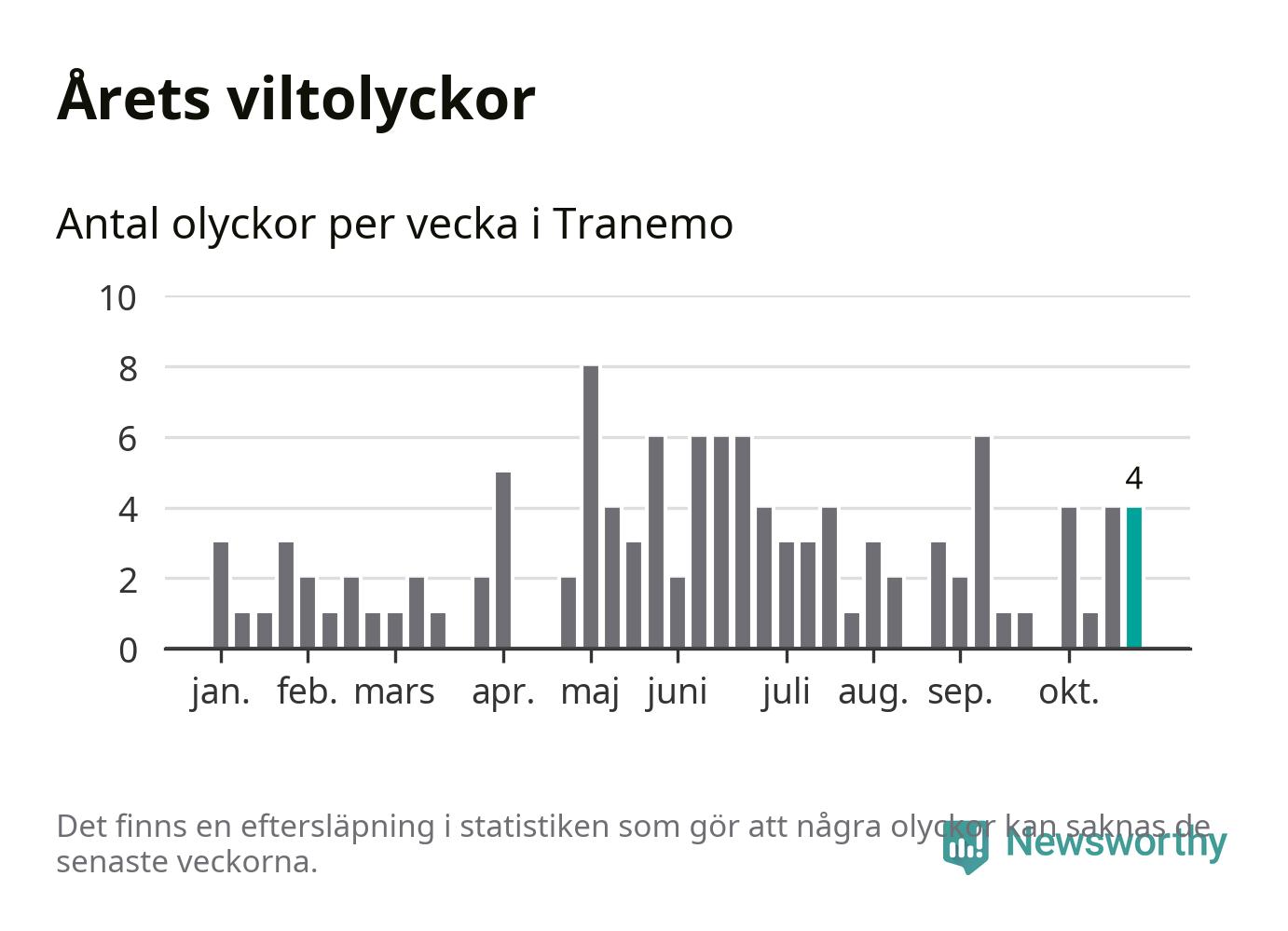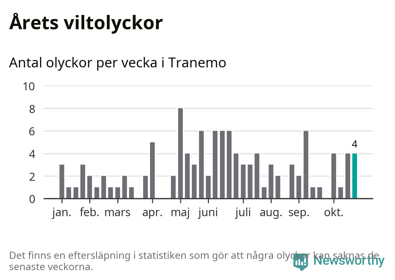 Hittills har fyra viltolyckor rapporterats in i Tranemo kommun från vecka 44. Se listan här.