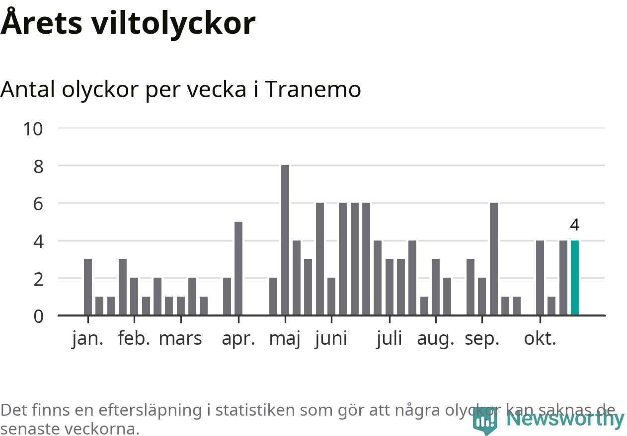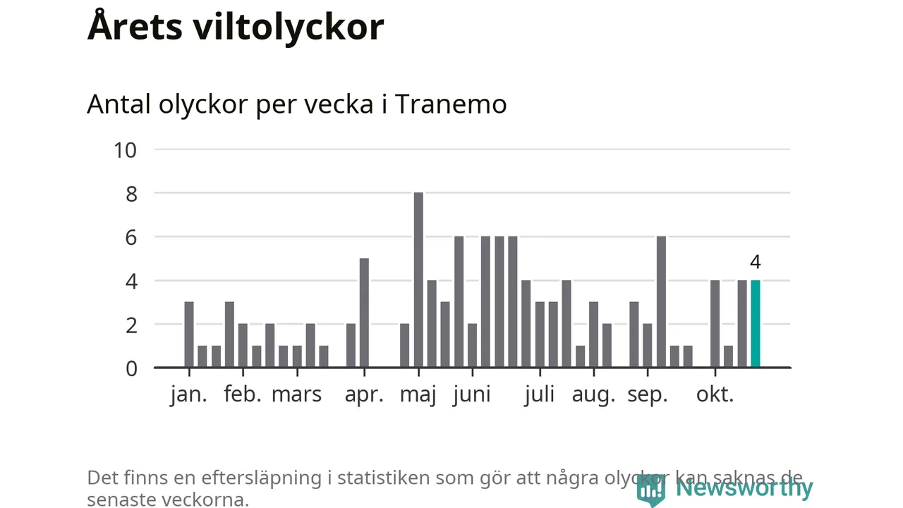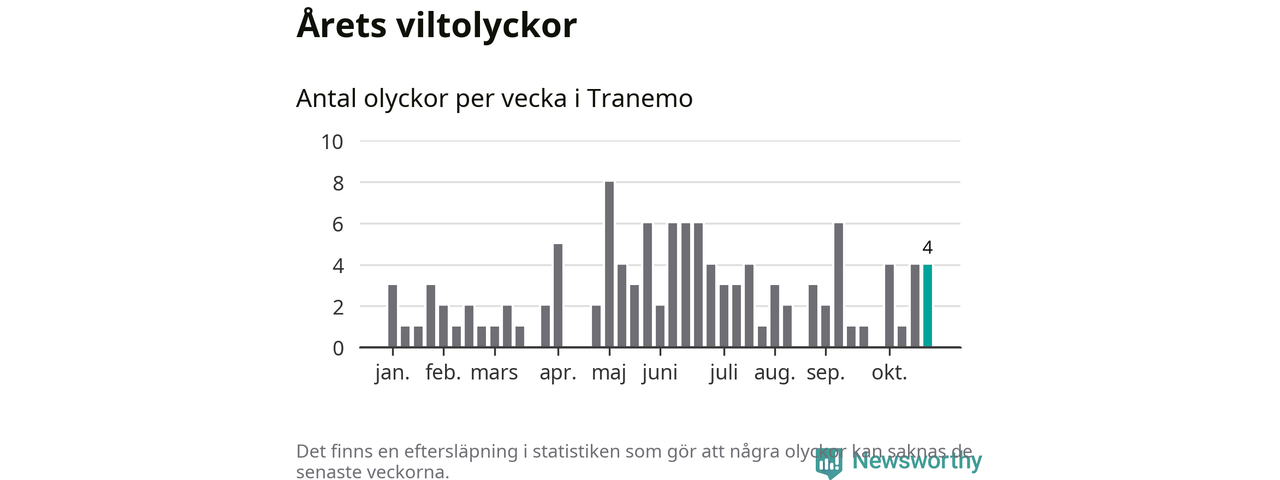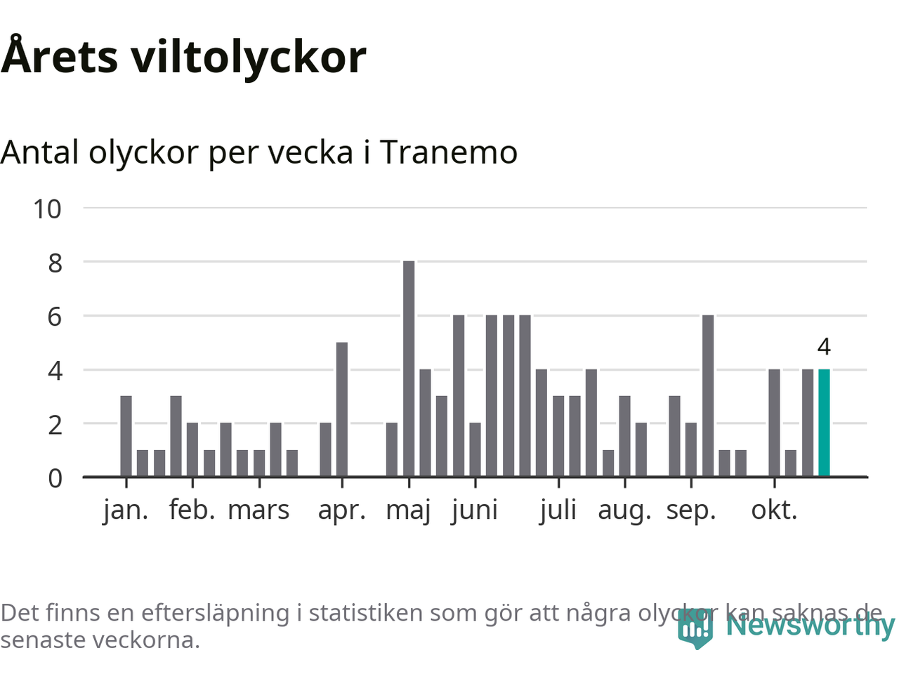 Hittills har fyra viltolyckor rapporterats in i Tranemo kommun från vecka 44. Se listan här.
