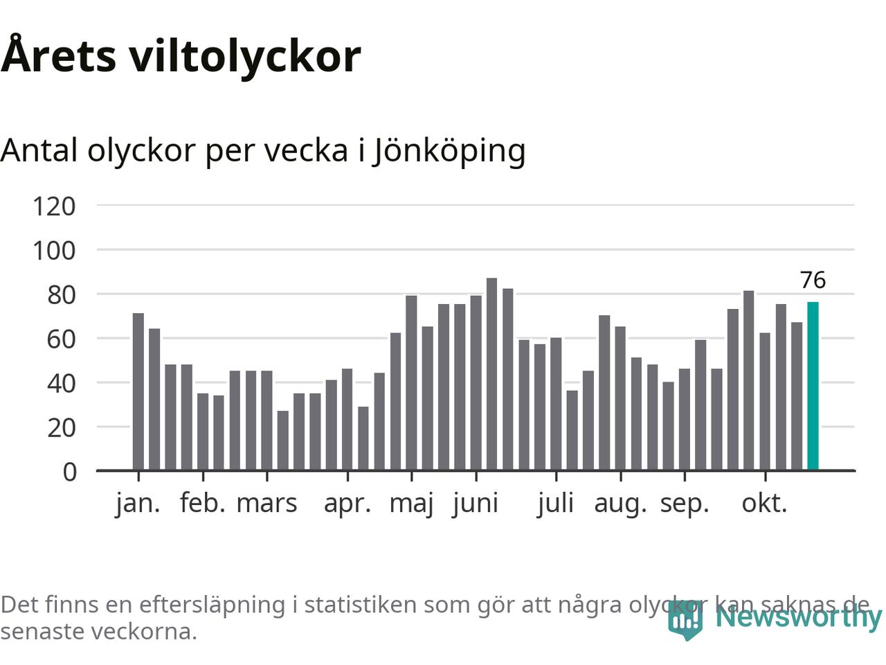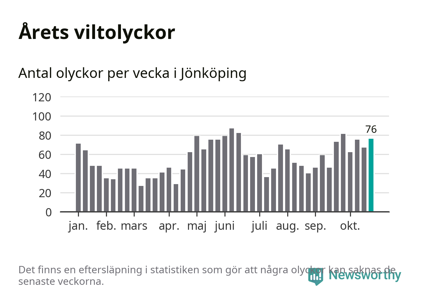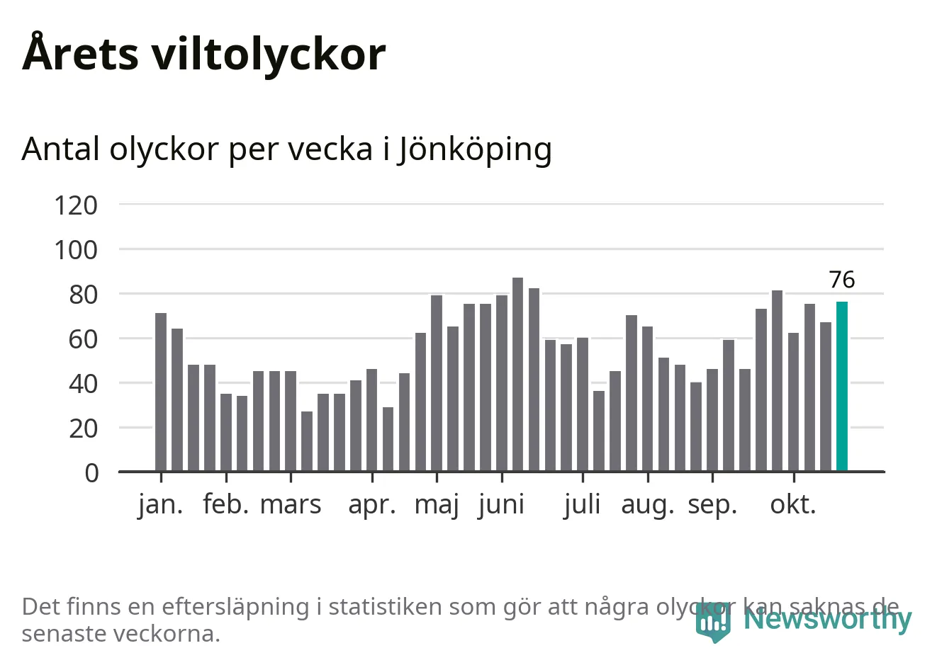Hittills har 76 viltolyckor rapporterats in i Jönköpings län från vecka 44. Se listan här.