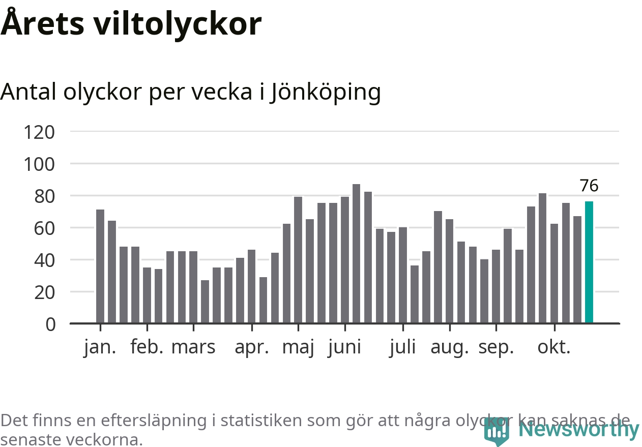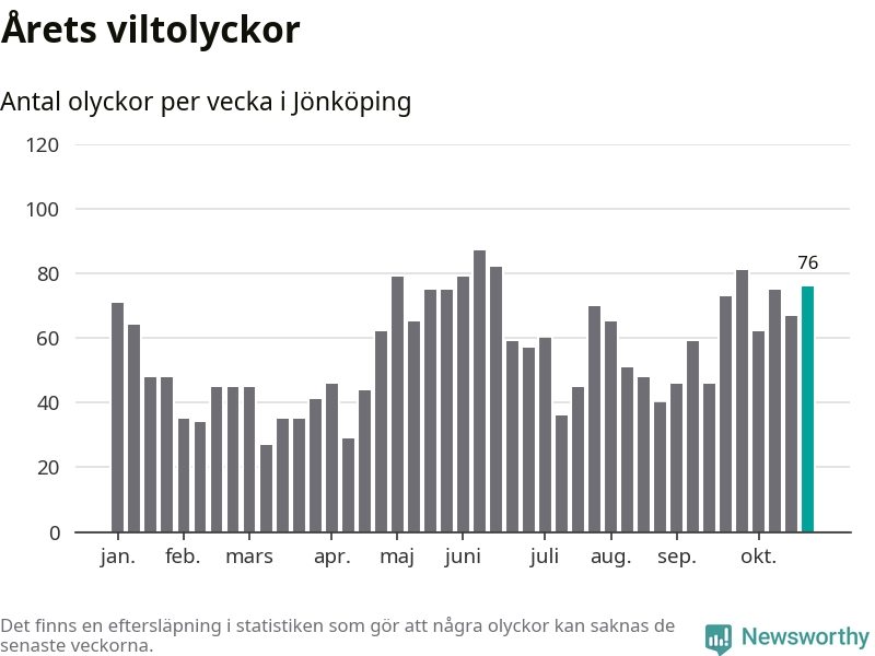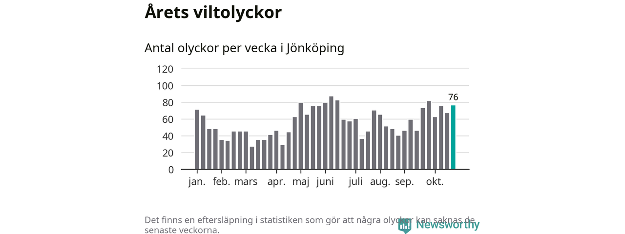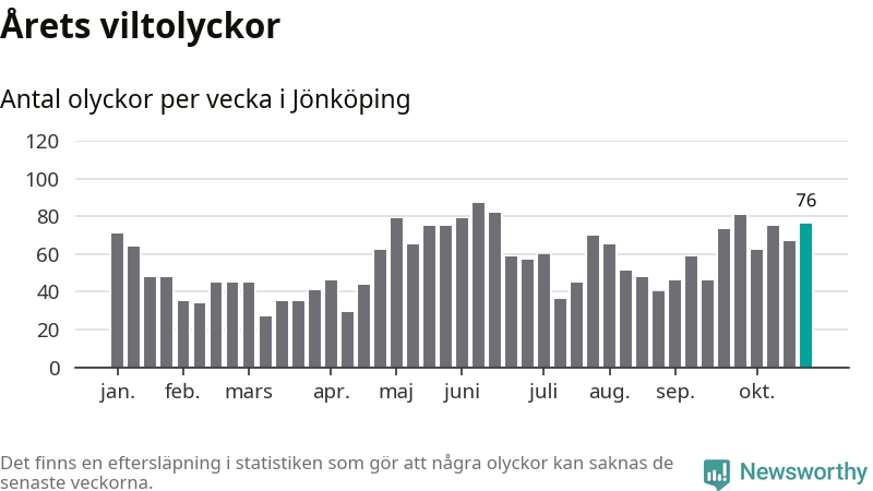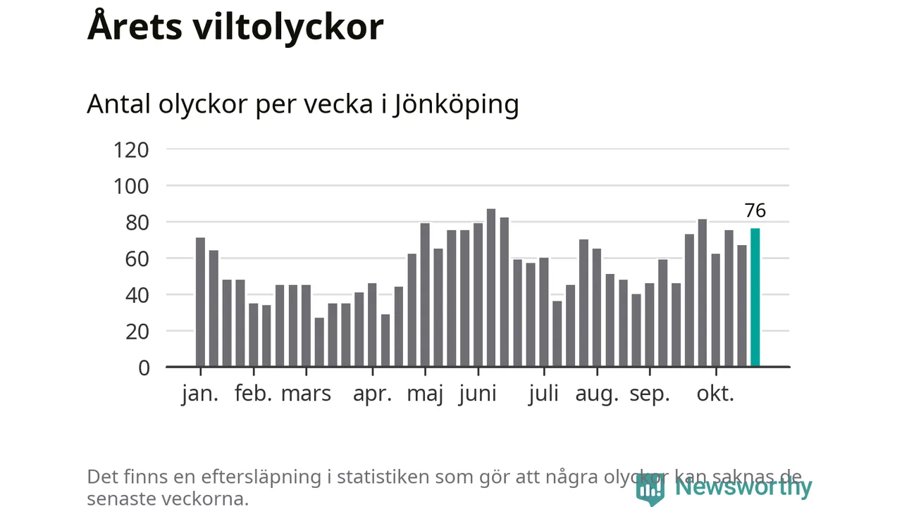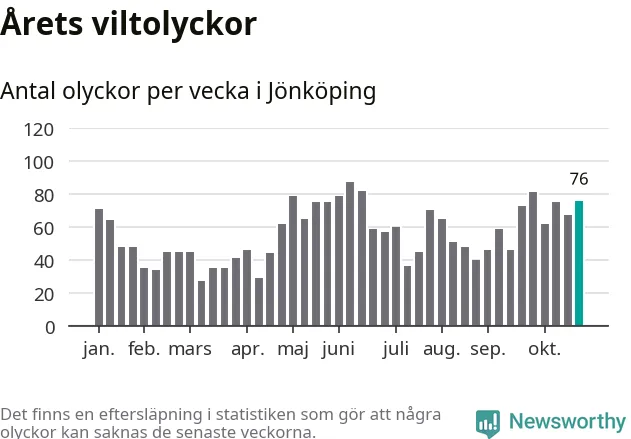 Hittills har 76 viltolyckor rapporterats in i Jönköpings län från vecka 44. Se listan här.
