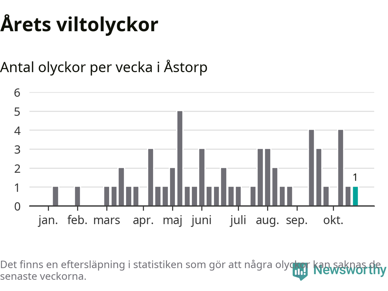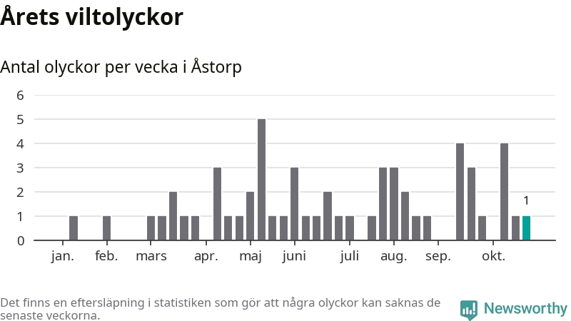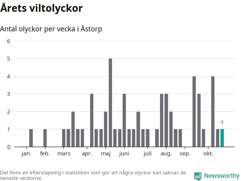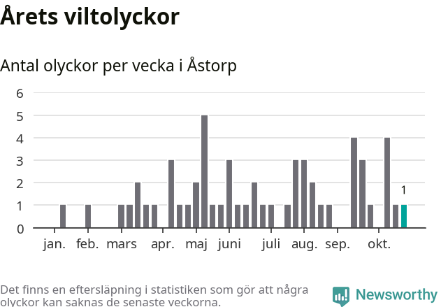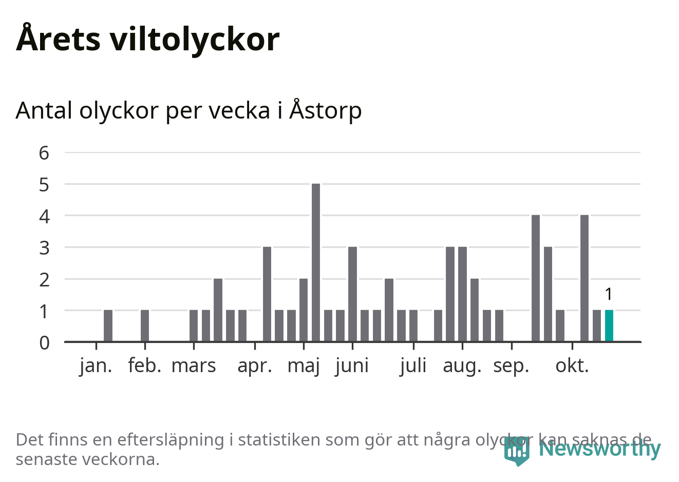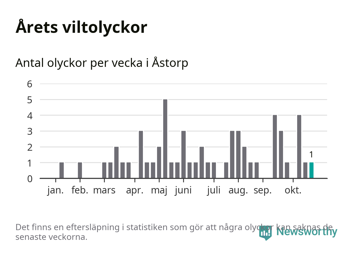 Från förra veckan (vecka 44) har hittills en viltolycka rapporterats in i Åstorps kommun.