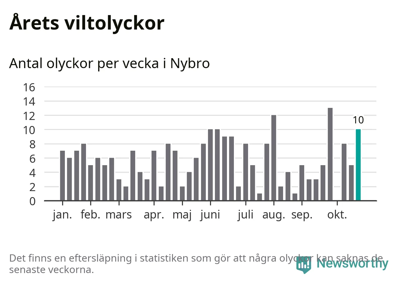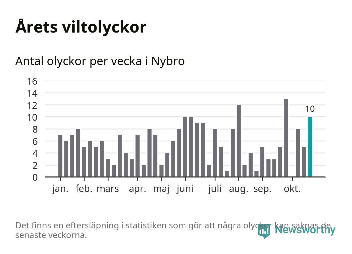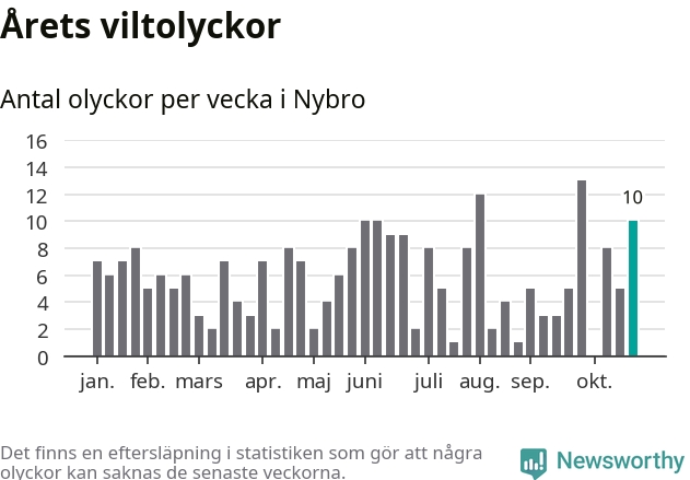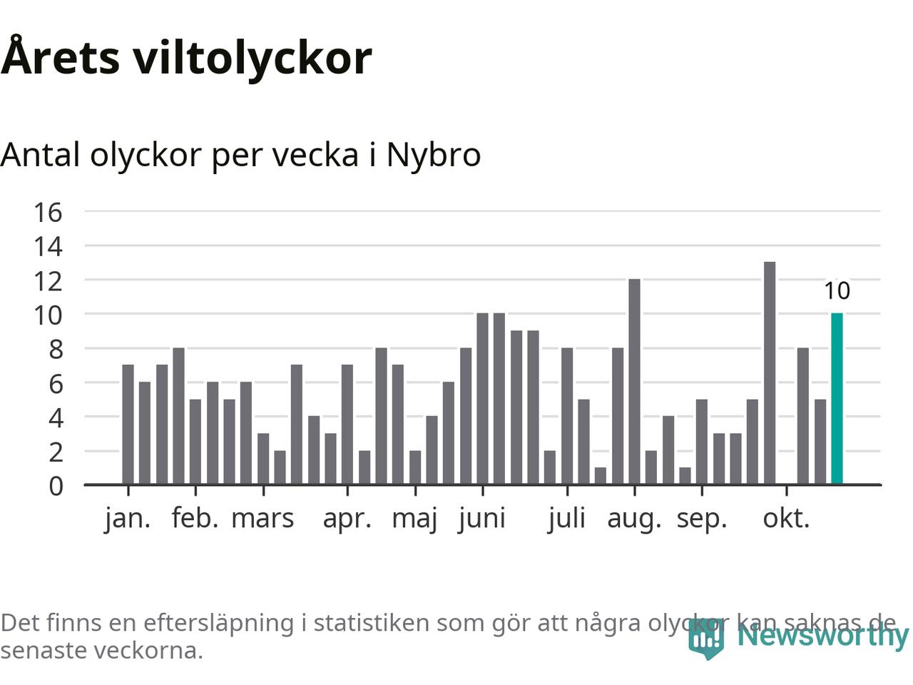 Hittills har tio viltolyckor rapporterats in i Nybro kommun från vecka 44. Se listan här.