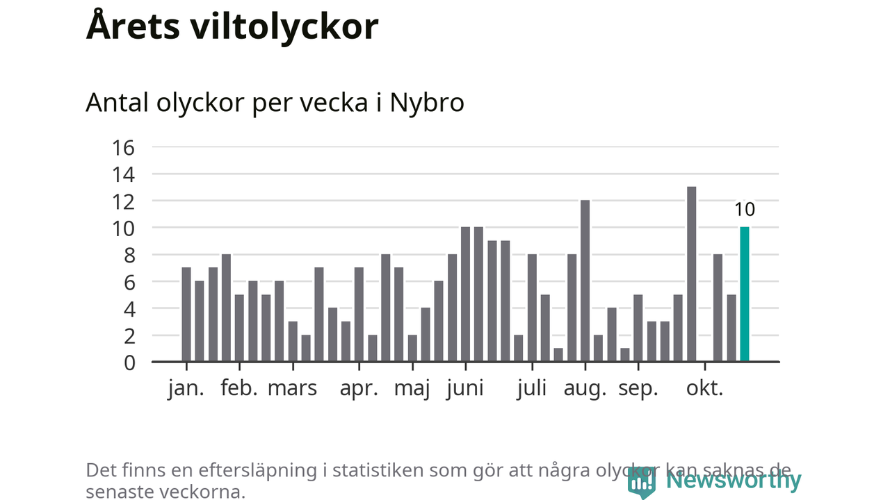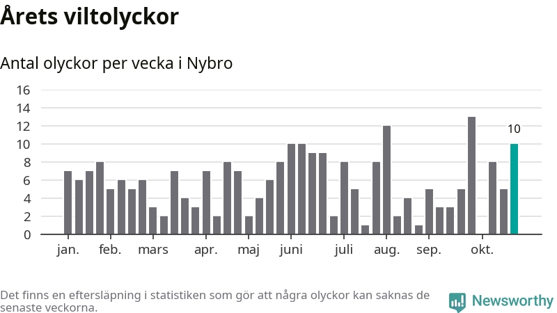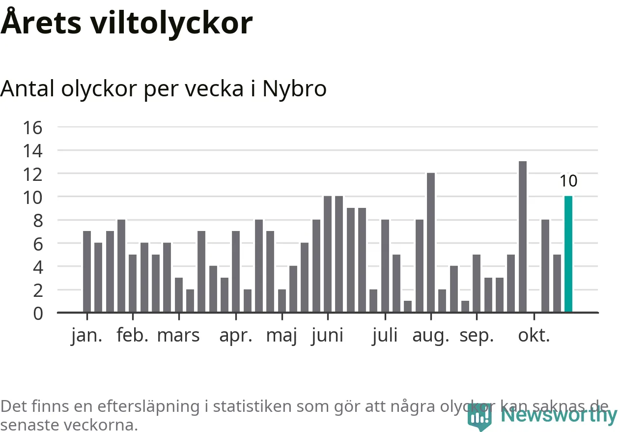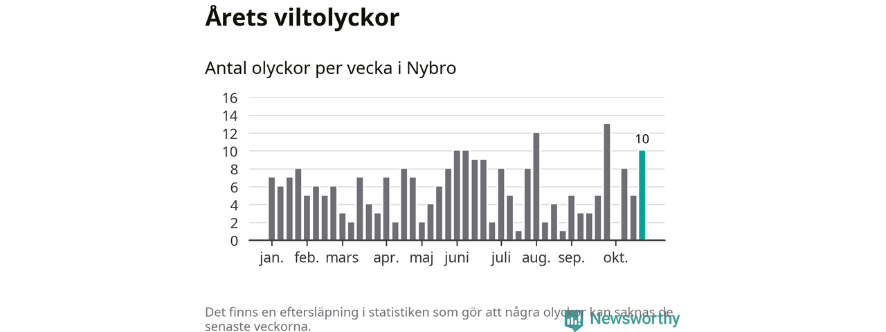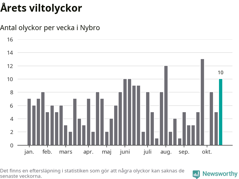 Hittills har tio viltolyckor rapporterats in i Nybro kommun från vecka 44. Se listan här.