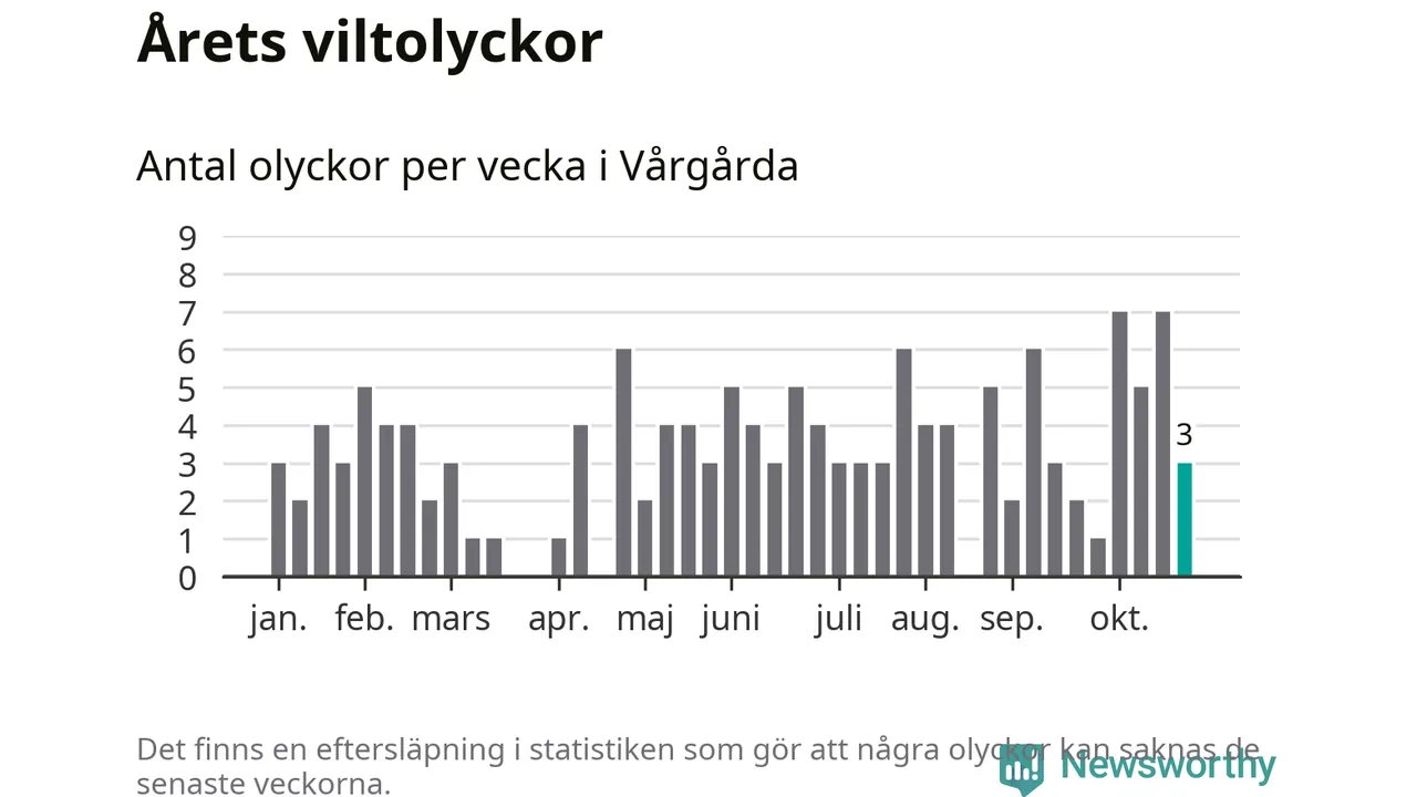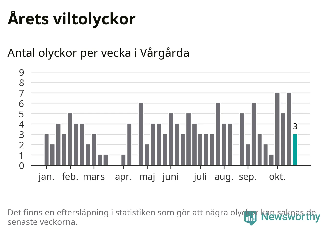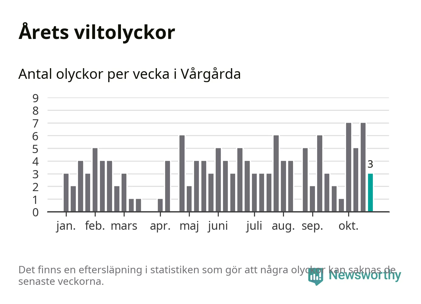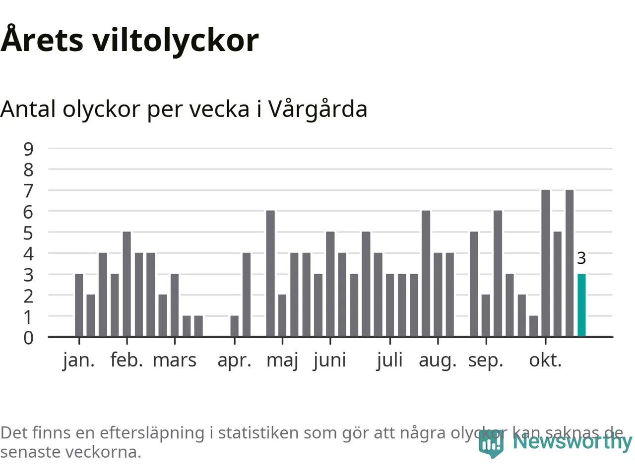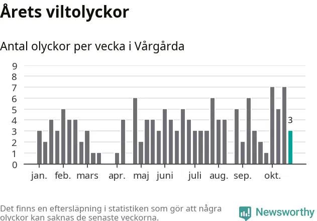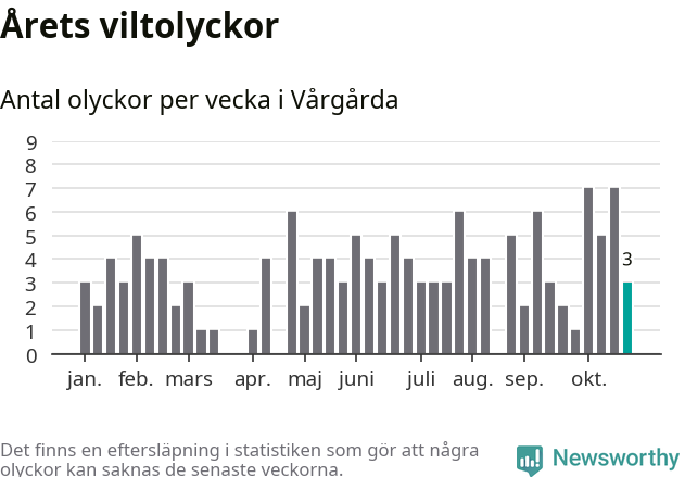 Hittills har tre viltolyckor rapporterats in i Vårgårda kommun från vecka 44. Se listan här.