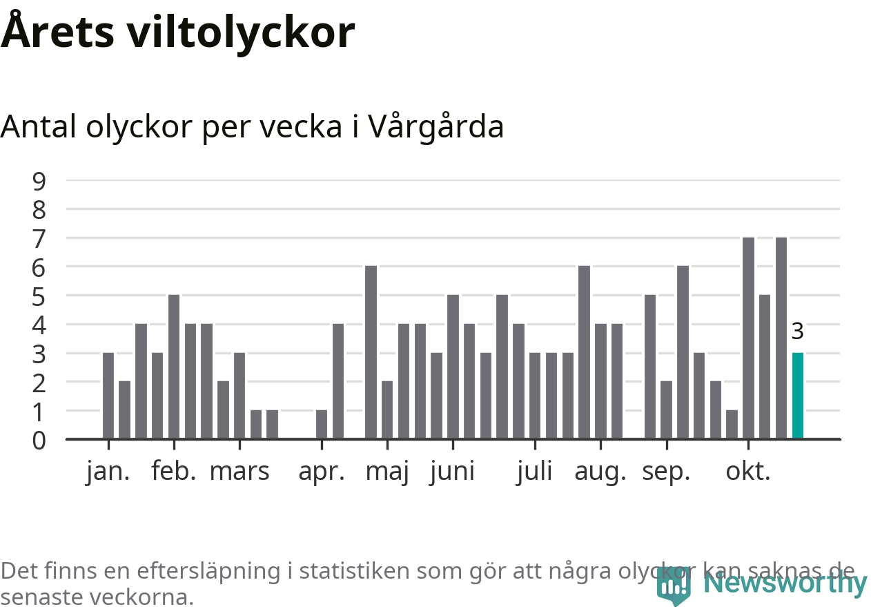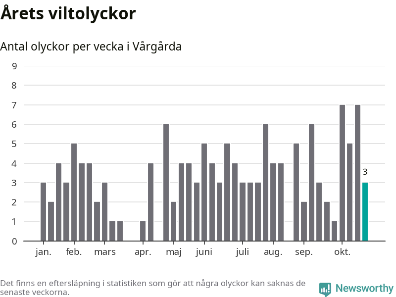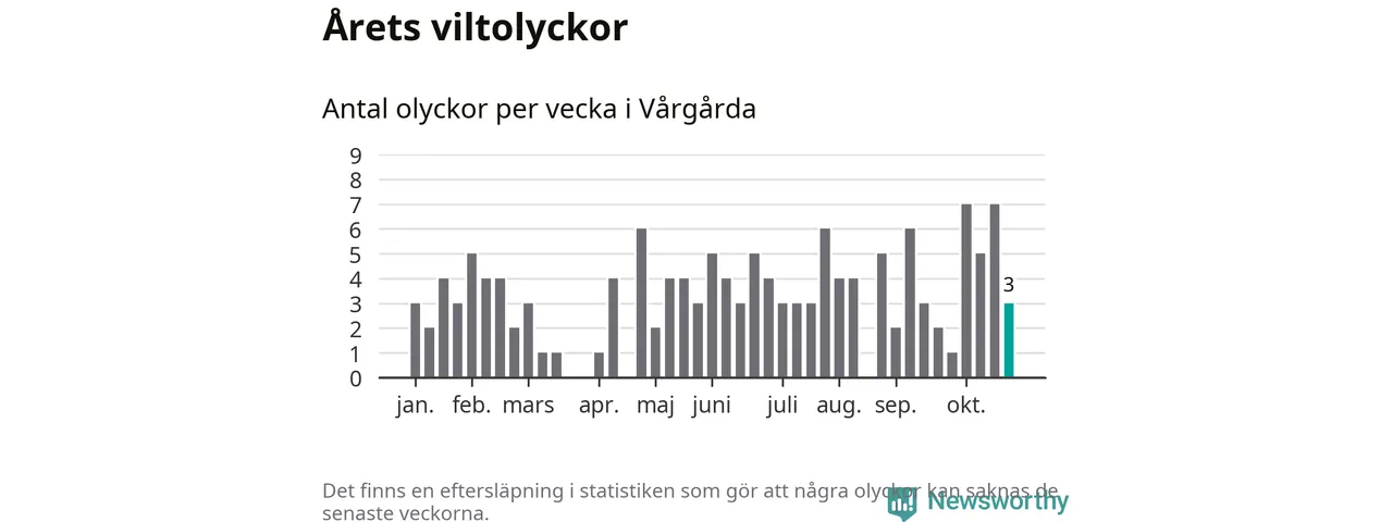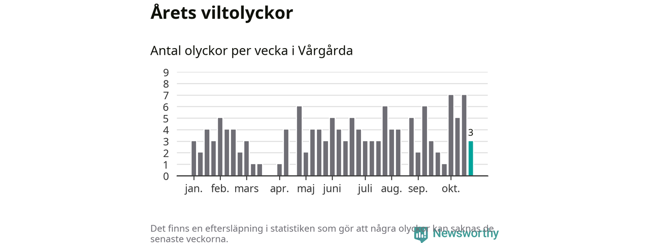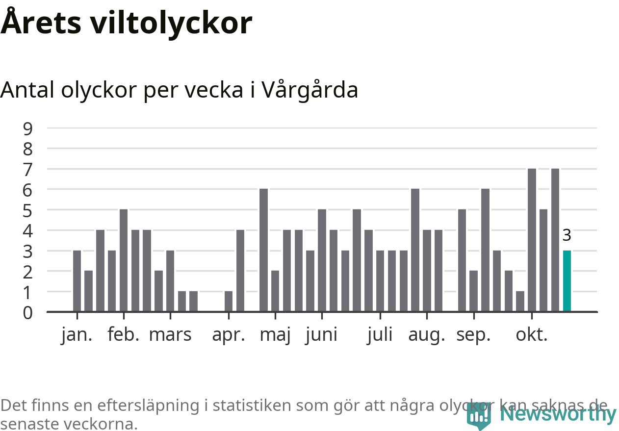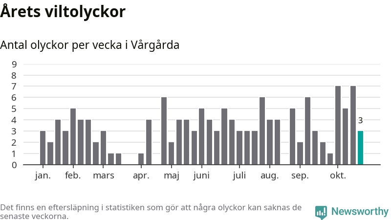 Hittills har tre viltolyckor rapporterats in i Vårgårda kommun från vecka 44. Se listan här.