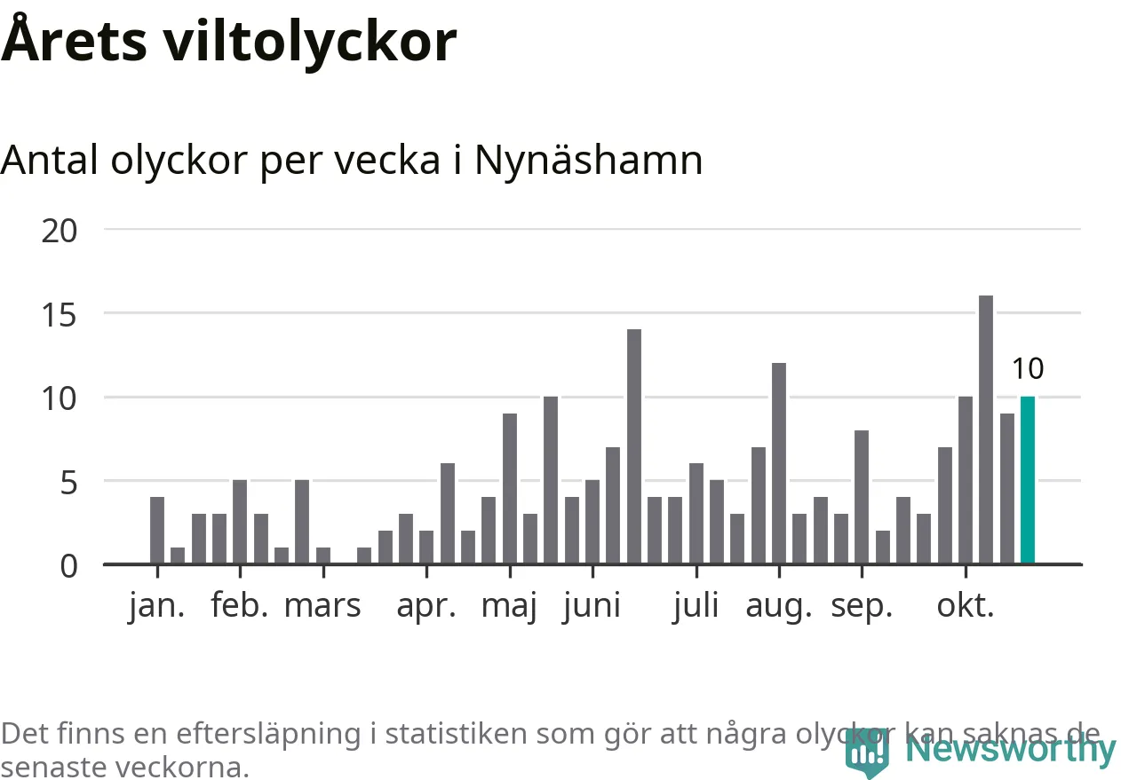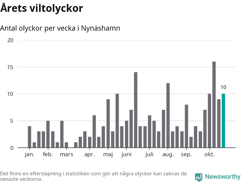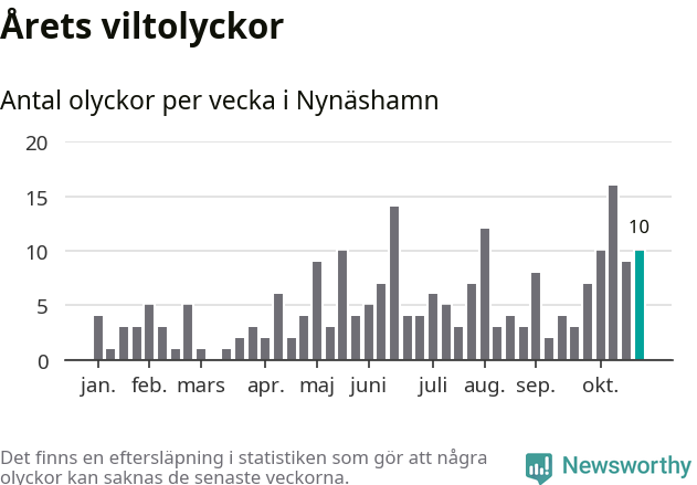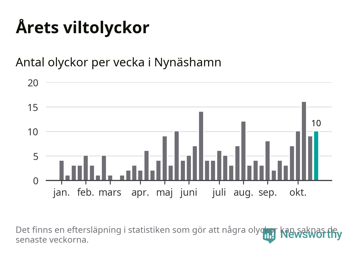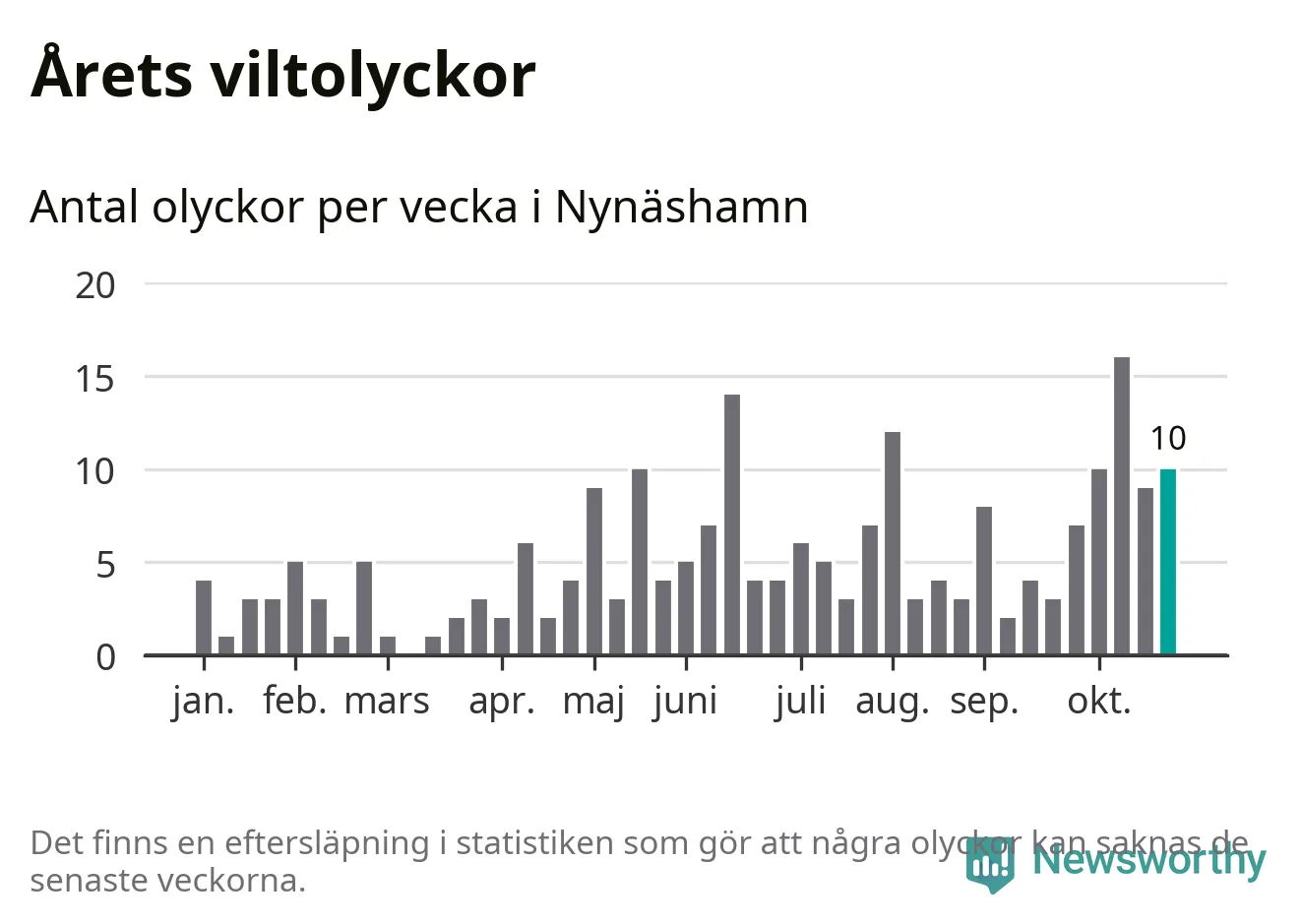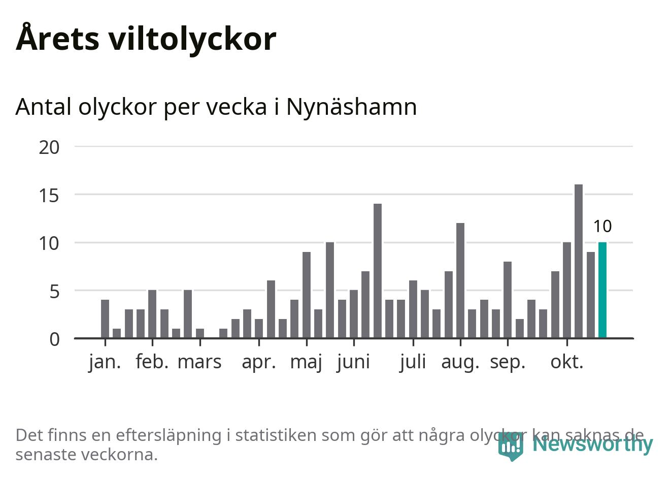 Hittills har tio viltolyckor rapporterats in i Nynäshamns kommun från vecka 44. Se listan här.