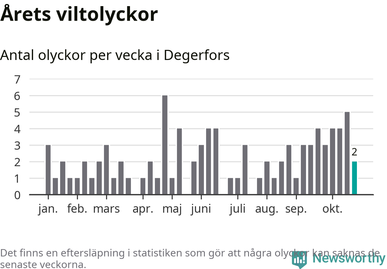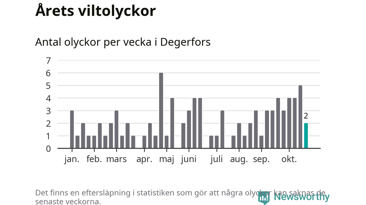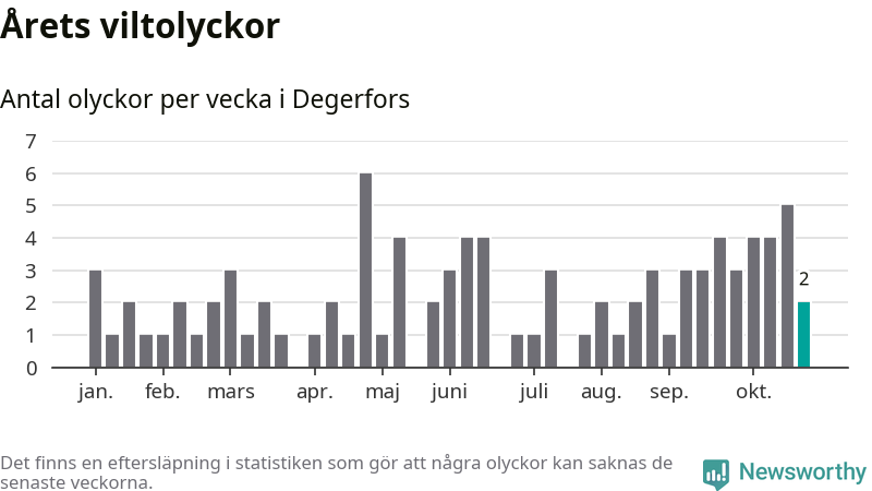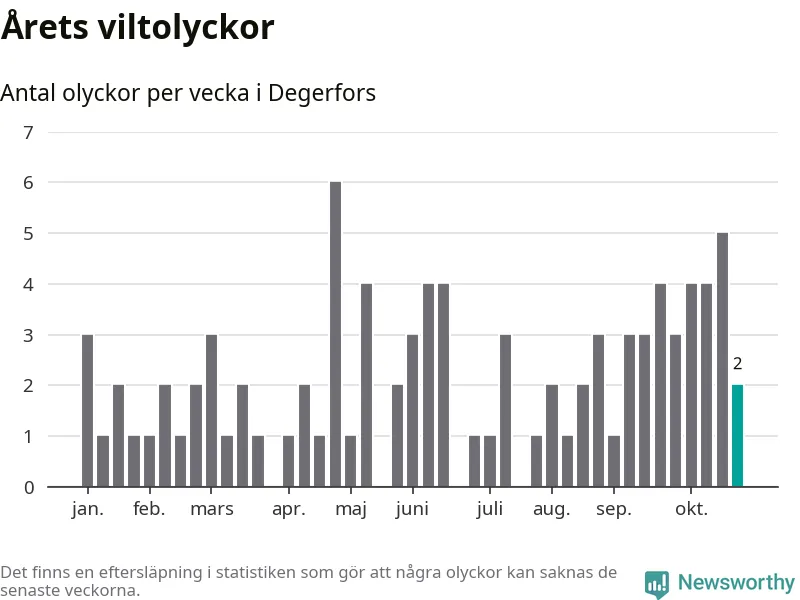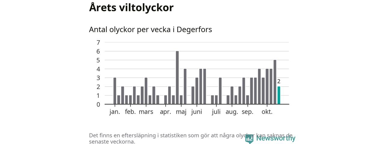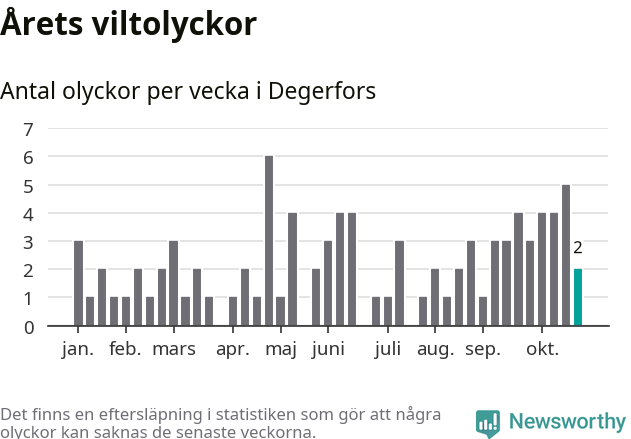 Hittills har två viltolyckor rapporterats in i Degerfors kommun från vecka 44. Se listan här.