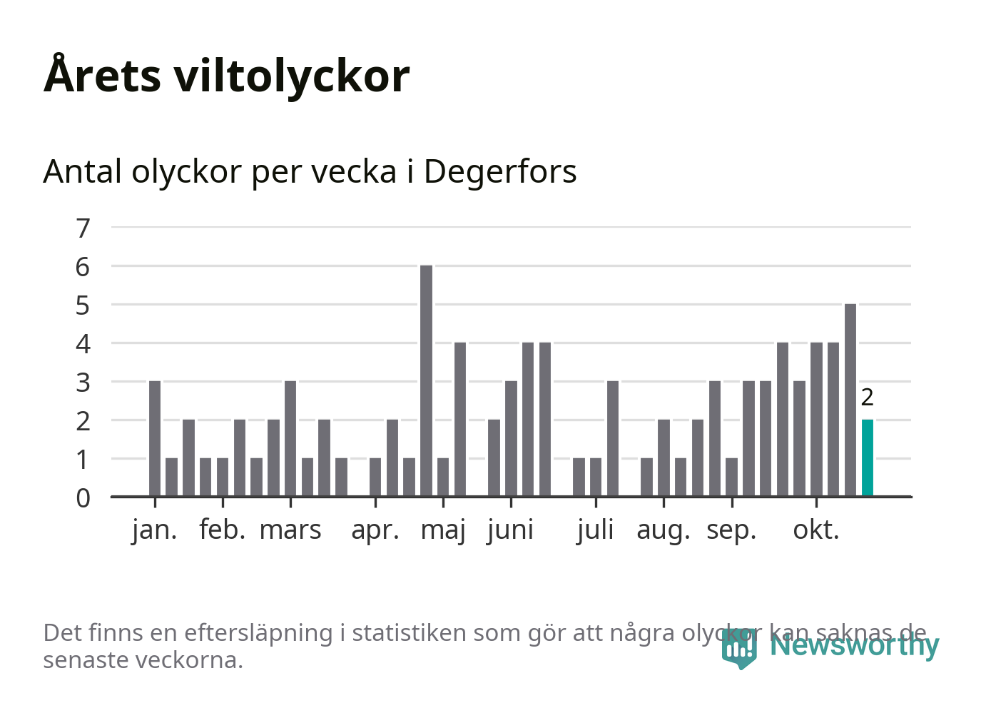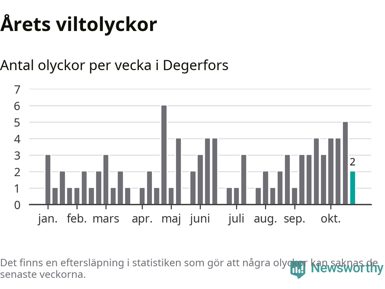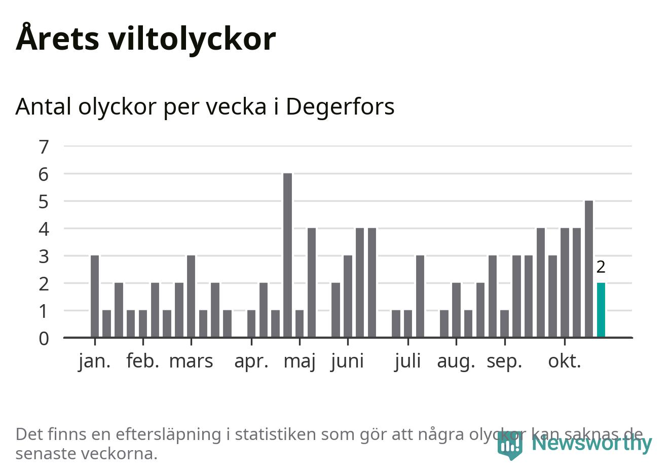 Hittills har två viltolyckor rapporterats in i Degerfors kommun från vecka 44. Se listan här.