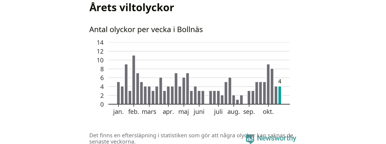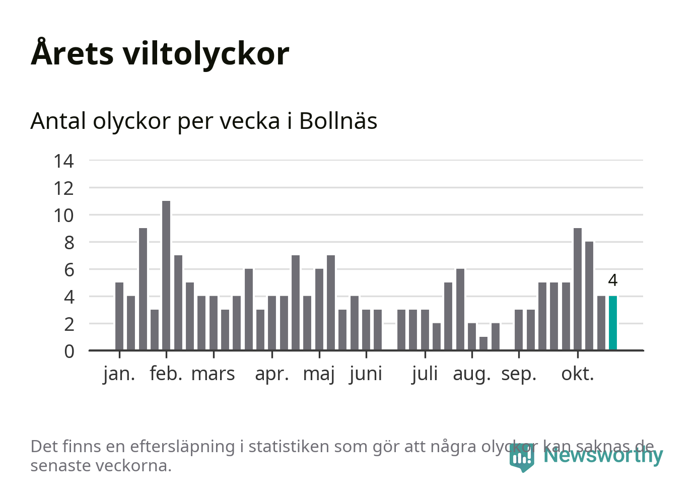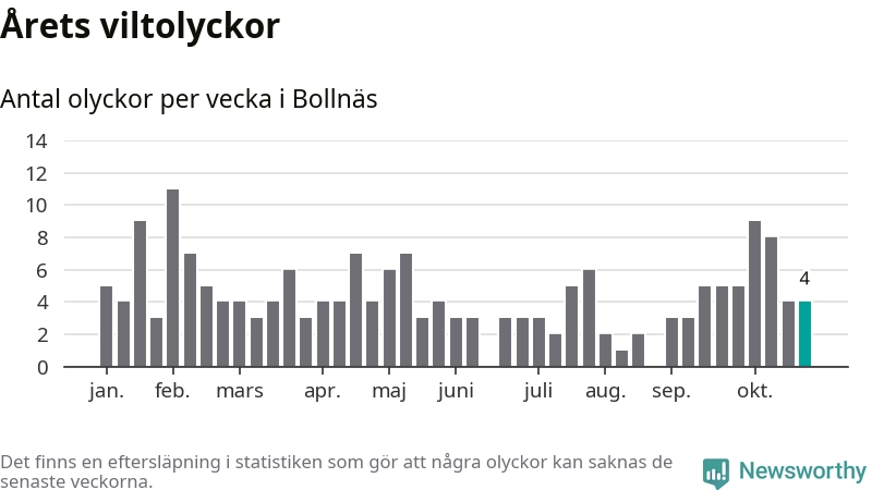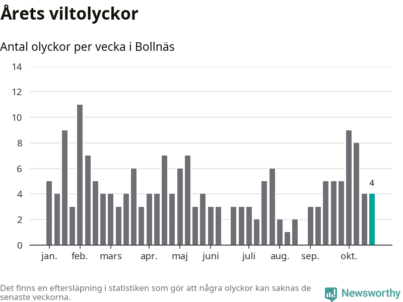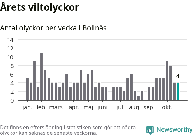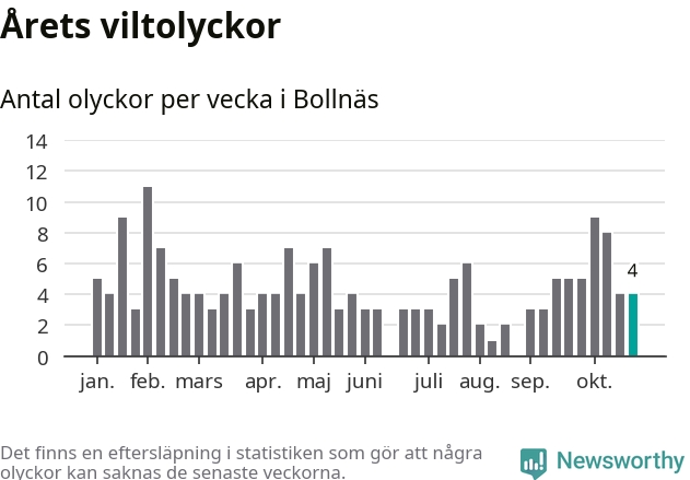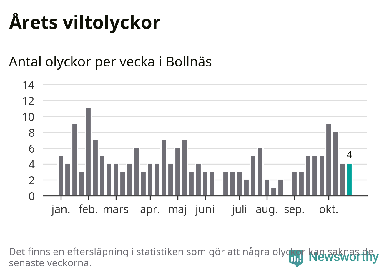 Hittills har fyra viltolyckor rapporterats in i Bollnäs kommun från vecka 44. Se listan här.