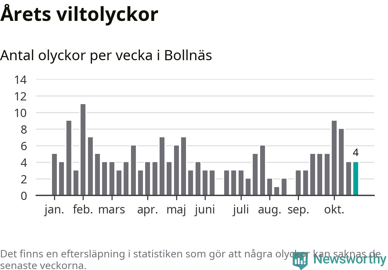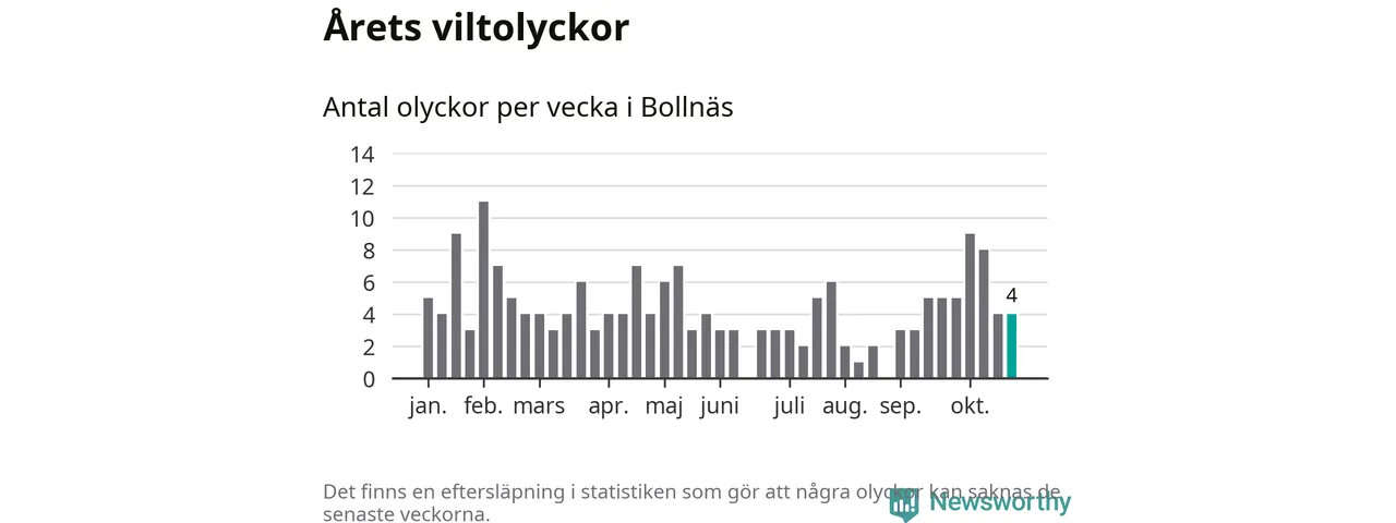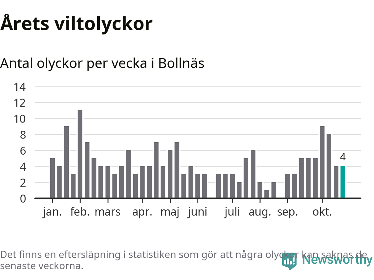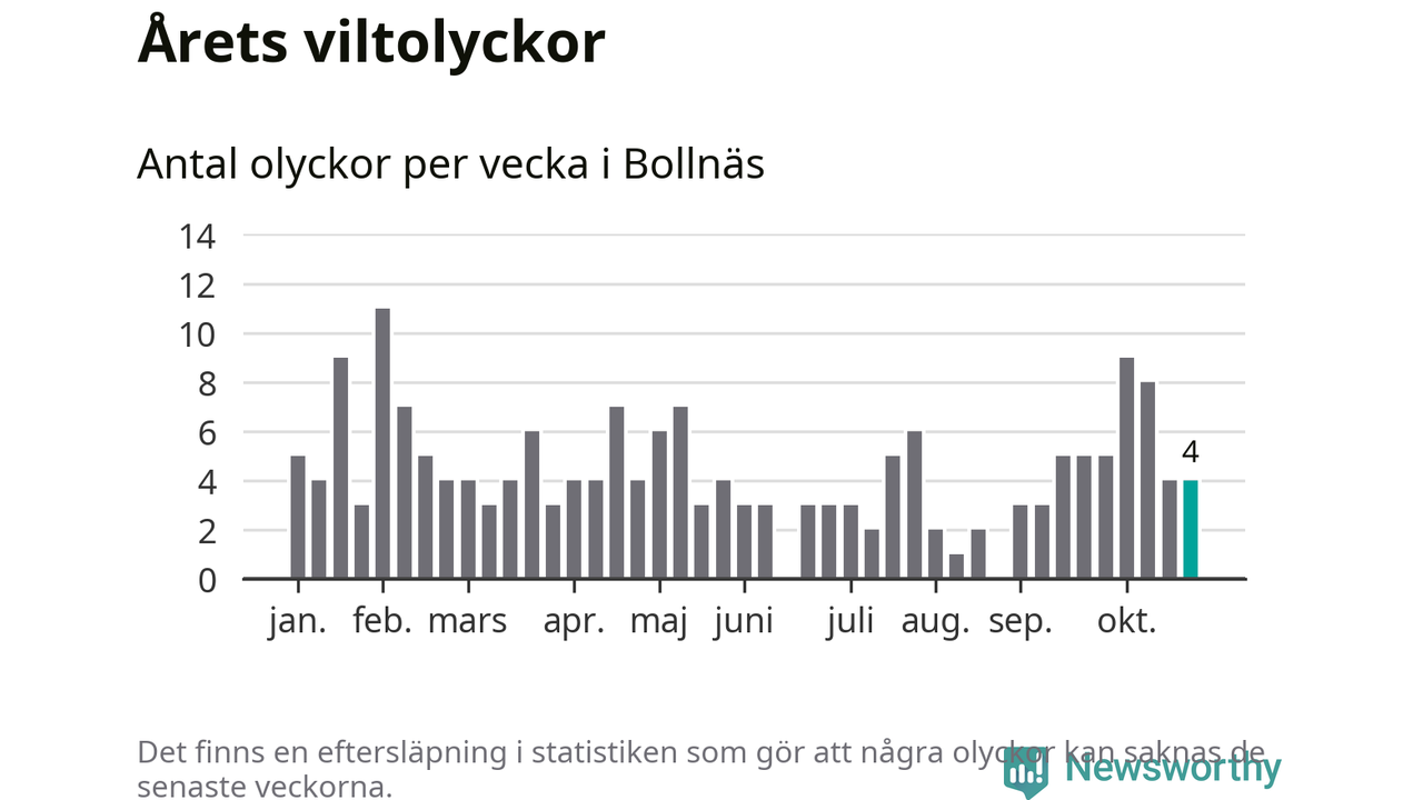 Hittills har fyra viltolyckor rapporterats in i Bollnäs kommun från vecka 44. Se listan här.