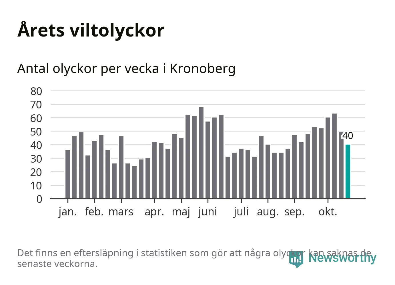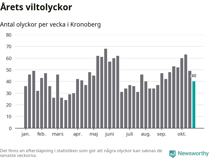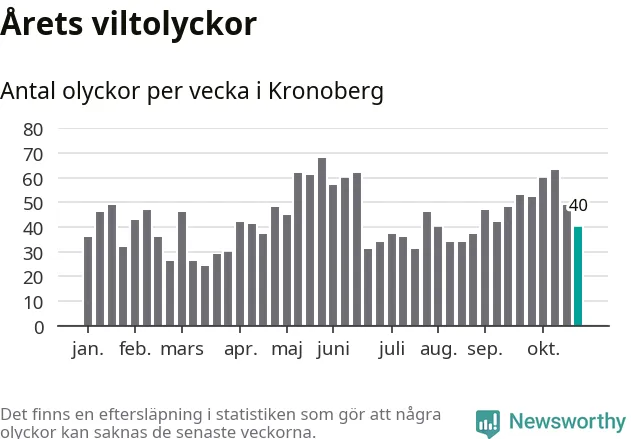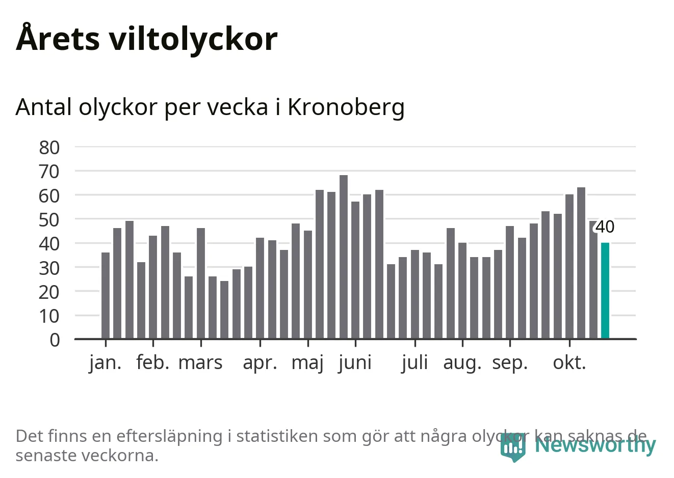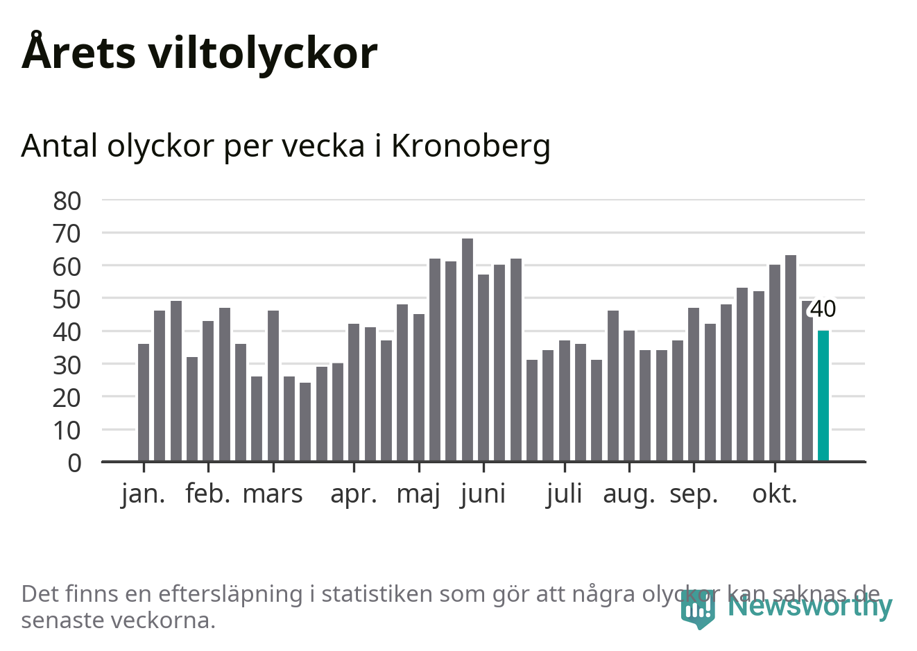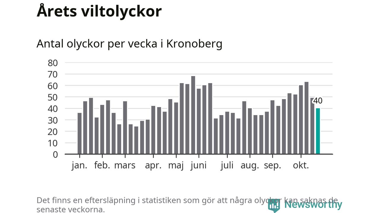 Hittills har 40 viltolyckor rapporterats in i Kronobergs län från vecka 44. Se listan här.
