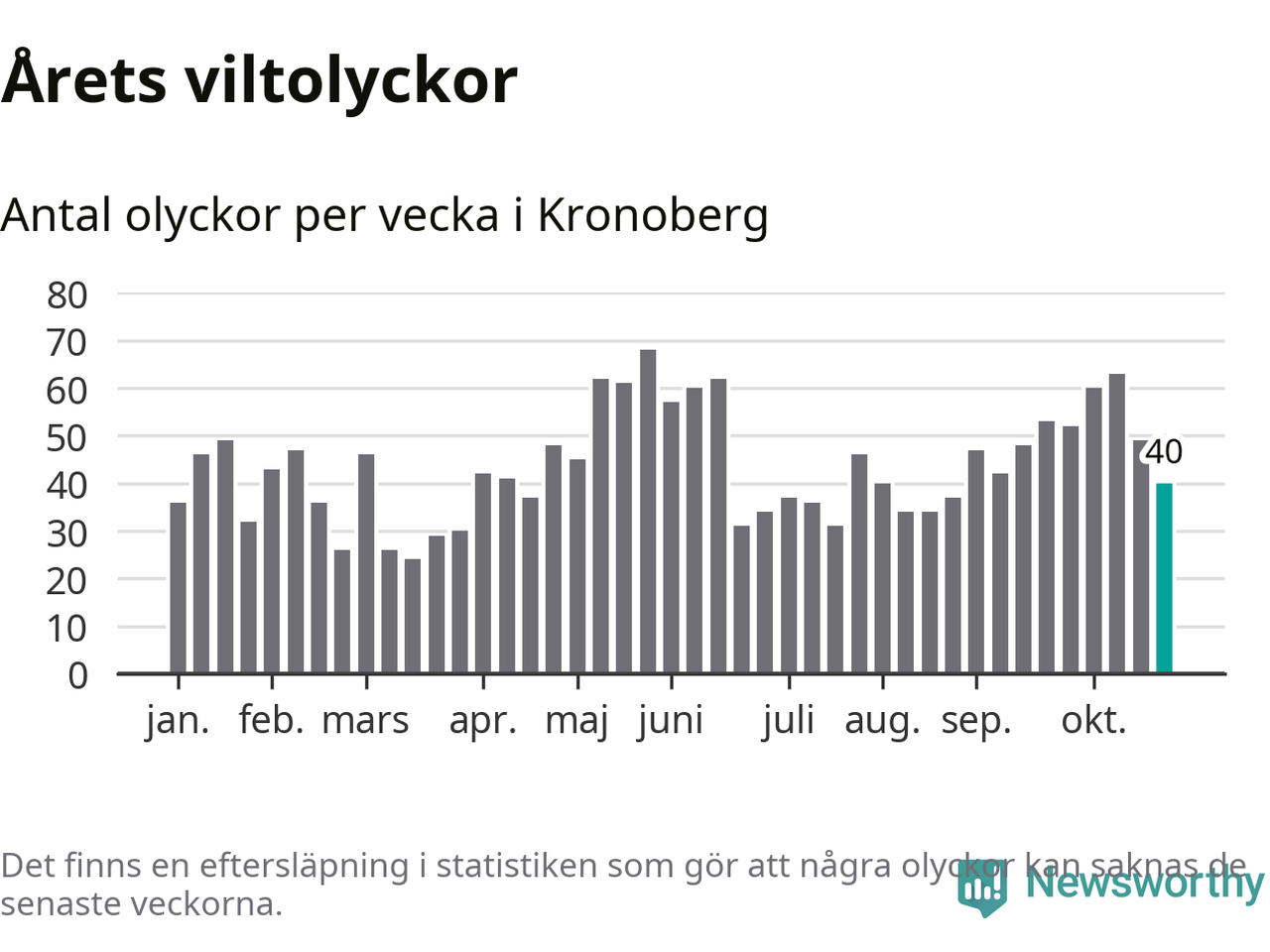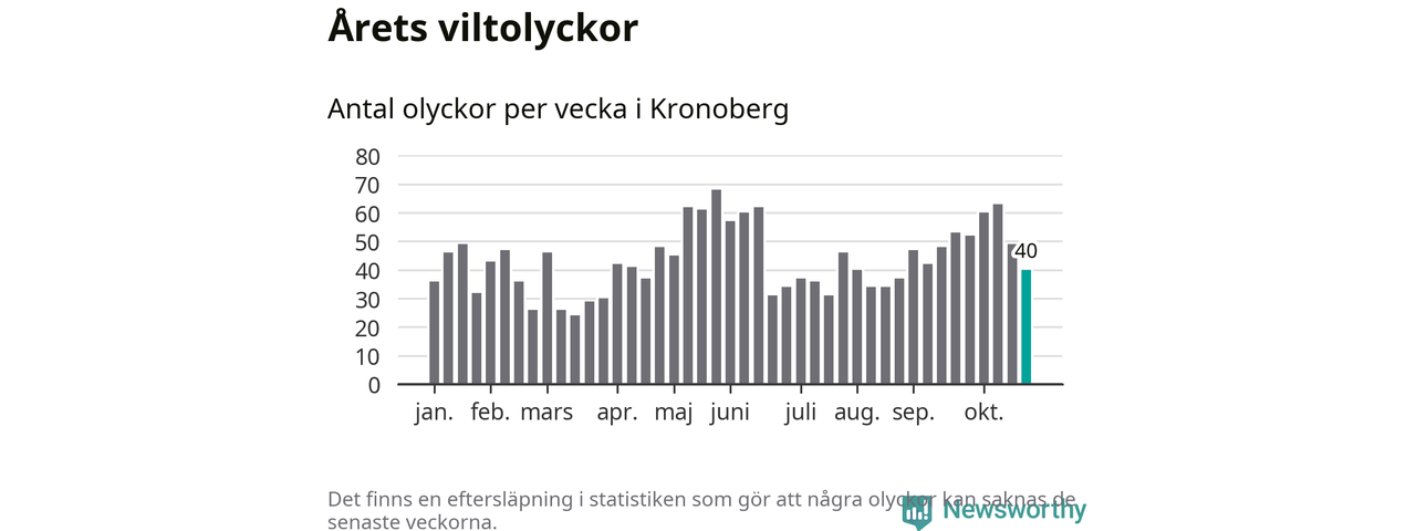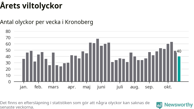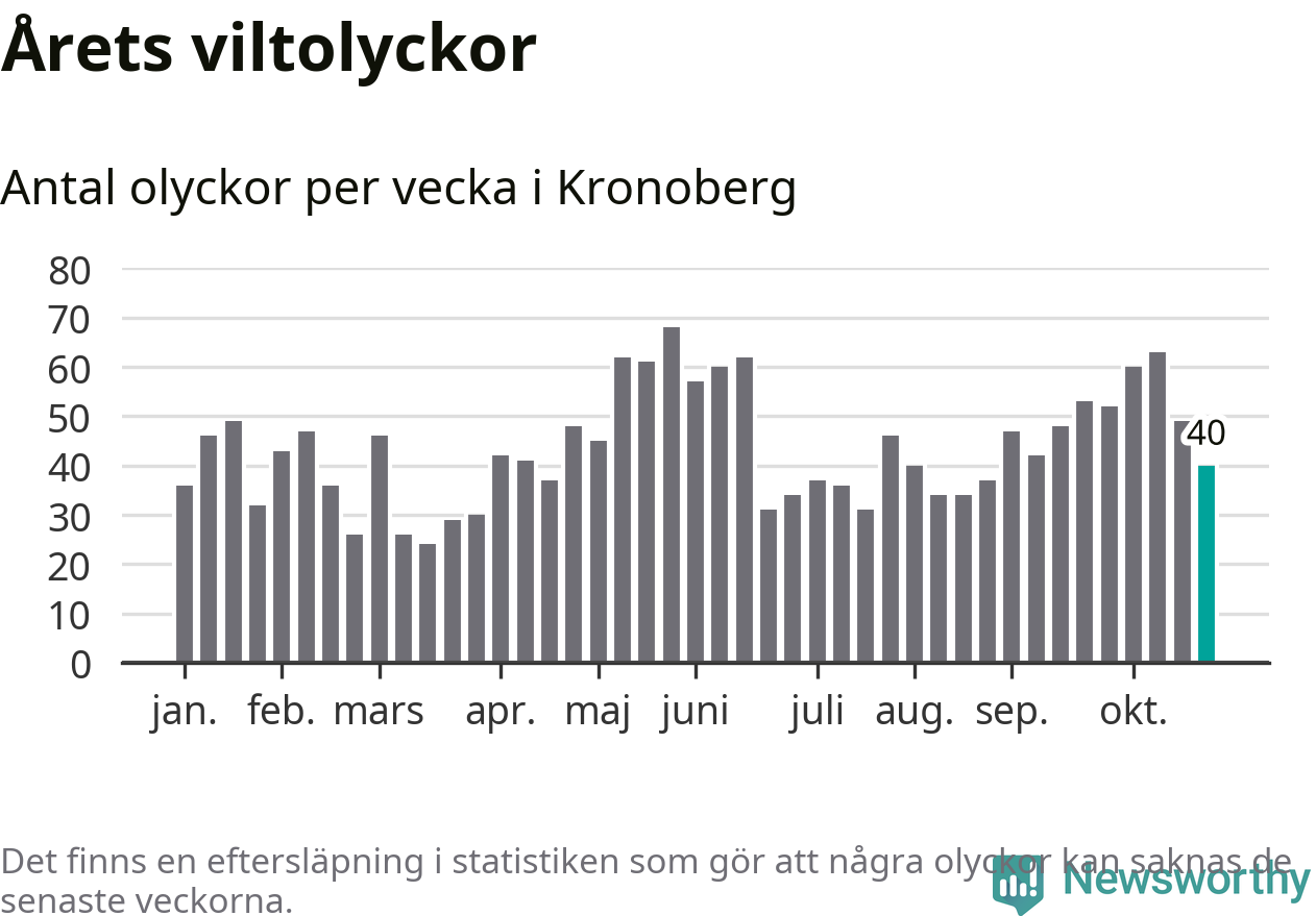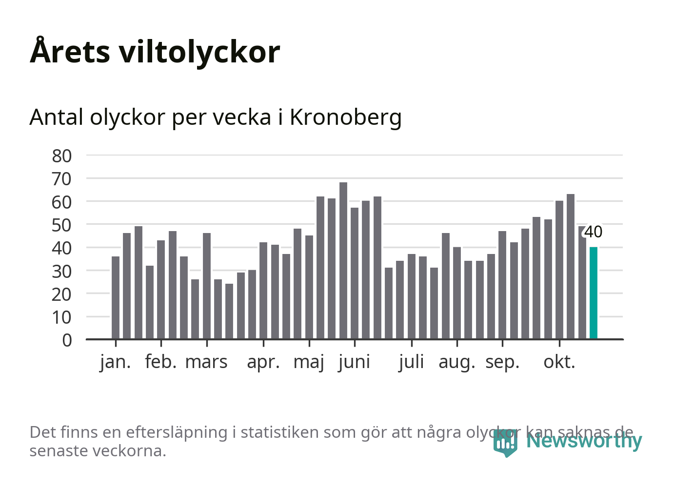 Hittills har 40 viltolyckor rapporterats in i Kronobergs län från vecka 44. Se listan här.
