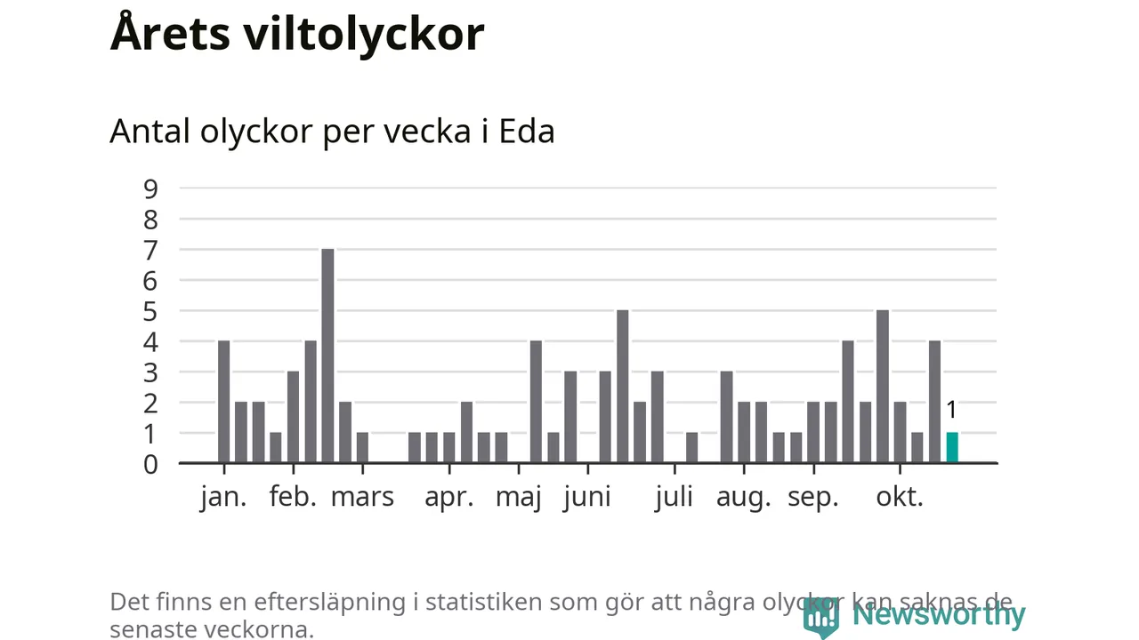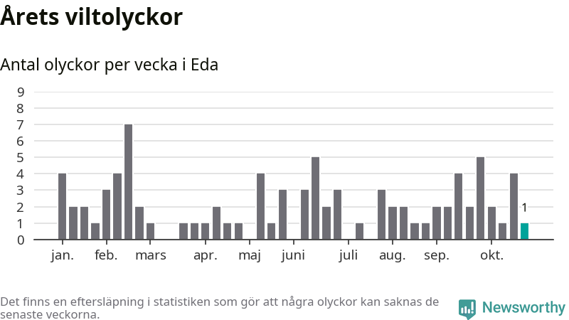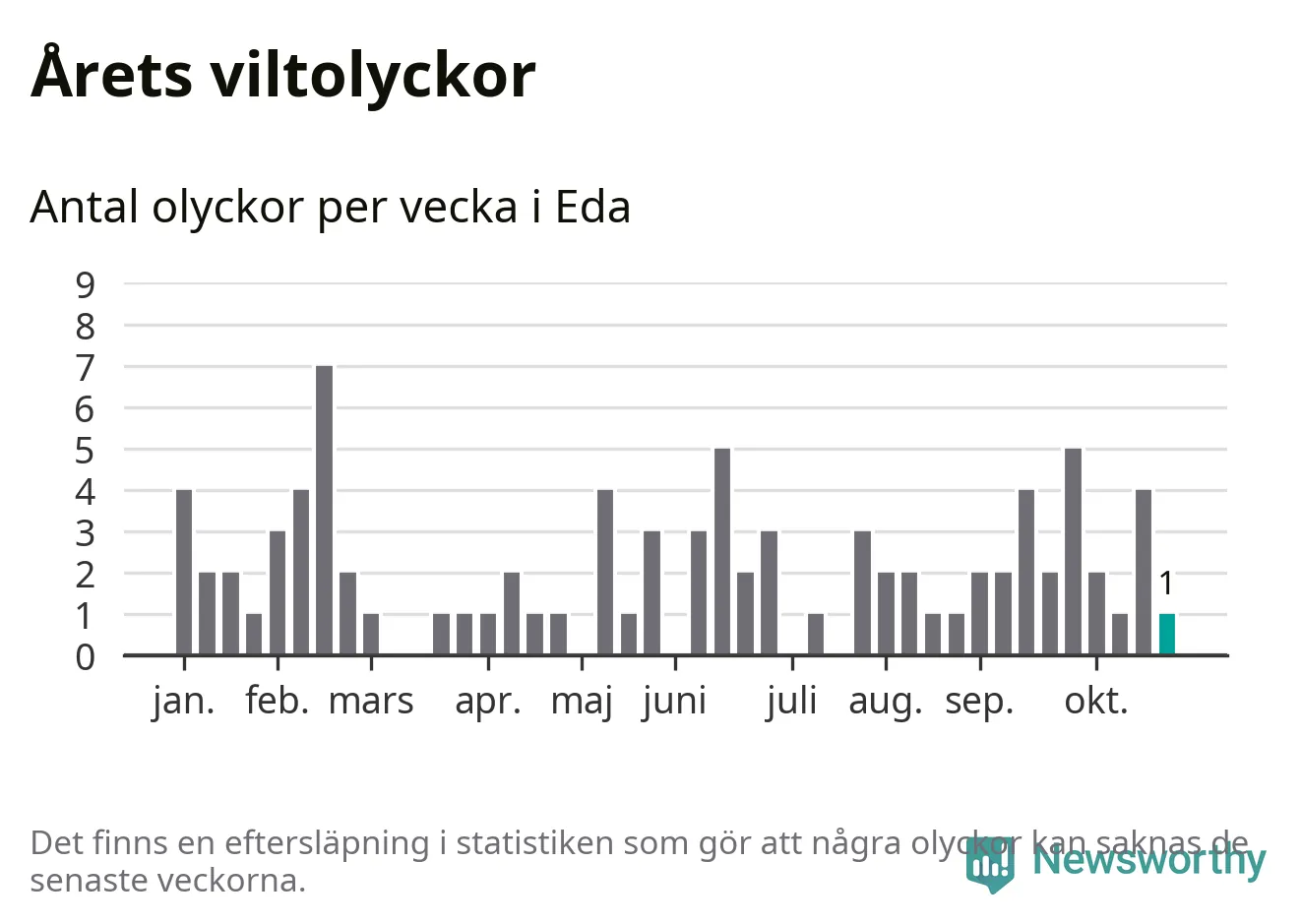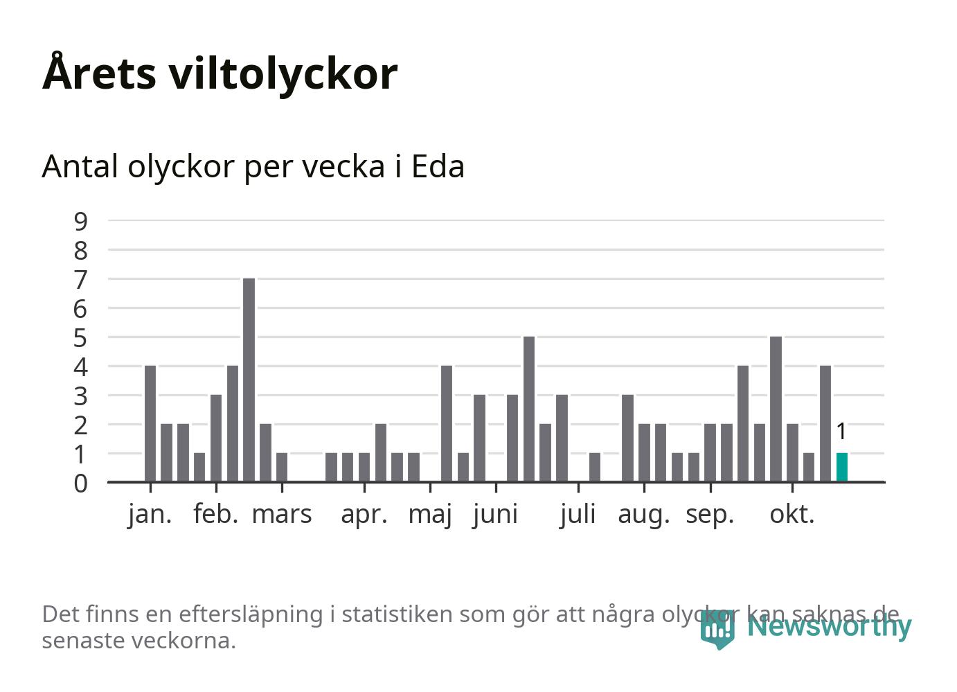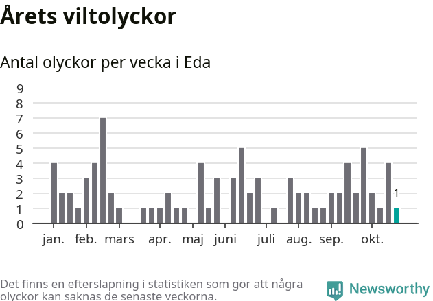 Från förra veckan (vecka 44) har hittills en viltolycka rapporterats in i Eda kommun.