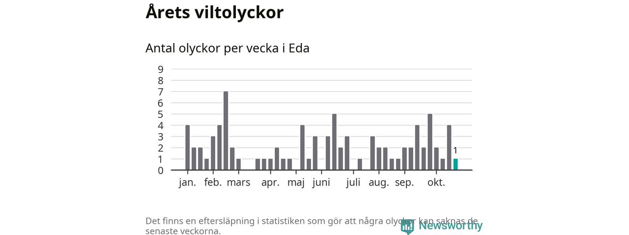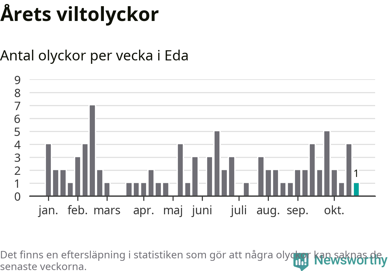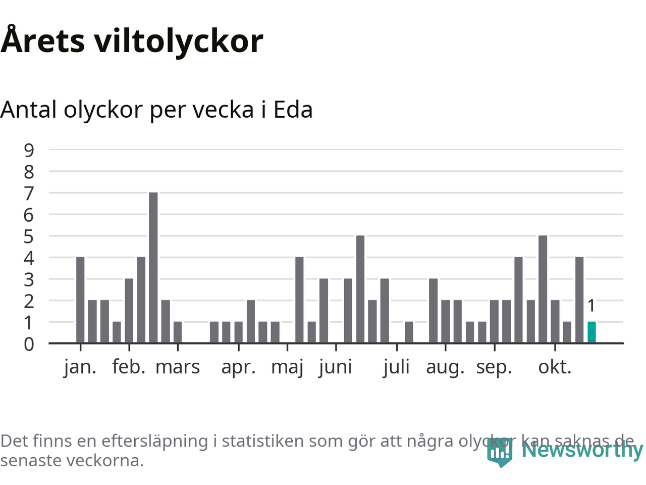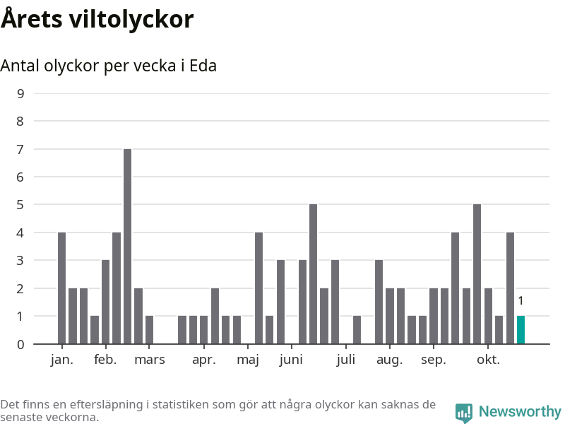 Från förra veckan (vecka 44) har hittills en viltolycka rapporterats in i Eda kommun.