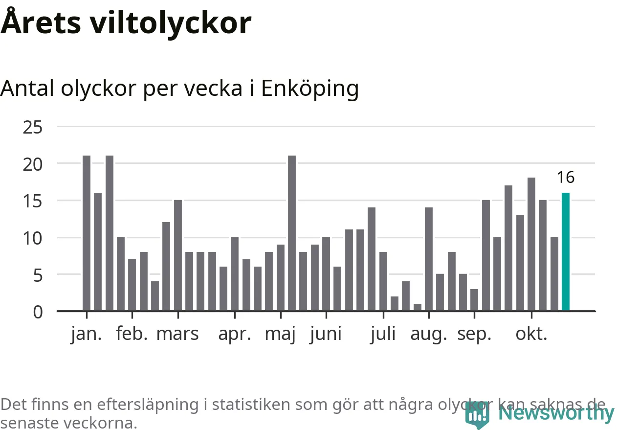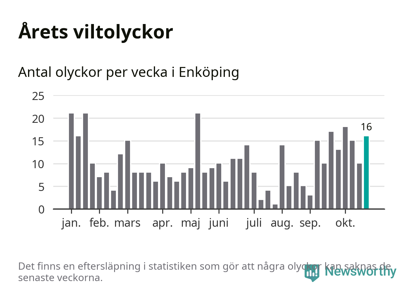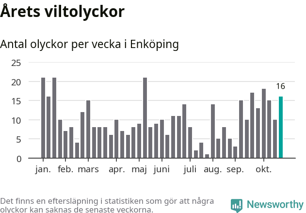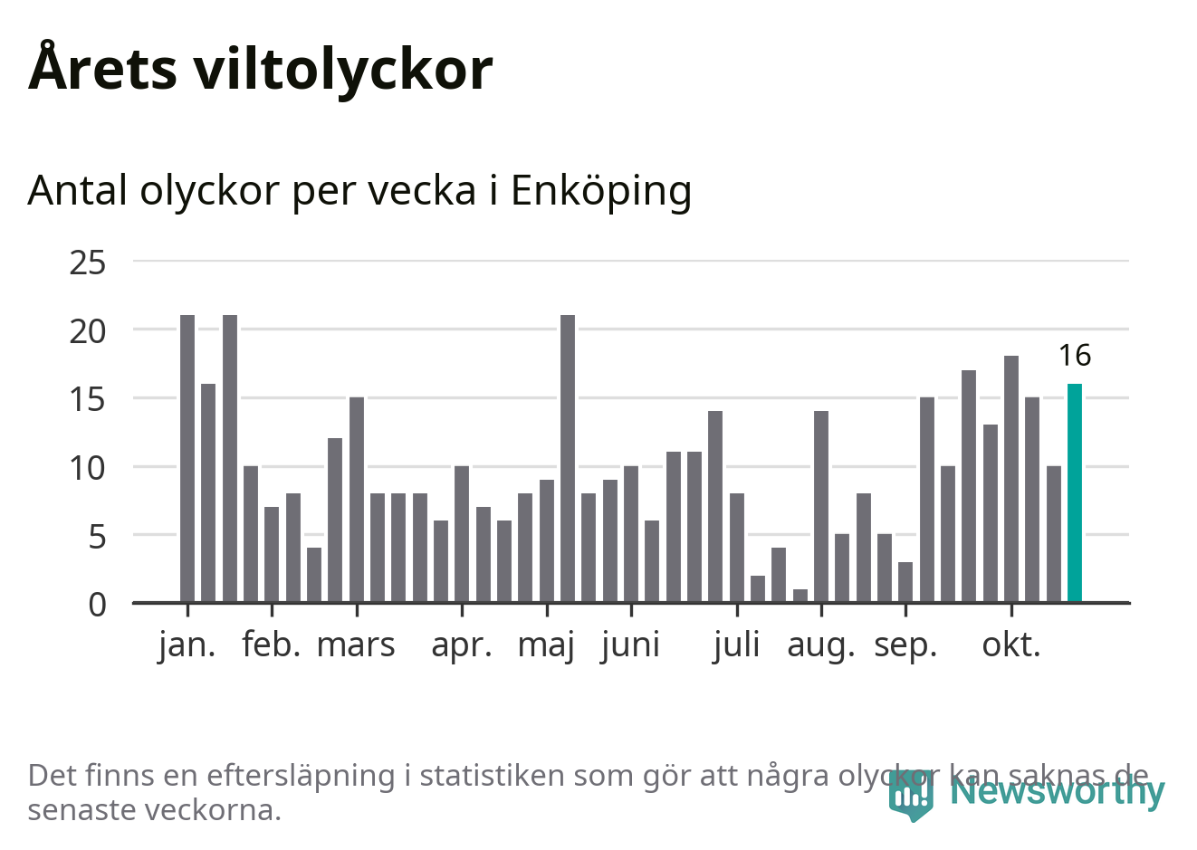 Hittills har 16 viltolyckor rapporterats in i Enköpings kommun från vecka 44. Se listan här.