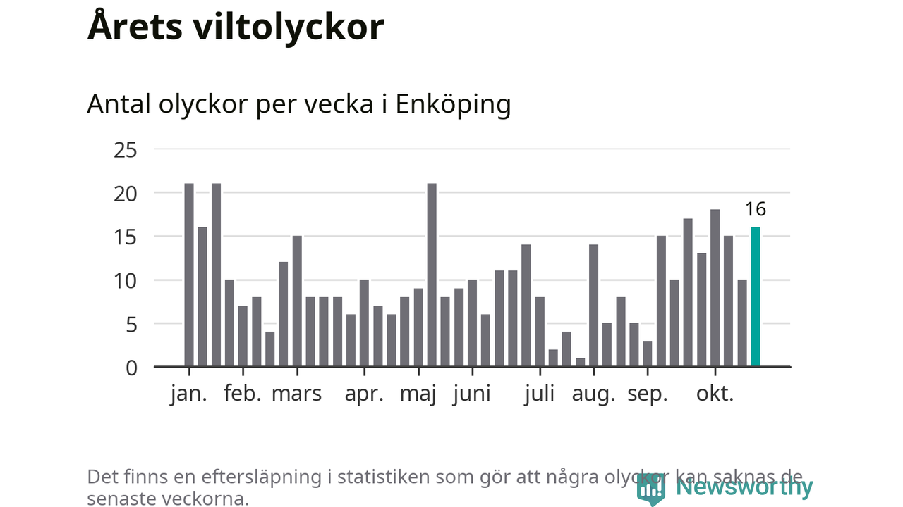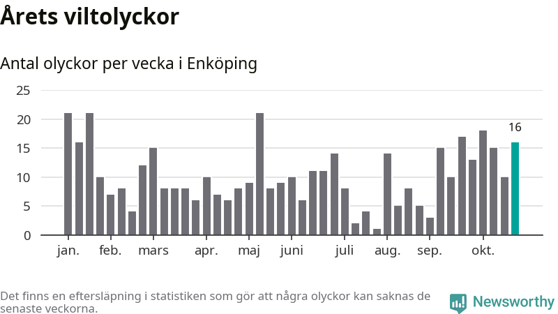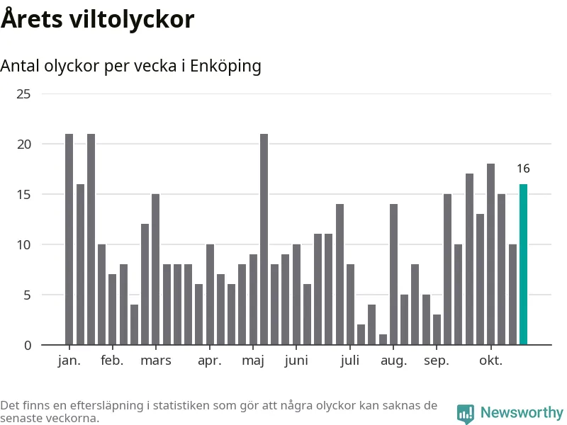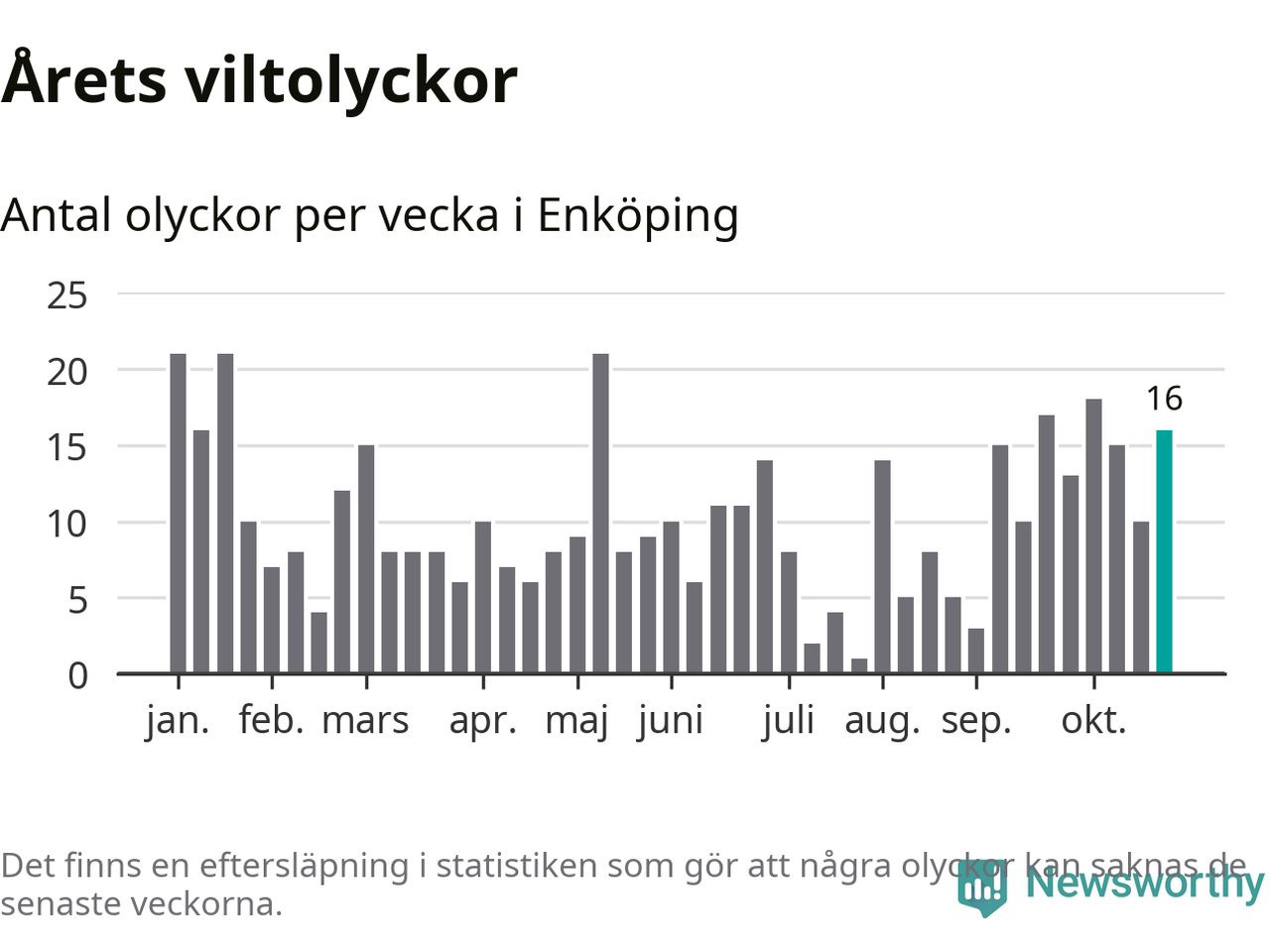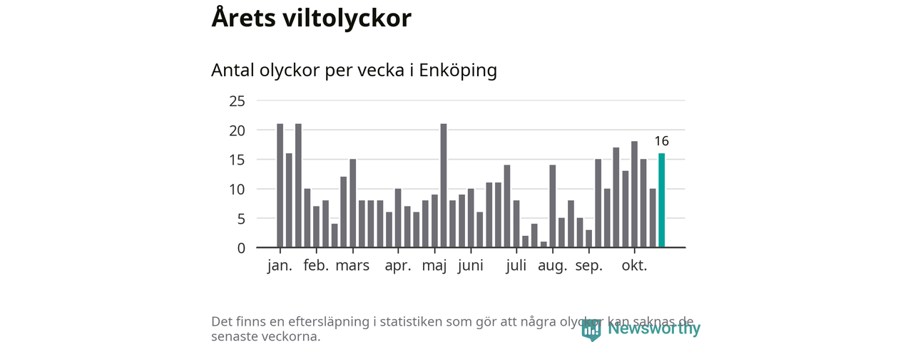 Hittills har 16 viltolyckor rapporterats in i Enköpings kommun från vecka 44. Se listan här.