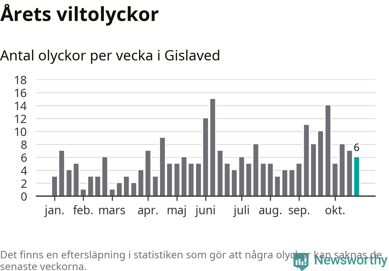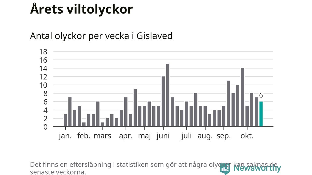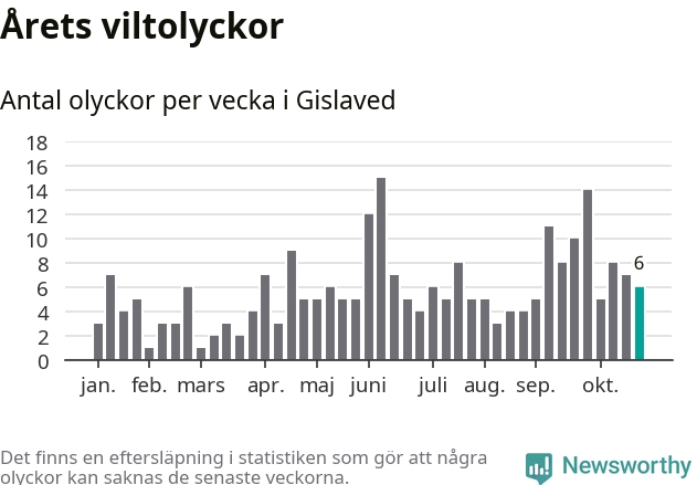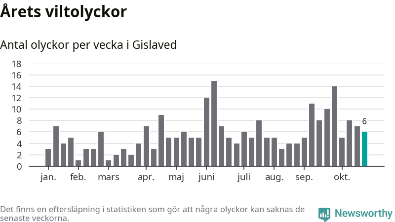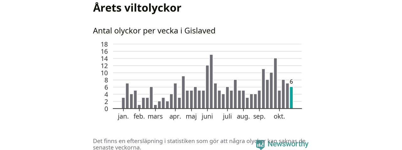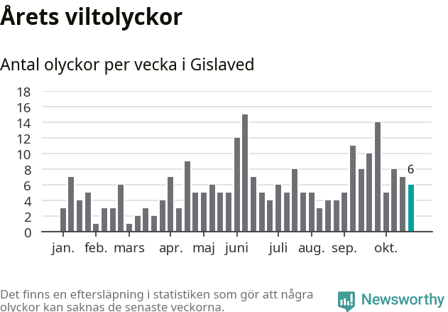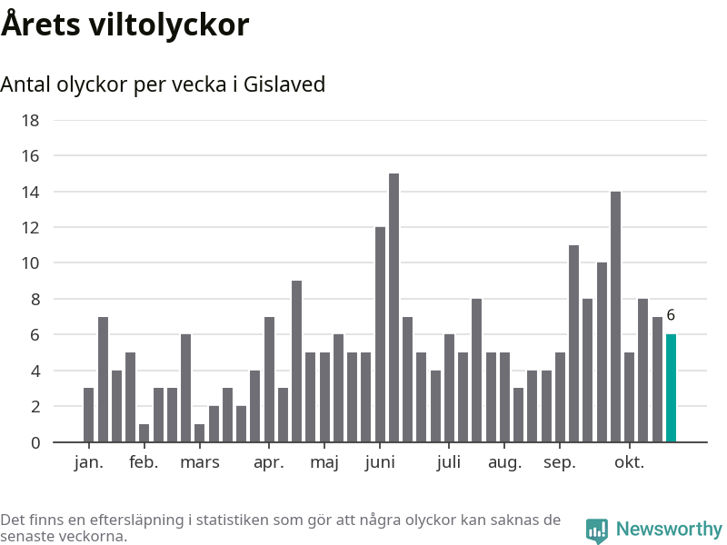 Hittills har sex viltolyckor rapporterats in i Gislaveds kommun från vecka 44. Se listan här.