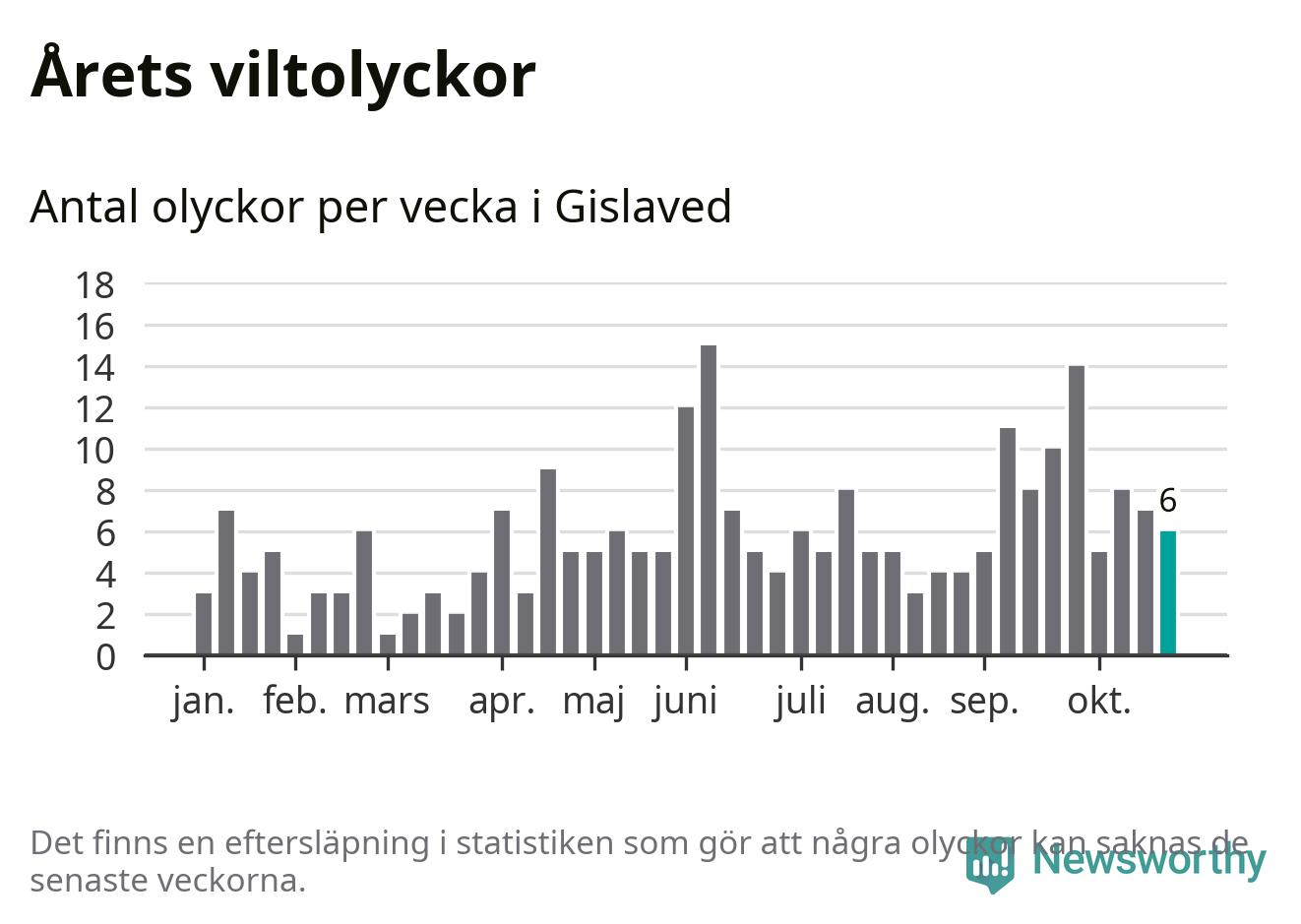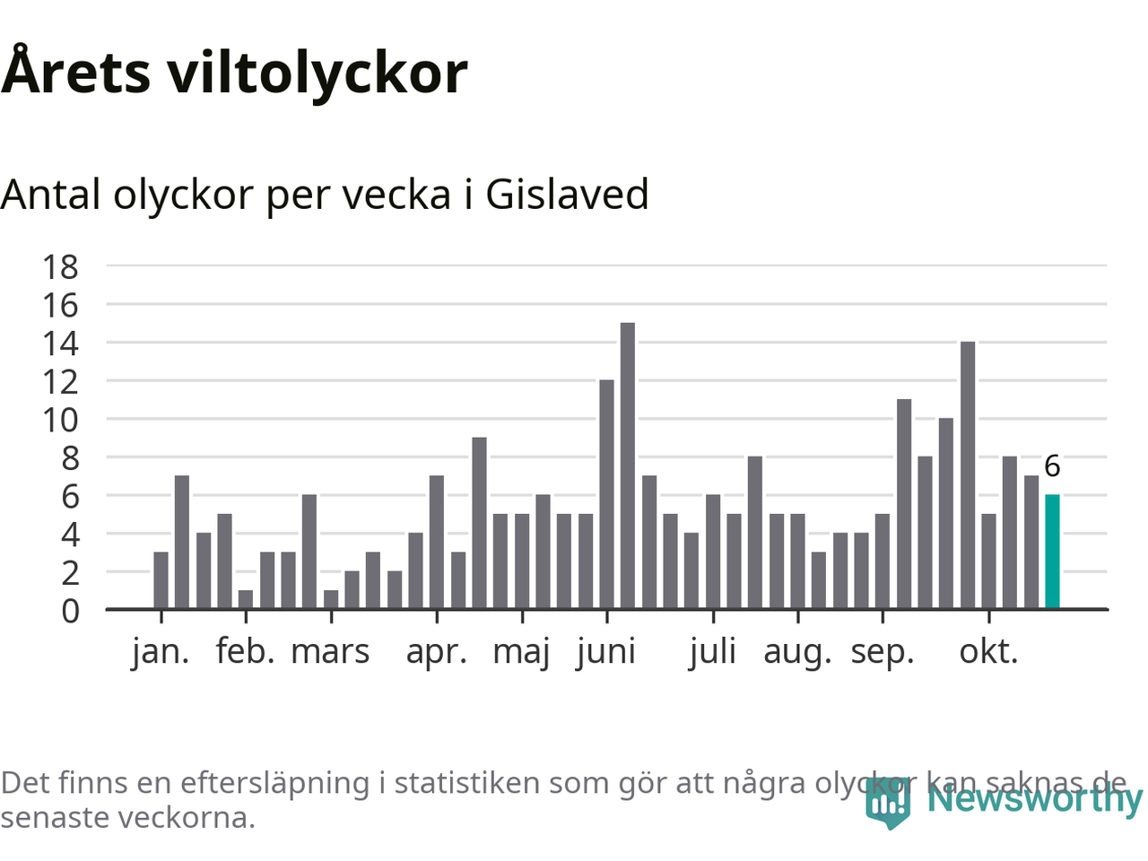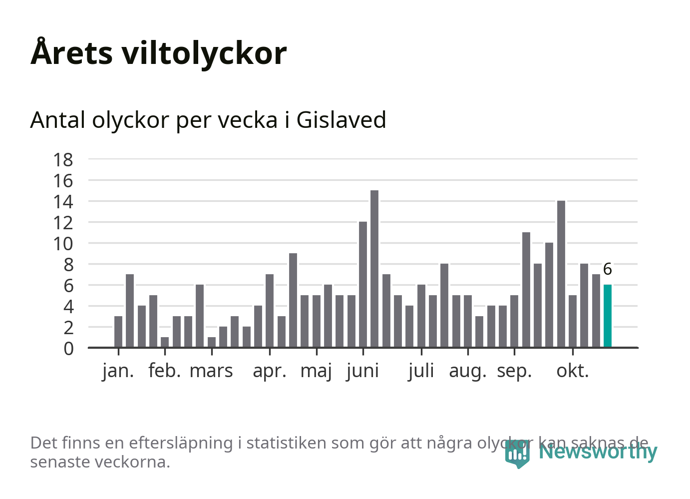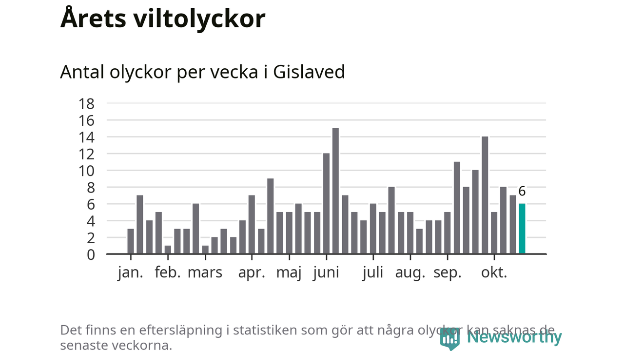 Hittills har sex viltolyckor rapporterats in i Gislaveds kommun från vecka 44. Se listan här.