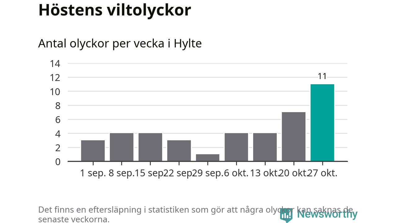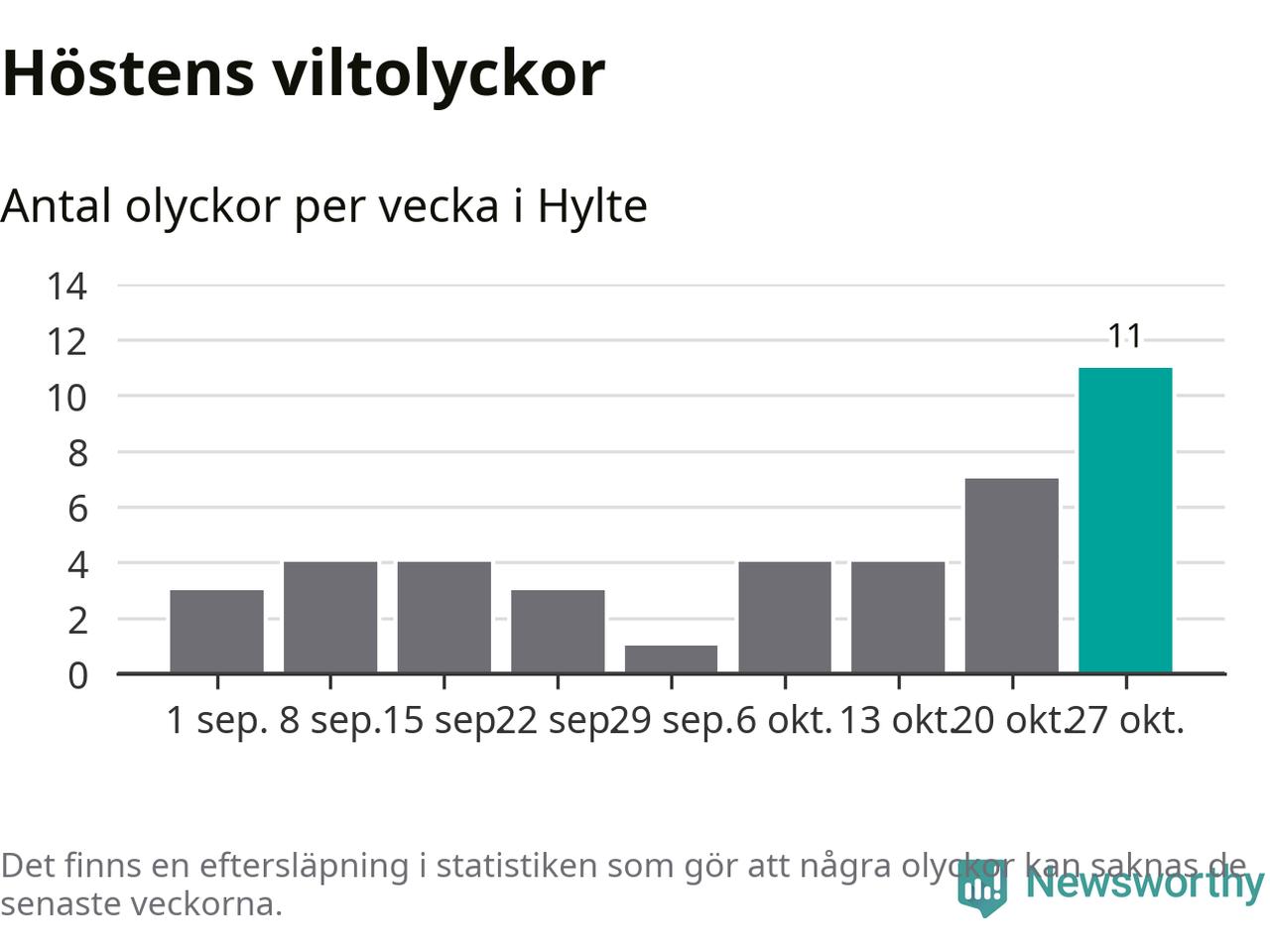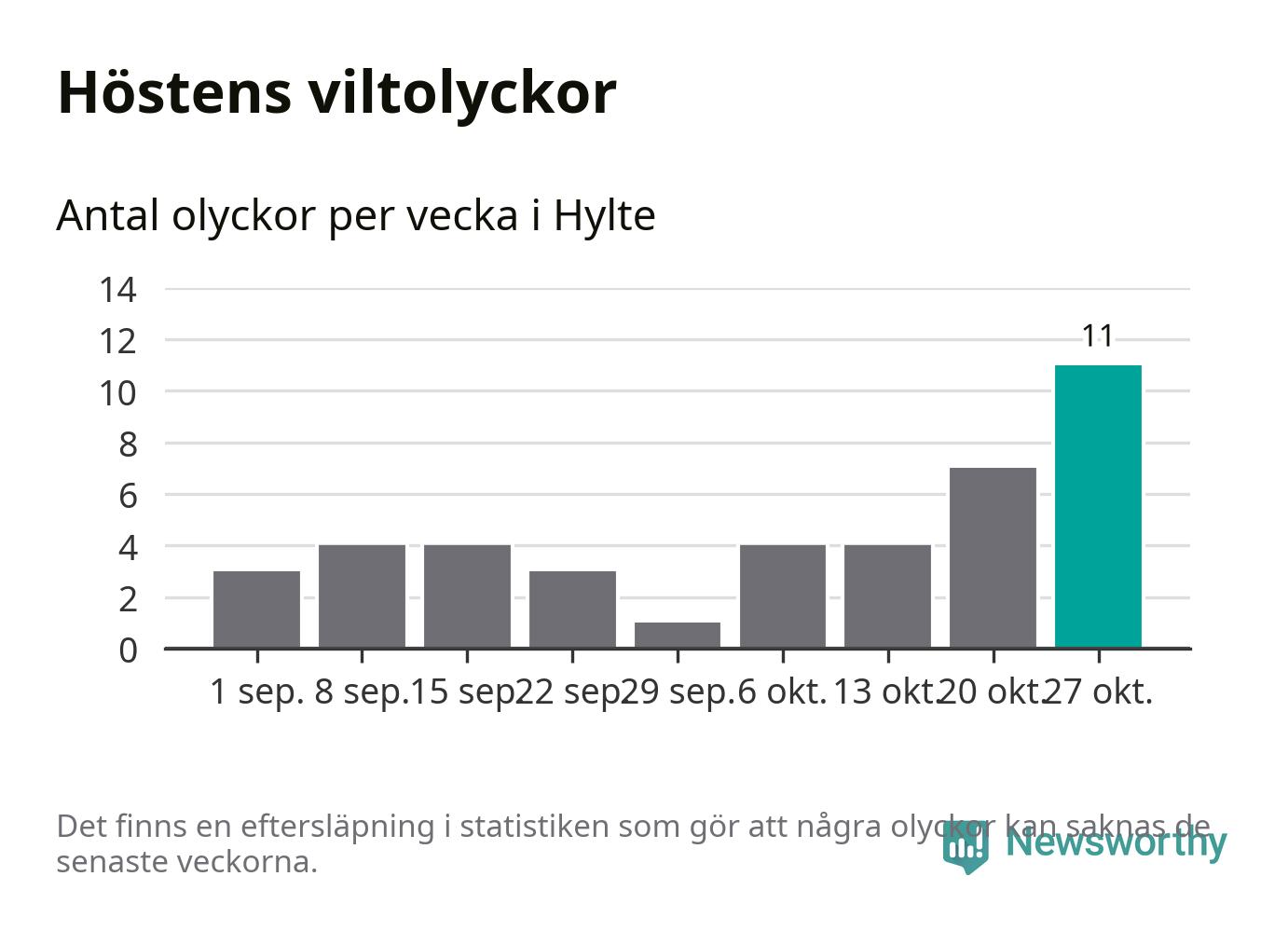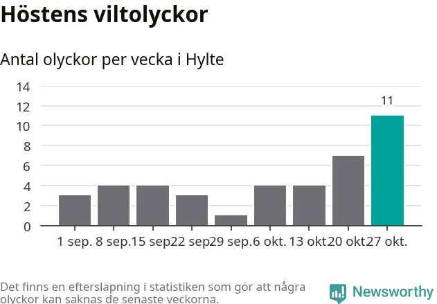 Hittills har elva viltolyckor rapporterats in i Hylte kommun från vecka 44. Det är en av de högsta höstsiffrorna för en enskild vecka på över tio år.