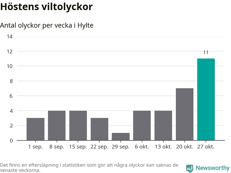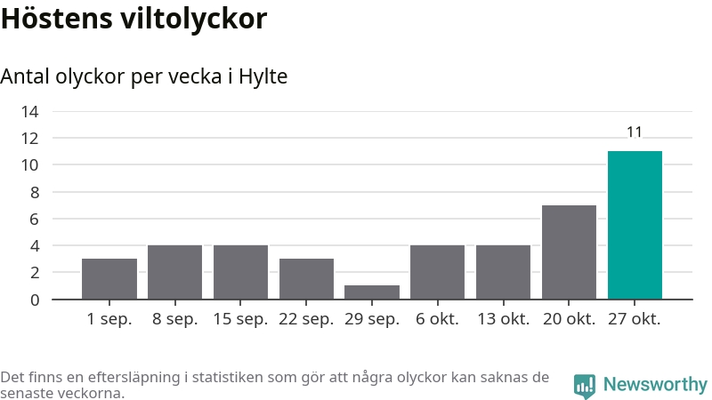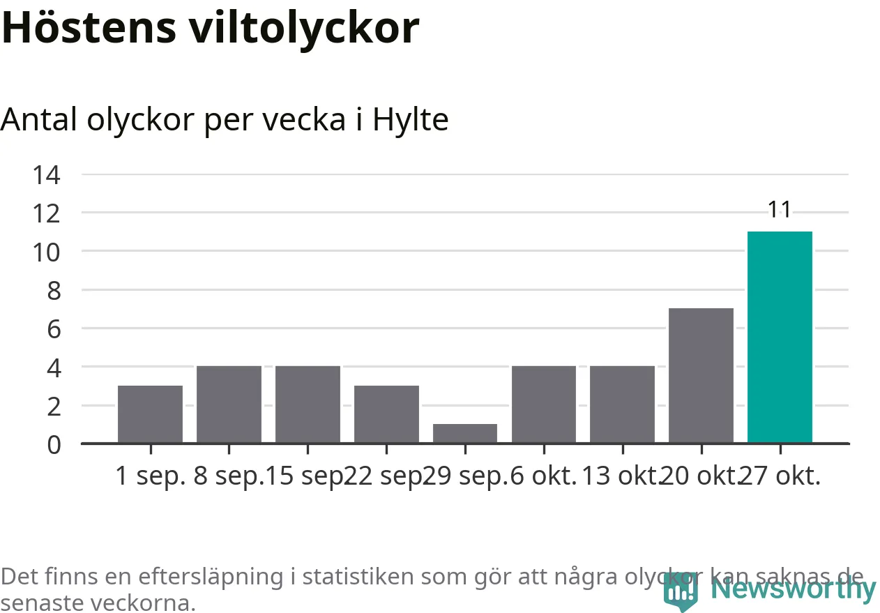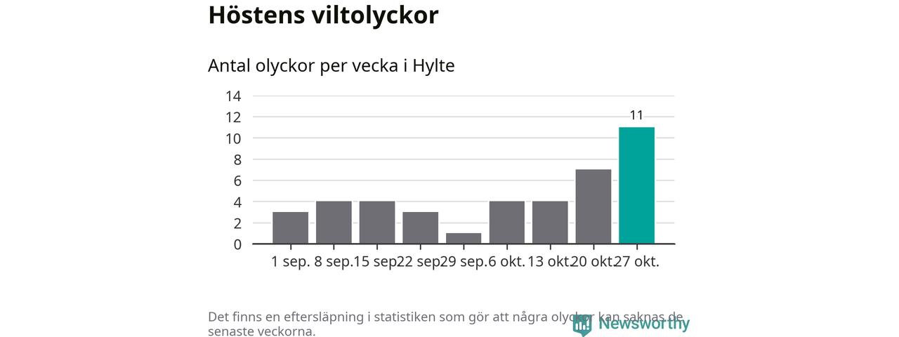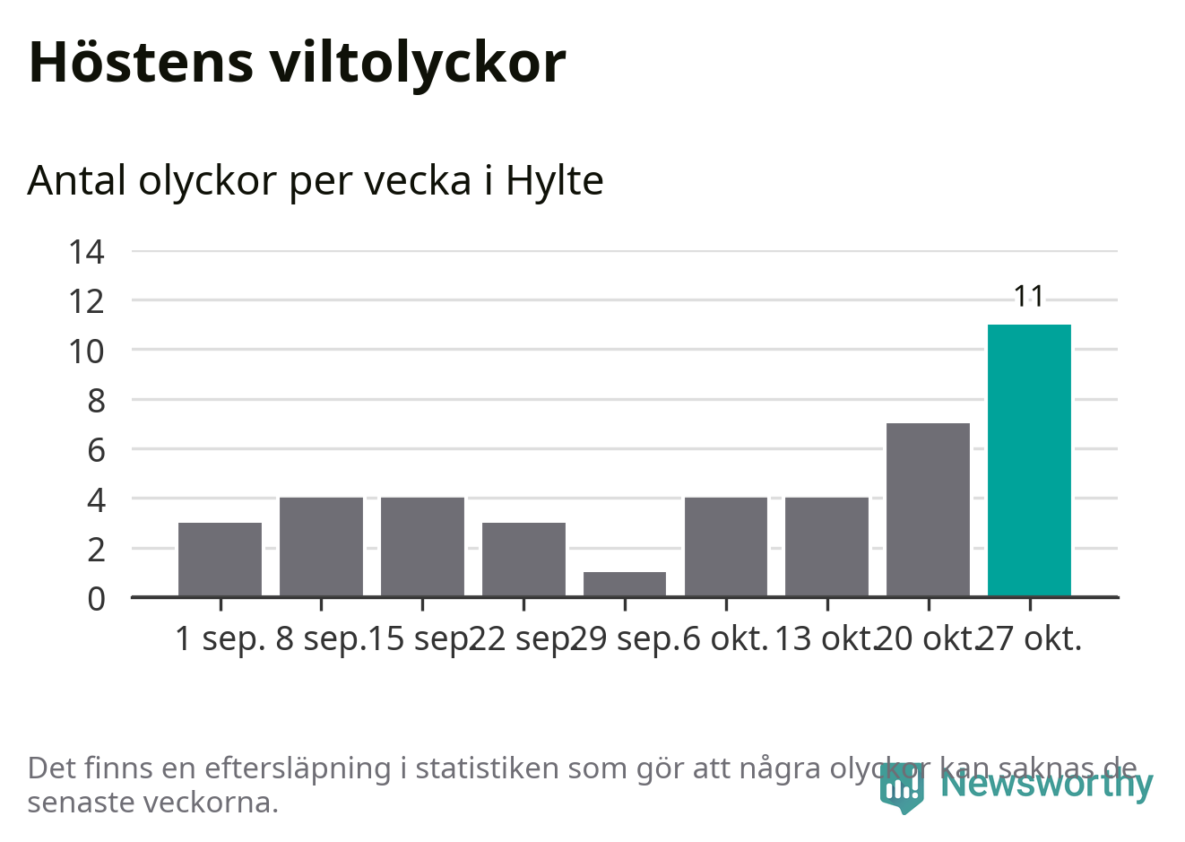 Hittills har elva viltolyckor rapporterats in i Hylte kommun från vecka 44. Det är en av de högsta höstsiffrorna för en enskild vecka på över tio år.